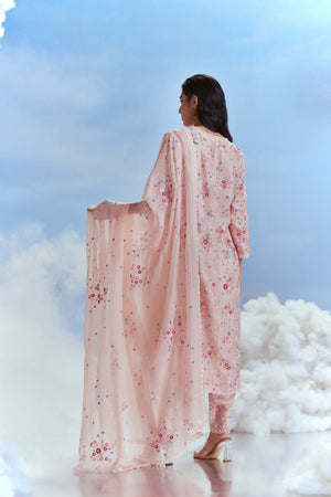 • Izmir carnations straight cut kurta with encrusted hem palazzos and dupatta