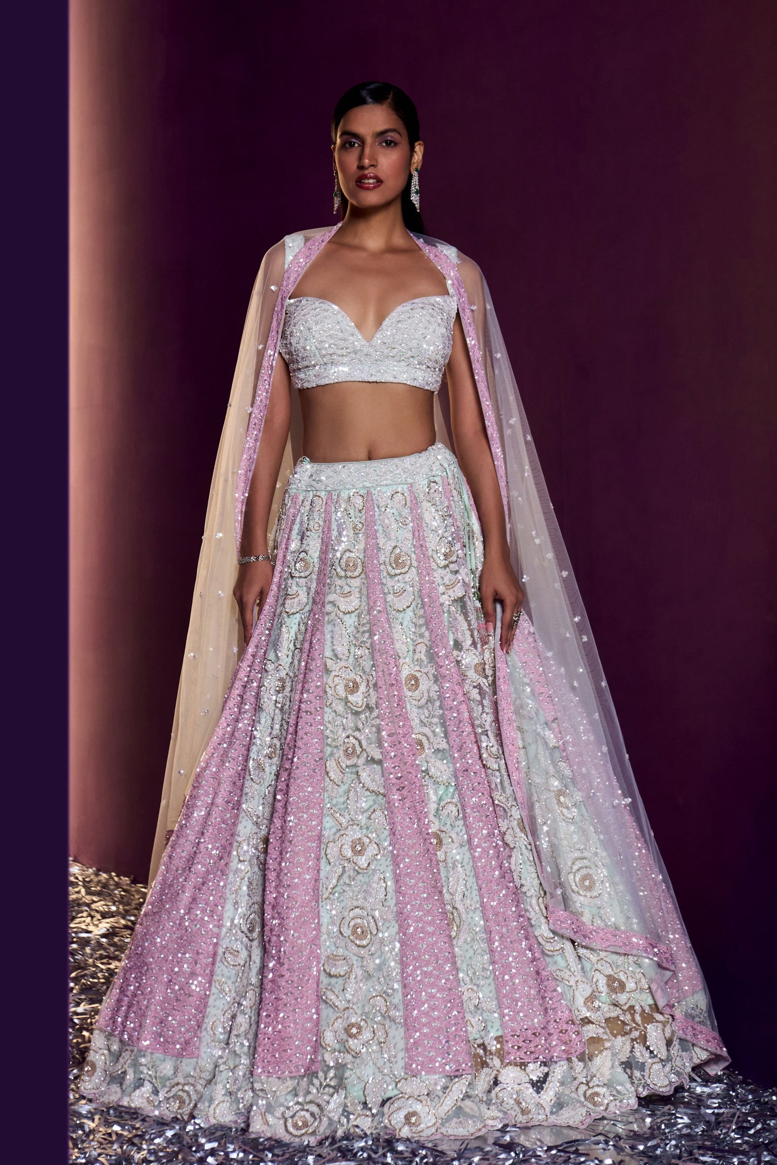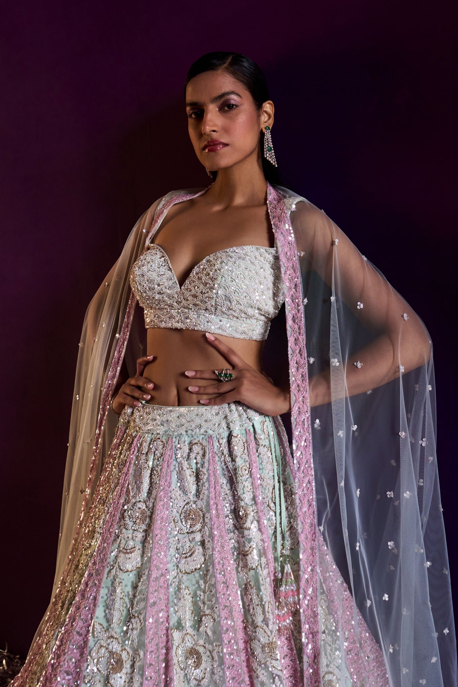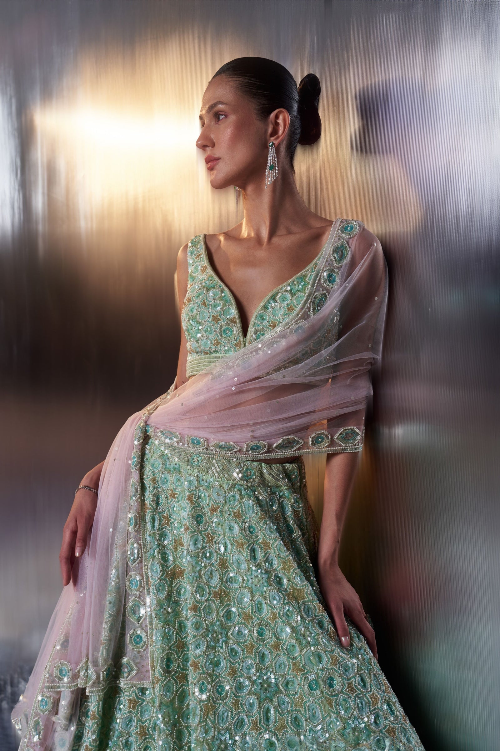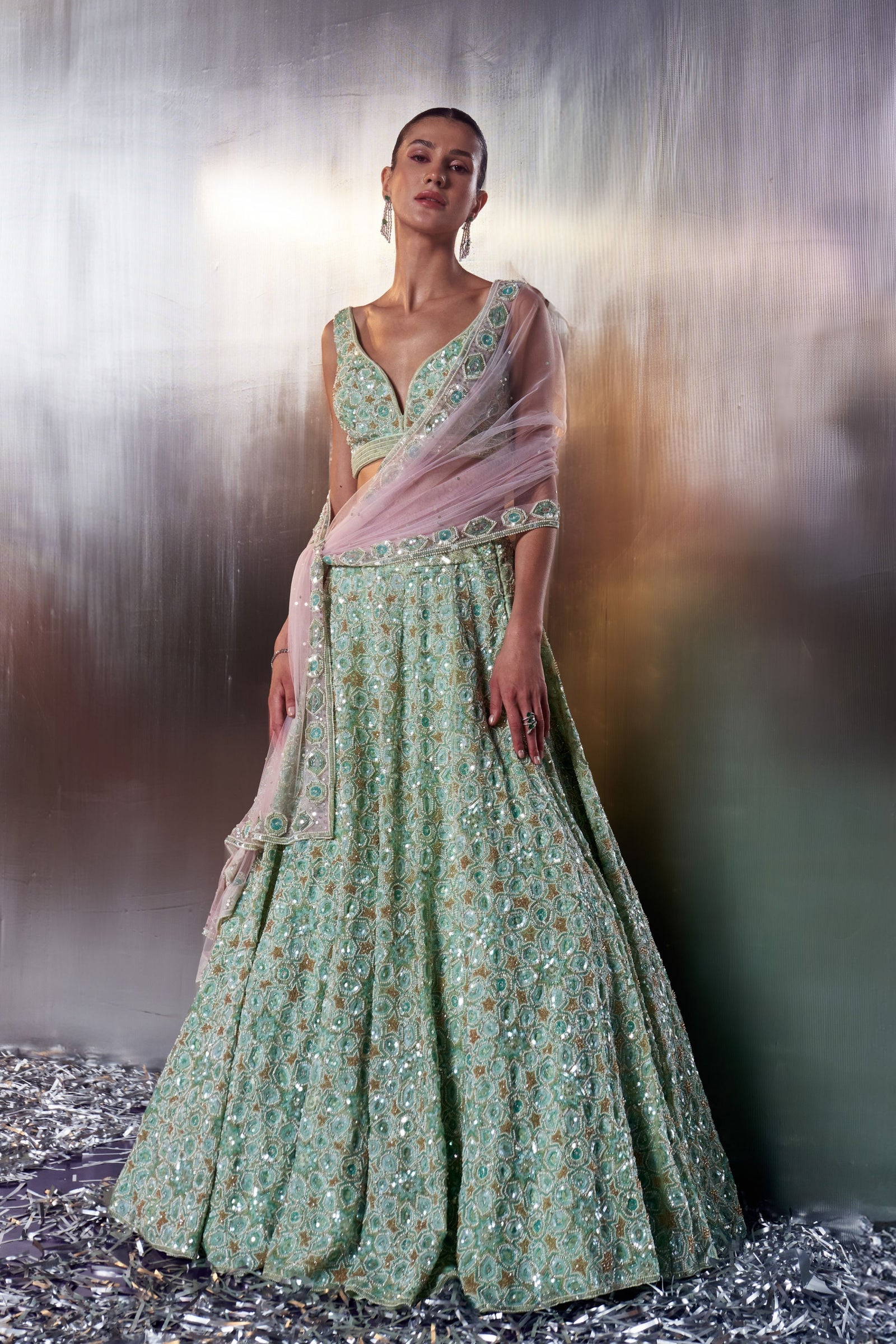 • A Green choga set paired with green tissu dupatta embroidered with kasab and tilla highlighted with mirror and gotta patti.