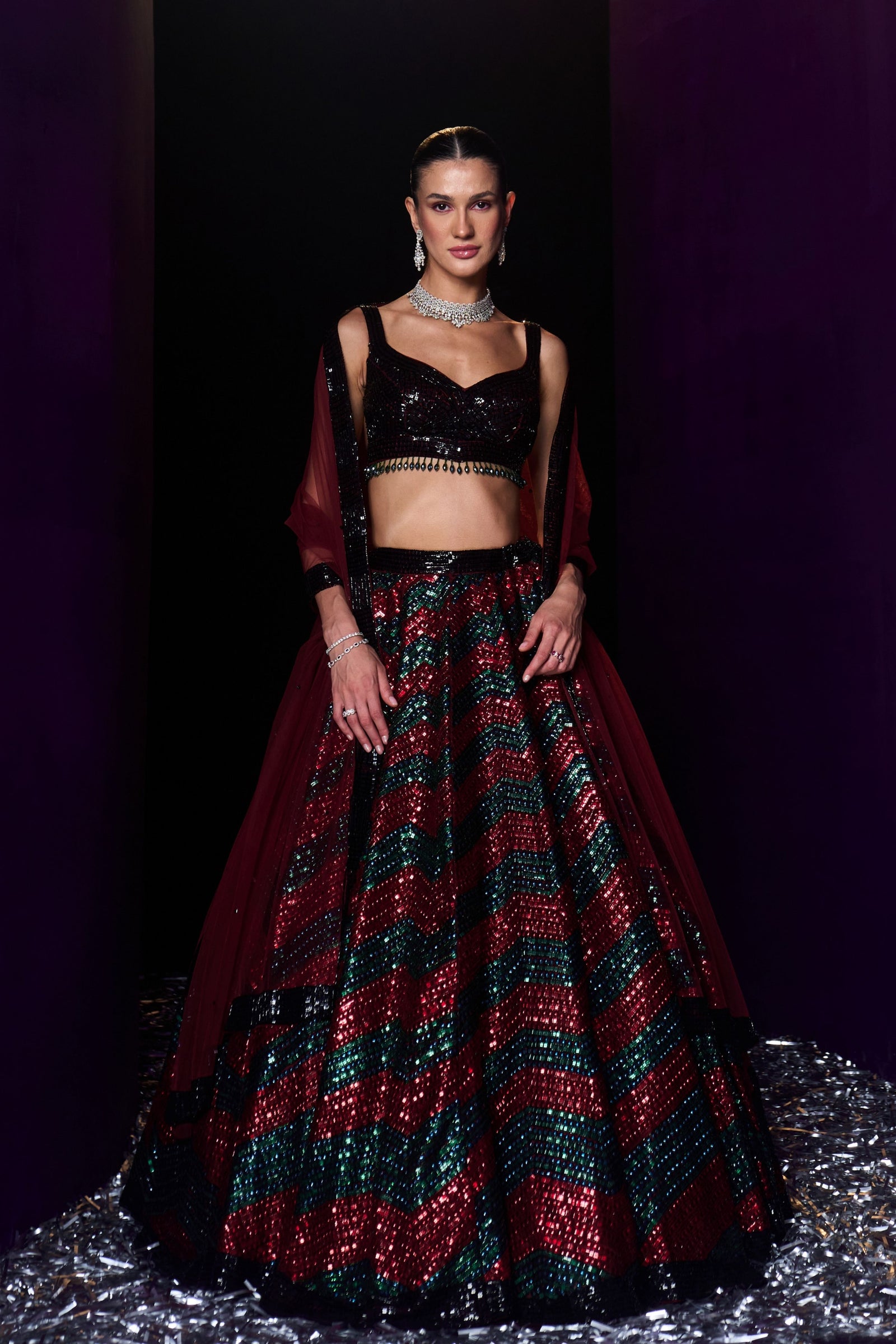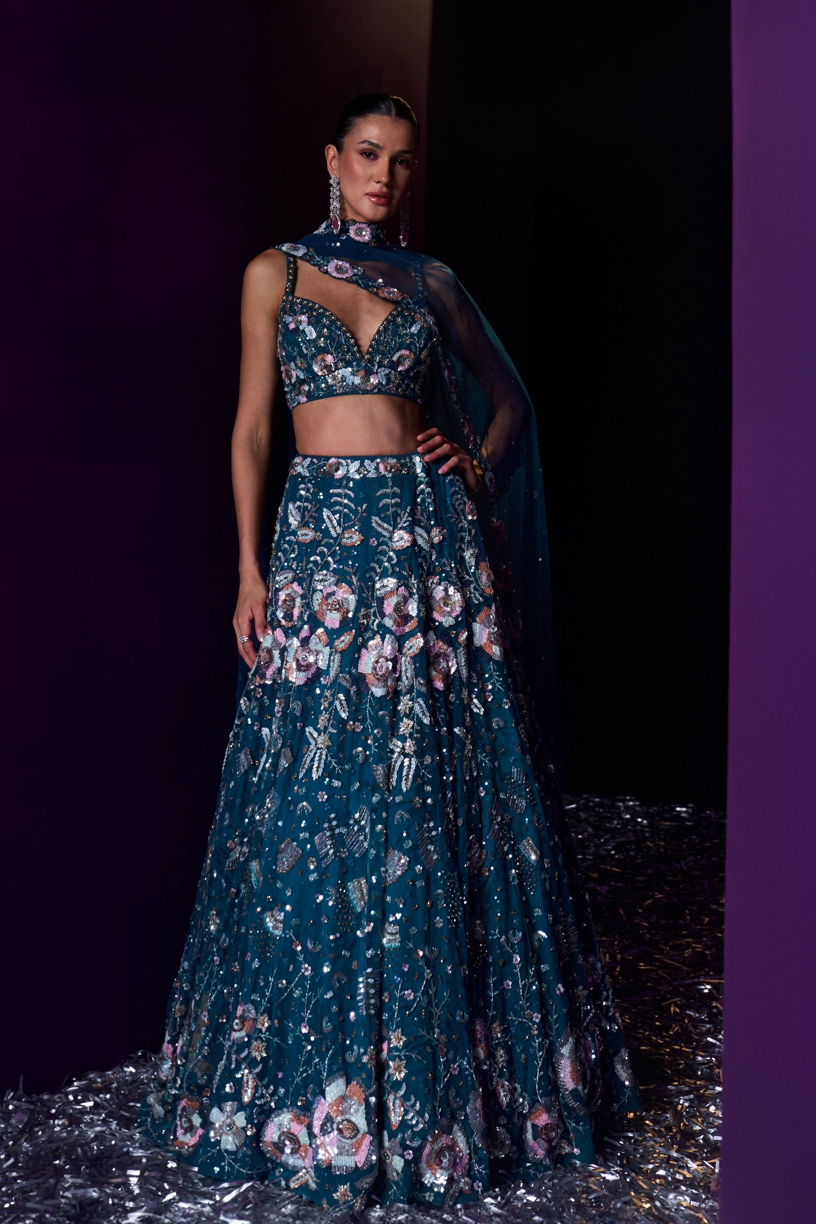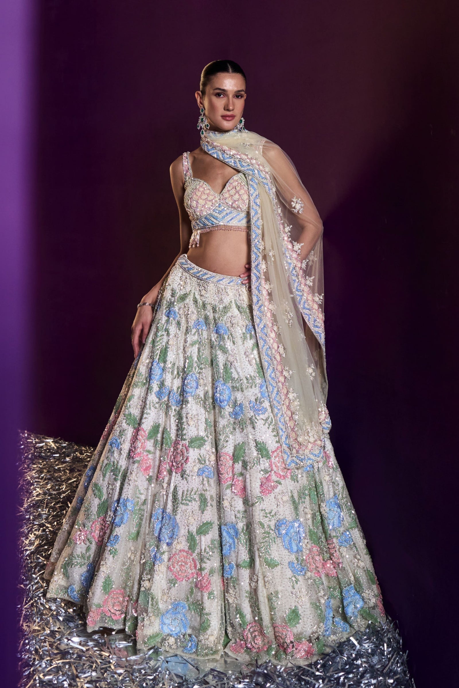 • A Green choga set paired with green tissu dupatta embroidered with kasab and tilla highlighted with mirror and gotta patti.