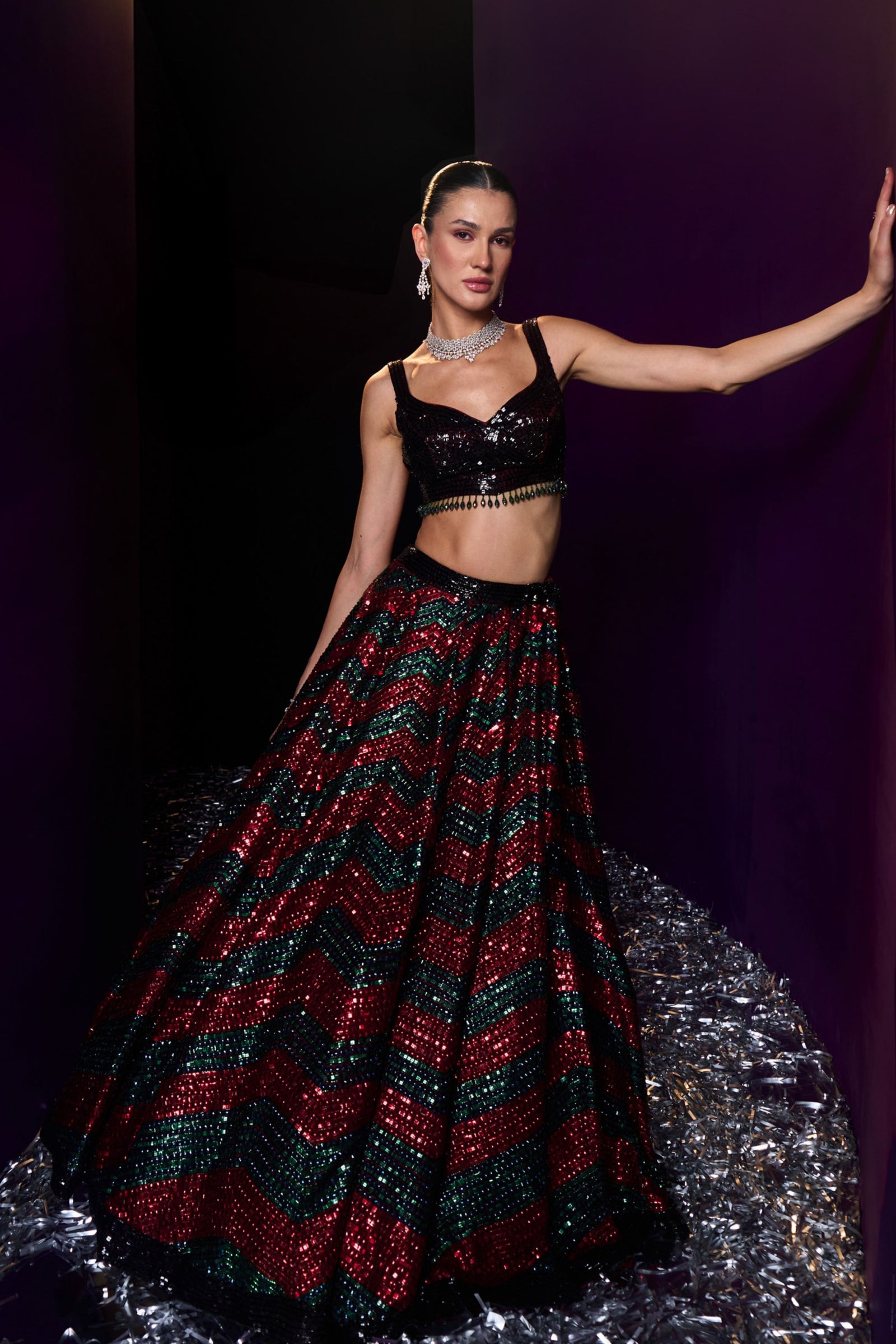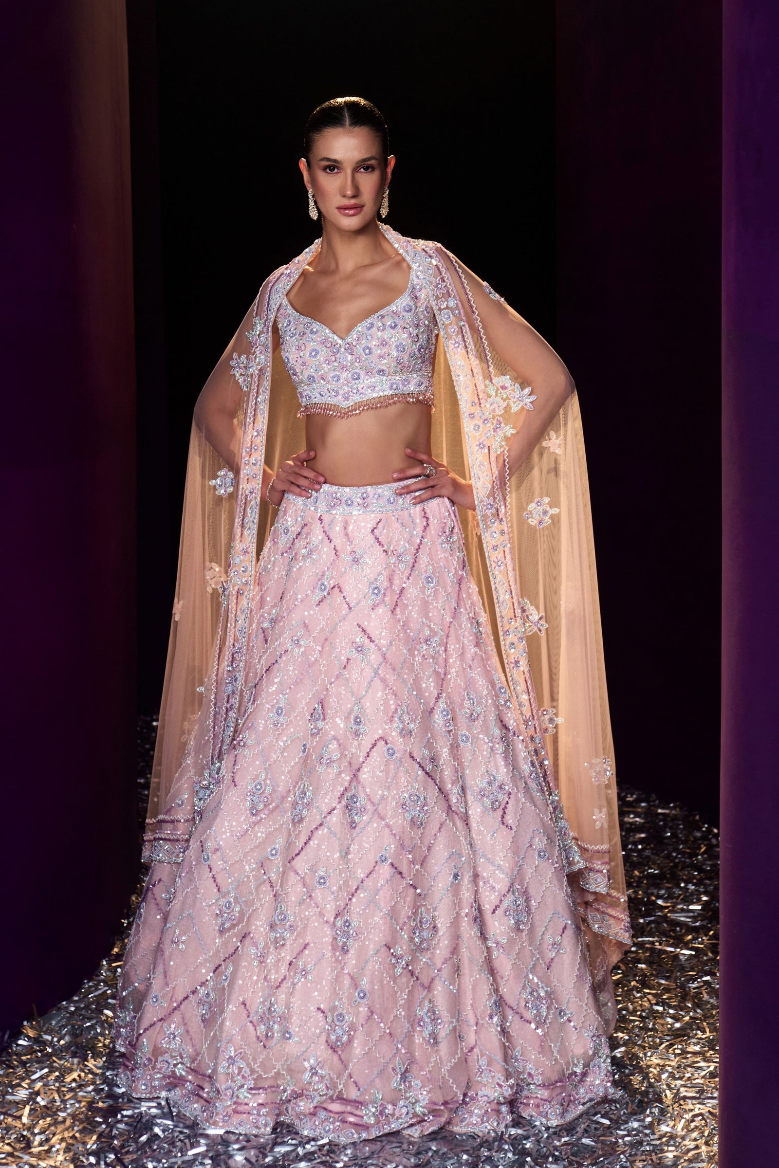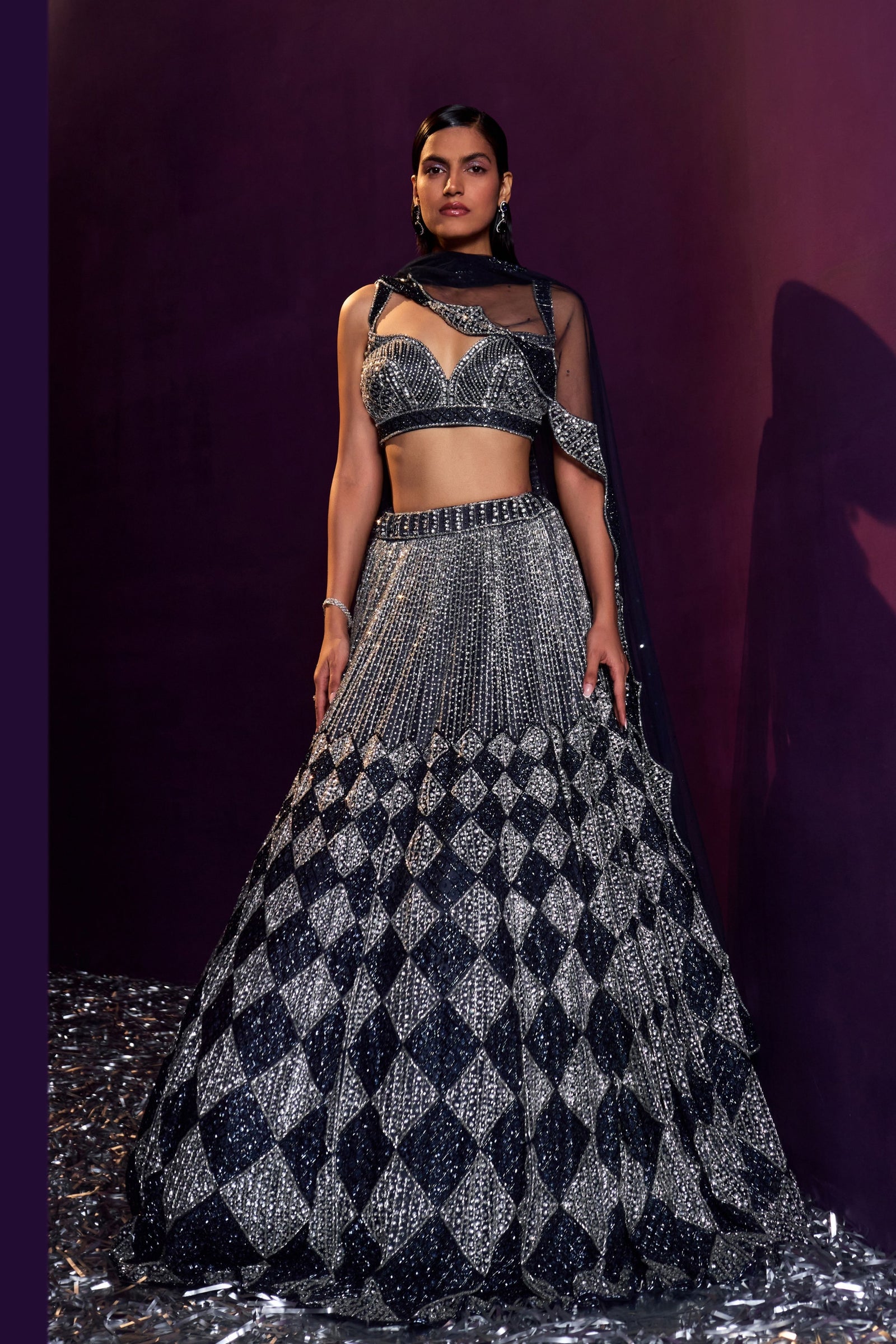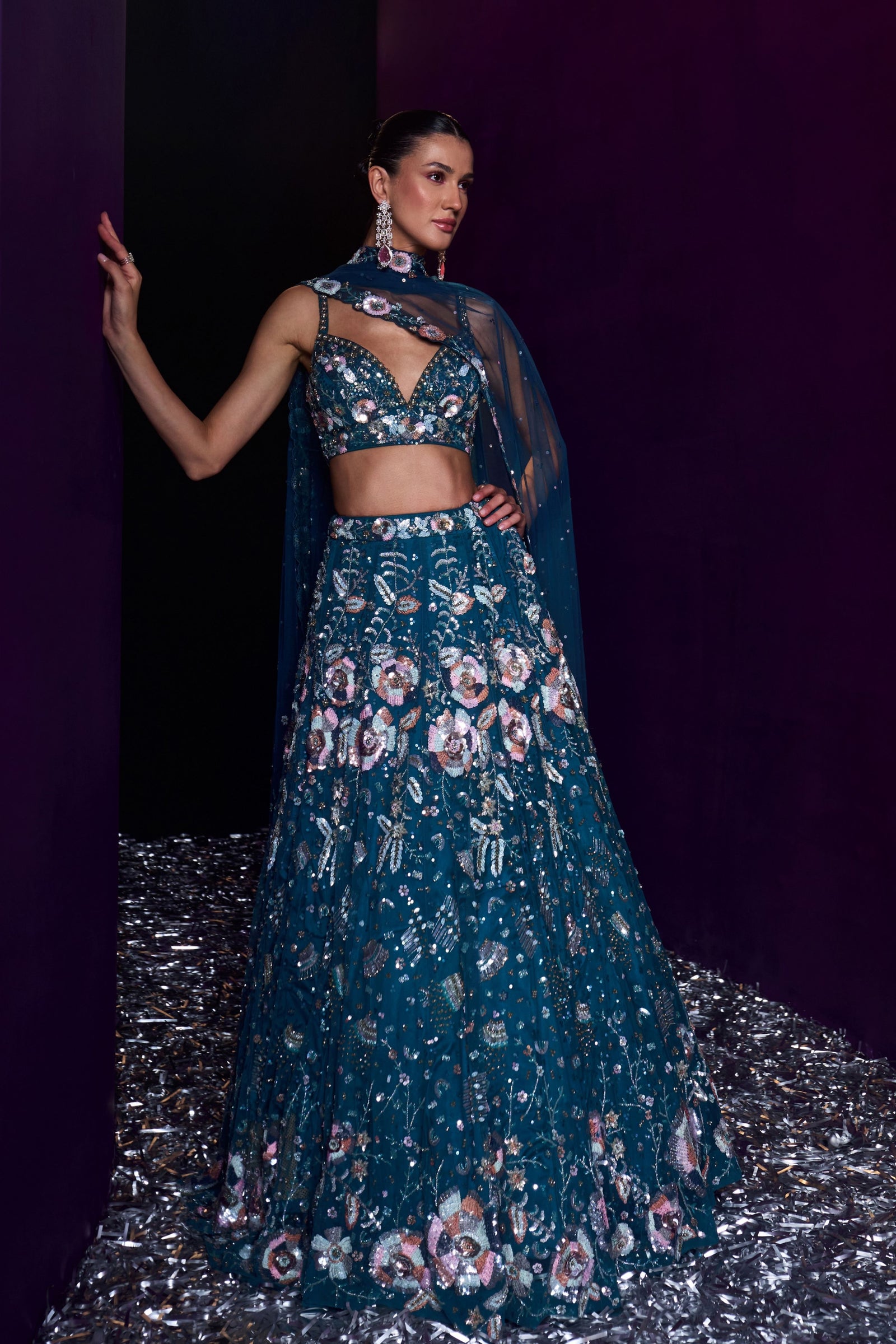 • A Green choga set paired with green tissu dupatta embroidered with kasab and tilla highlighted with mirror and gotta patti.