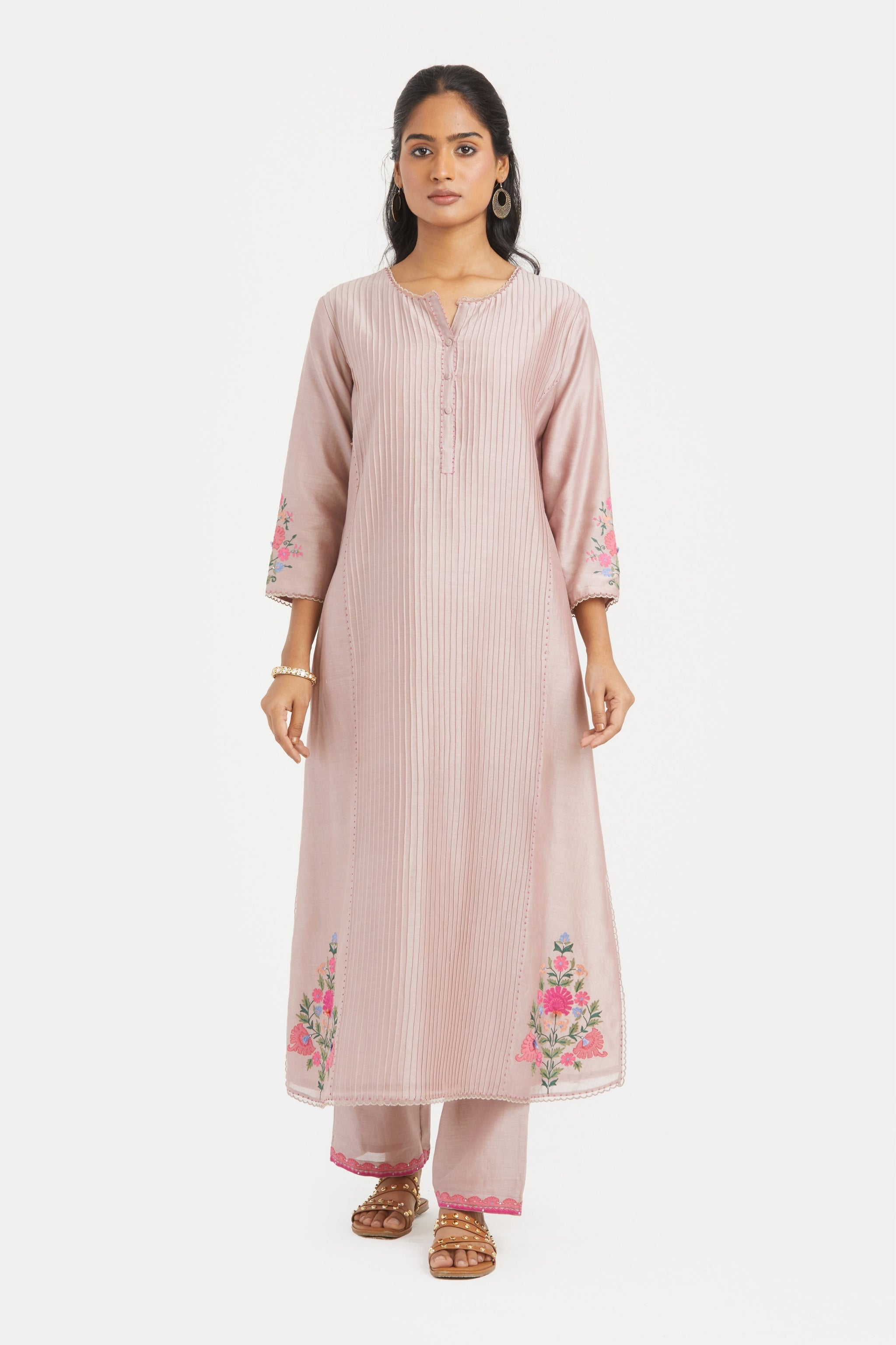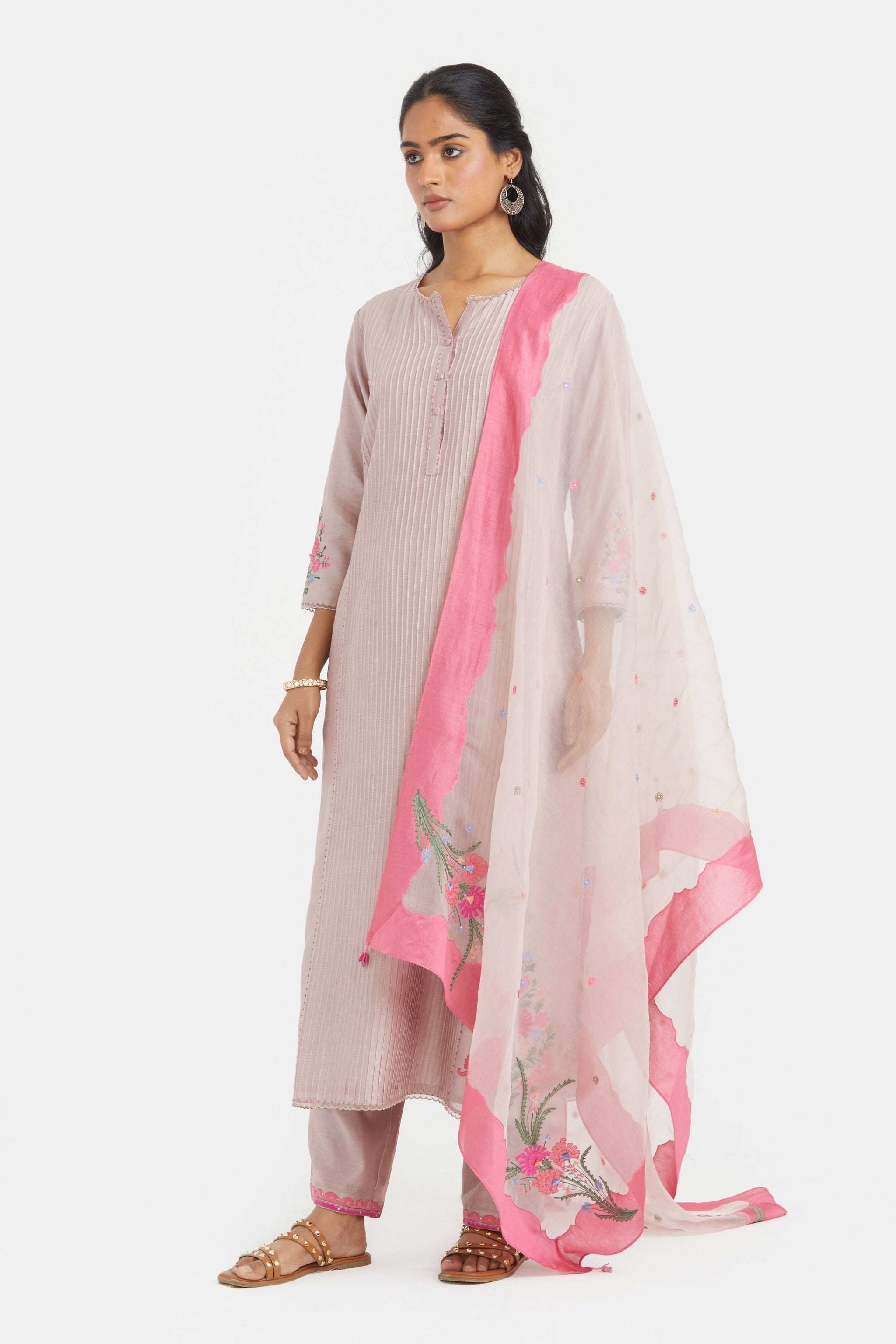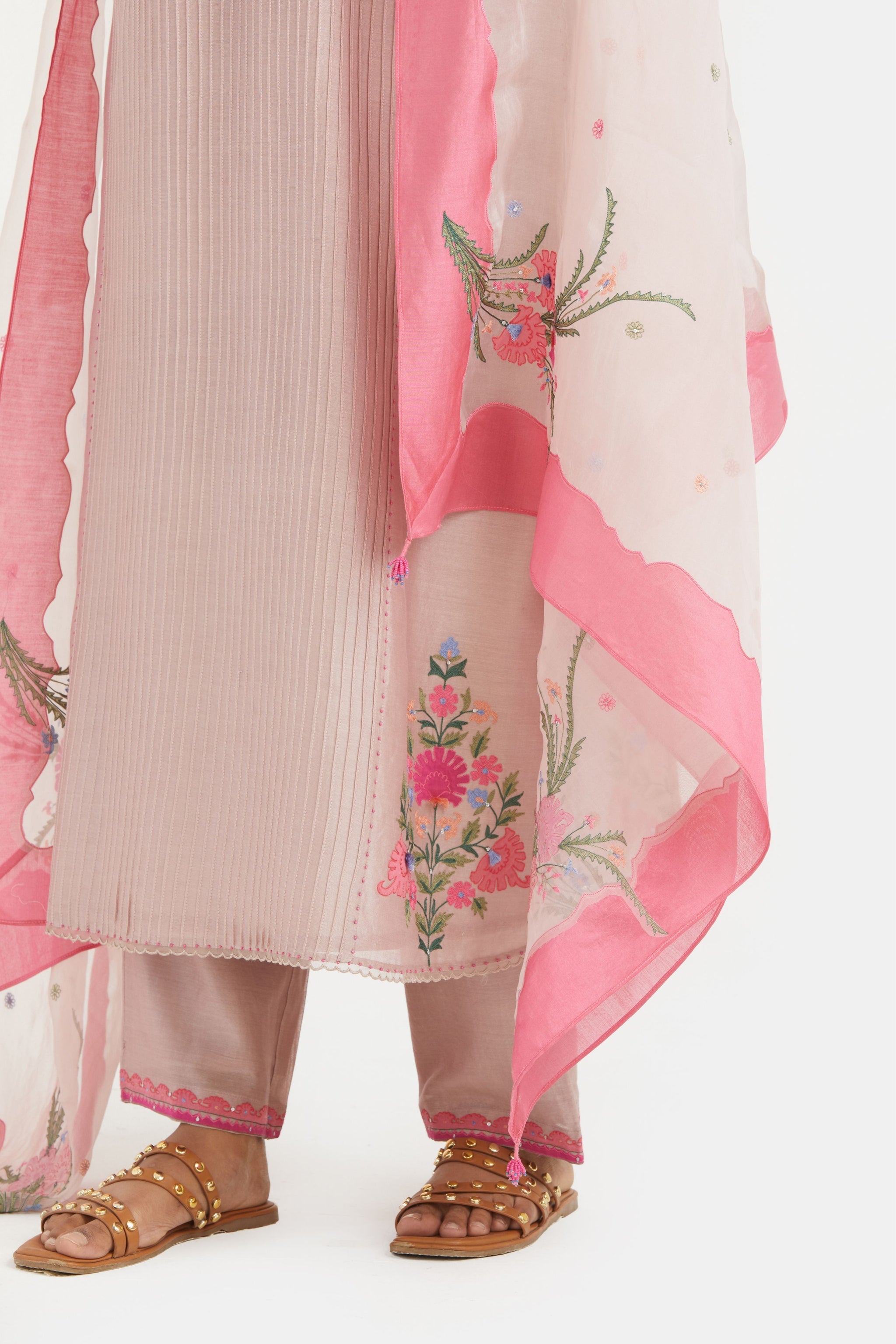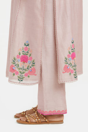 • A lilac silk chanderi kurta featuring pintucks in the front and back with floral appliqué bootas at the sides, highlighted with aari threadwork and sequins. It has a round neckline with a front button placket, and 3/4 sleeves, neck, side slits, and hem finished with scalloped organza edged with contrast beadwork. The kurta is lined with tonal cotton. Paired with lilac silk chanderi straight pants decorated with multi-colored appliqué and sequin detailing at the hem, featuring side pockets and an elasticated back waist with front drawstrings for a perfect fit. Completed with a lilac and pink narrow silk organza dupatta adorned with small thread flowers, appliqué floral bootas at the corners, sequins, and beaded tassels for an elegant finish.