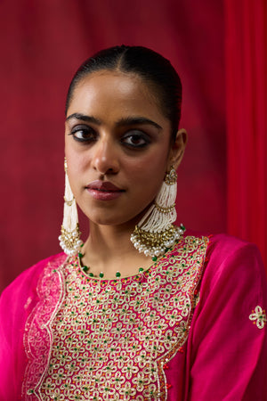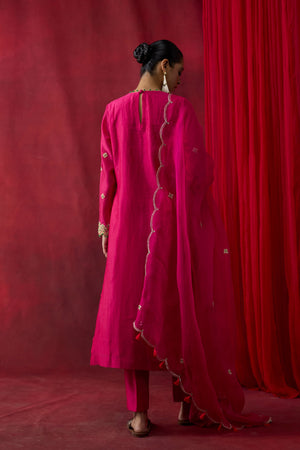 • Pink thread, dori, and hand-embroidered straight kurta in silk chanderi fabric, paired with an embroidered silk organza pink dupatta. Comes with matching silk chanderi pants.