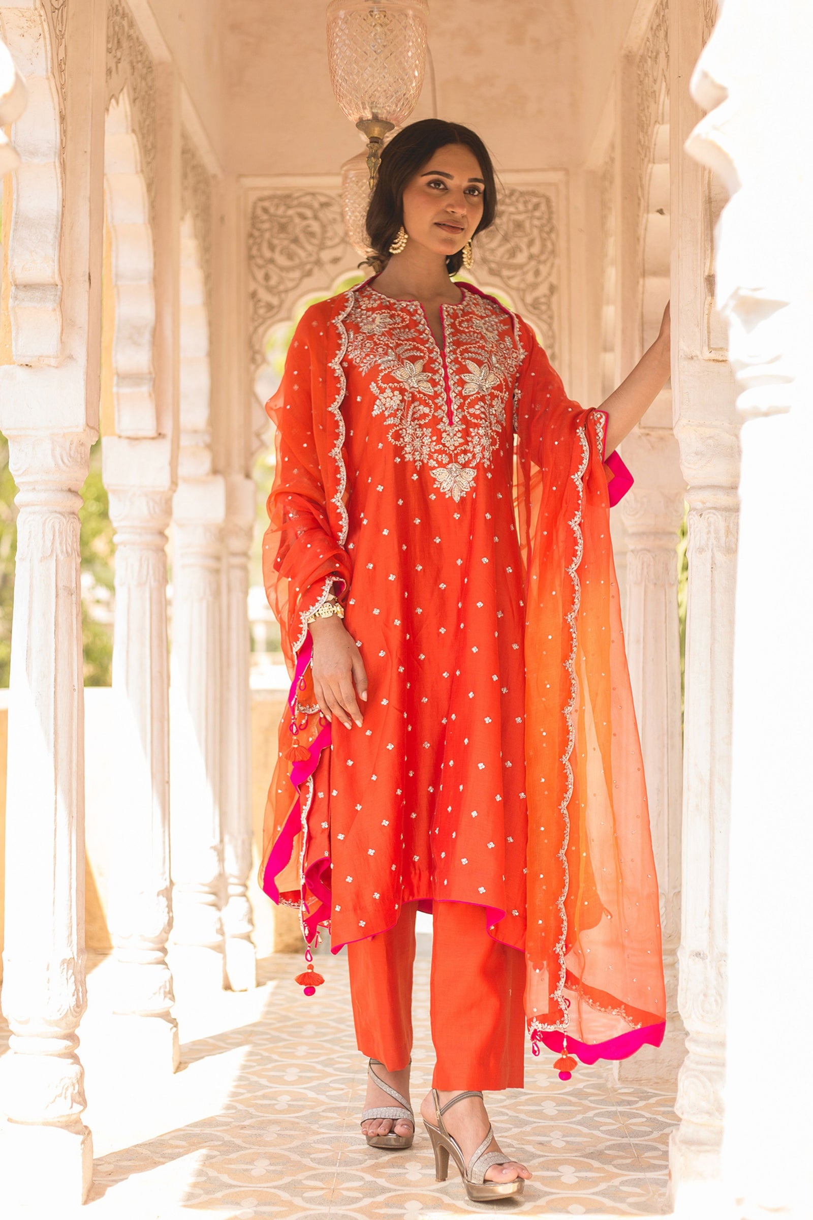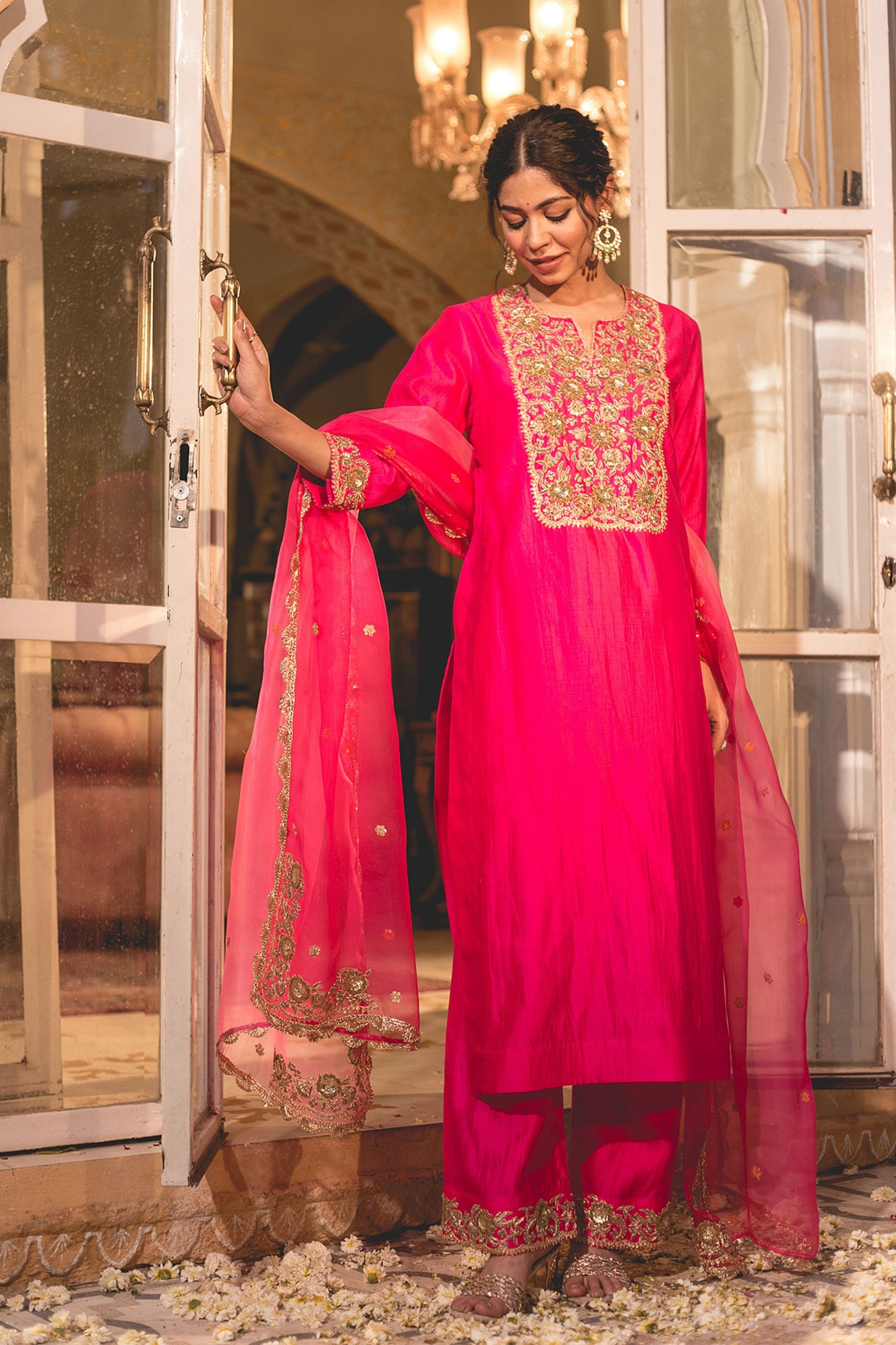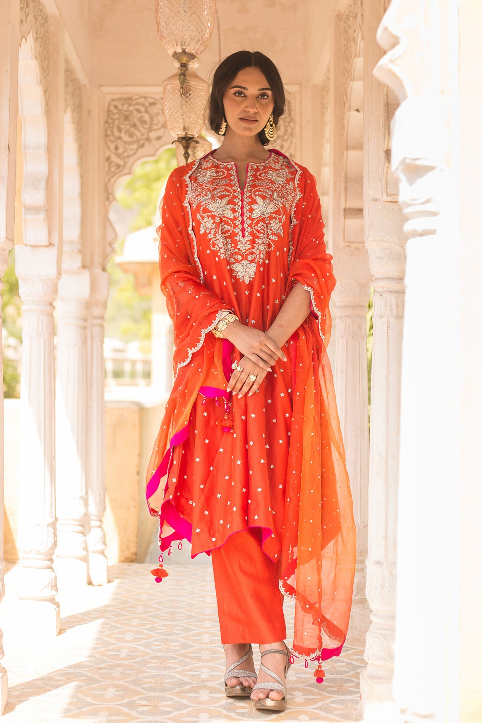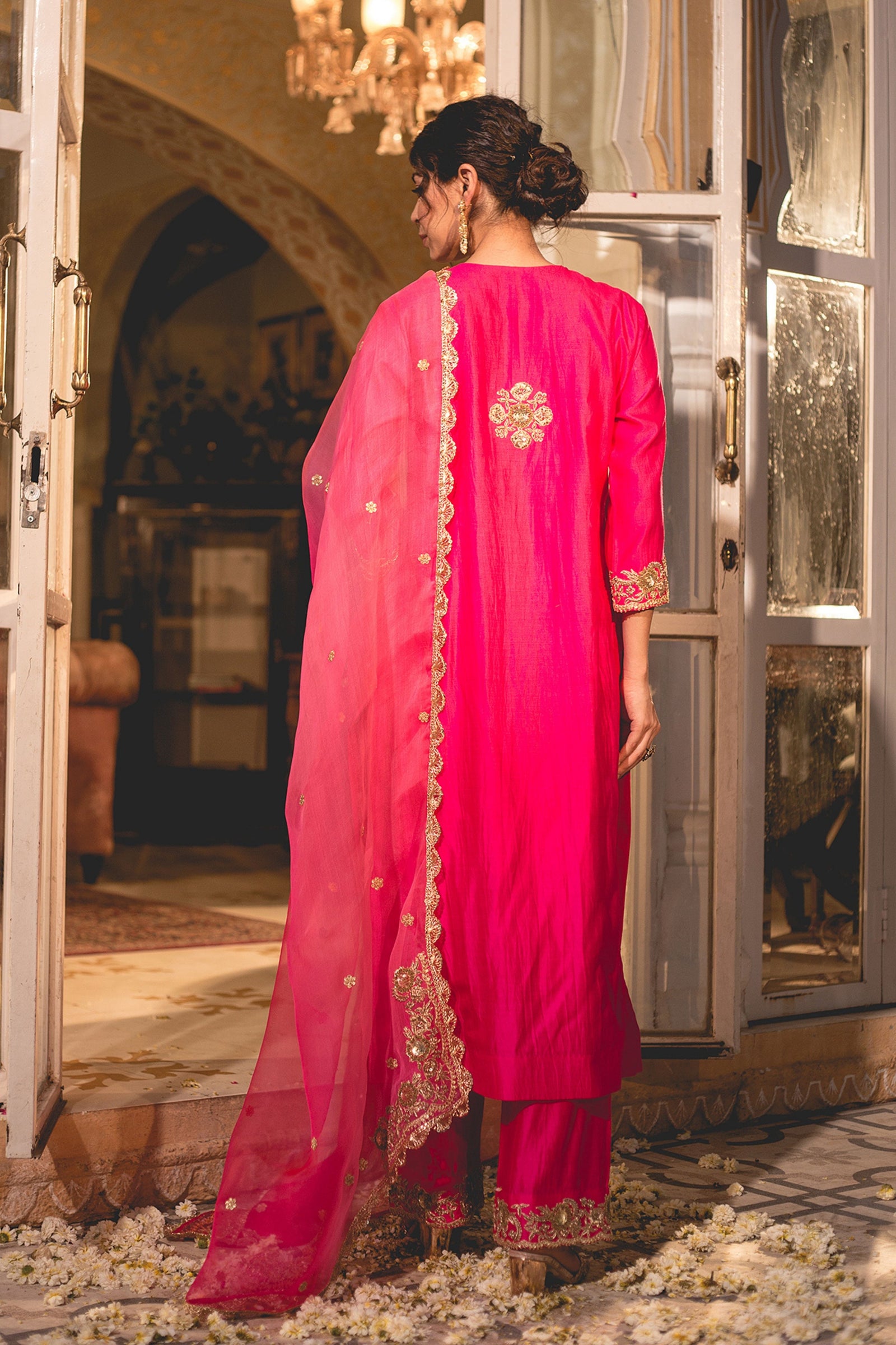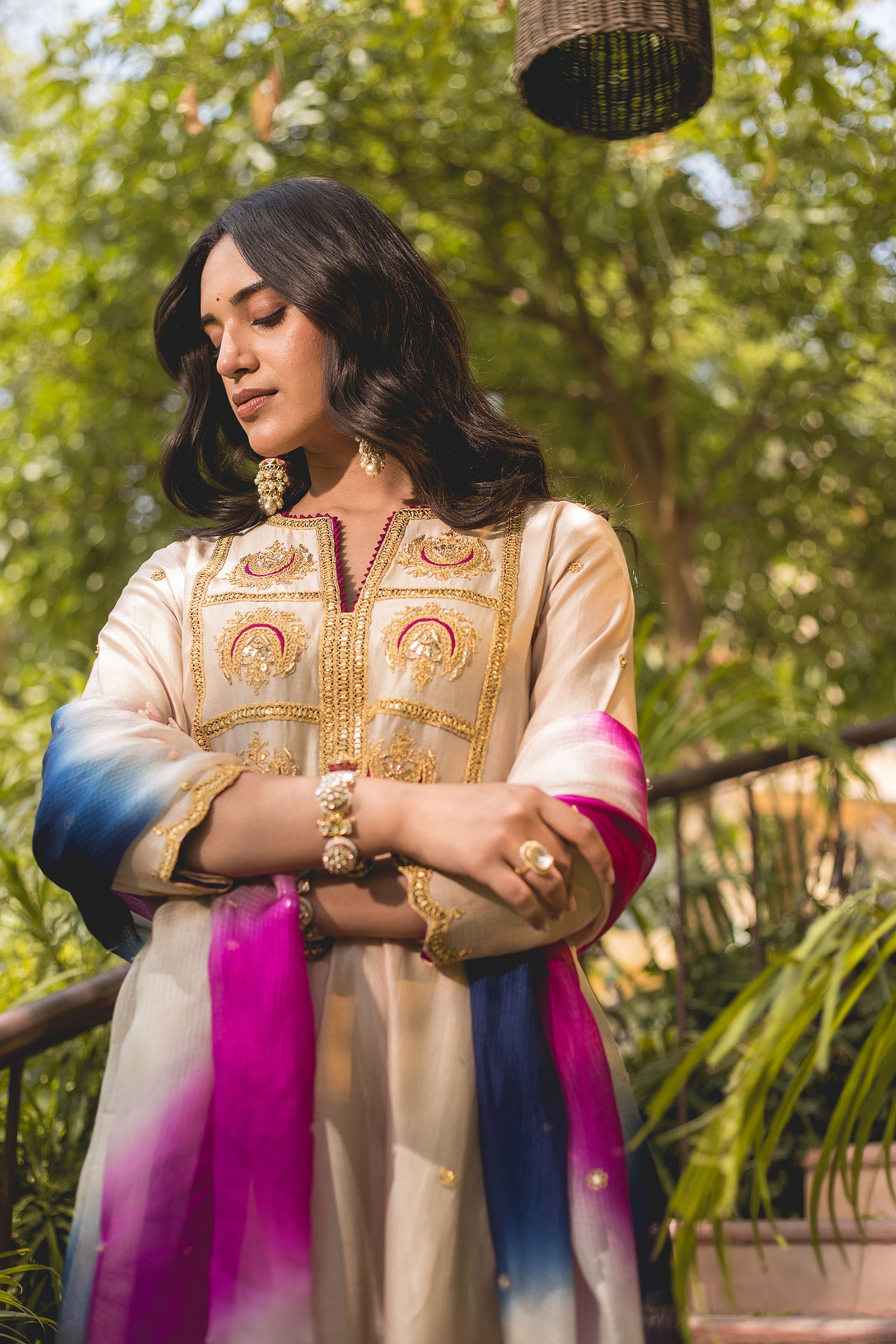 • Featuring spun silk kurta paired with matching pant and dupatta handcrafted with marori work.