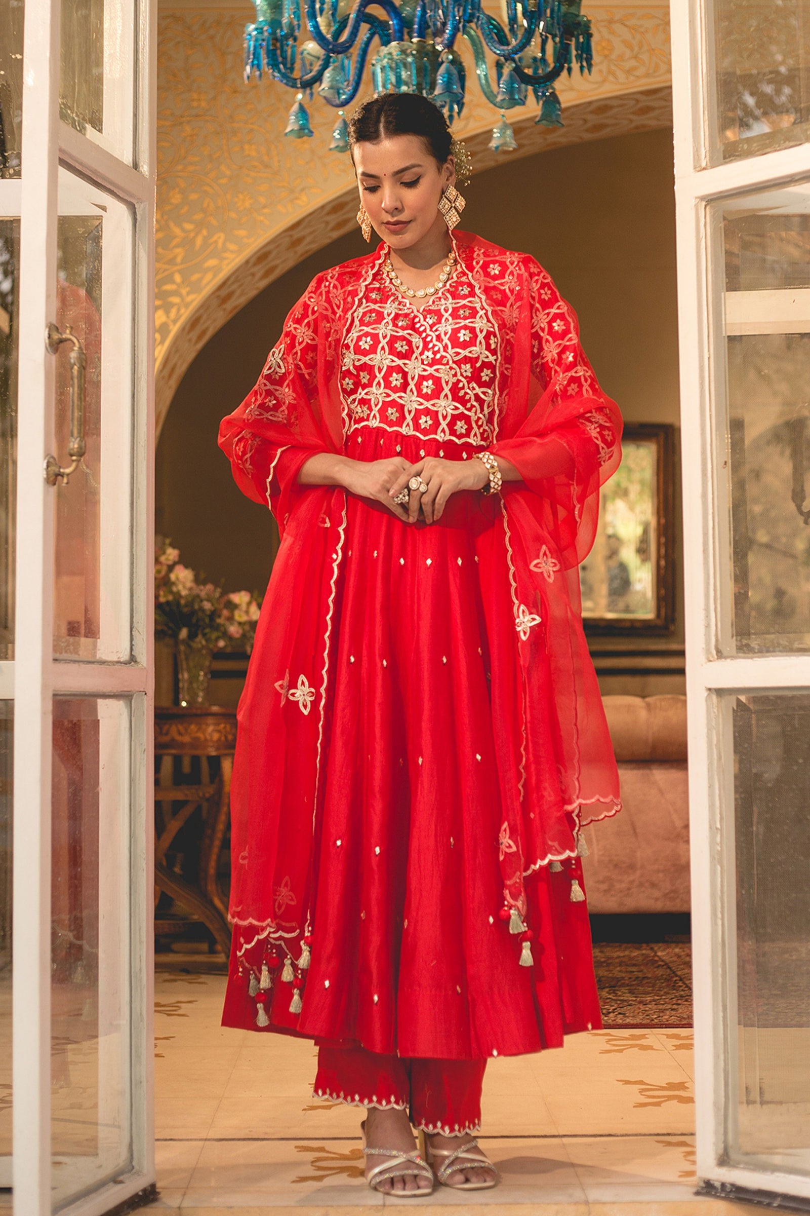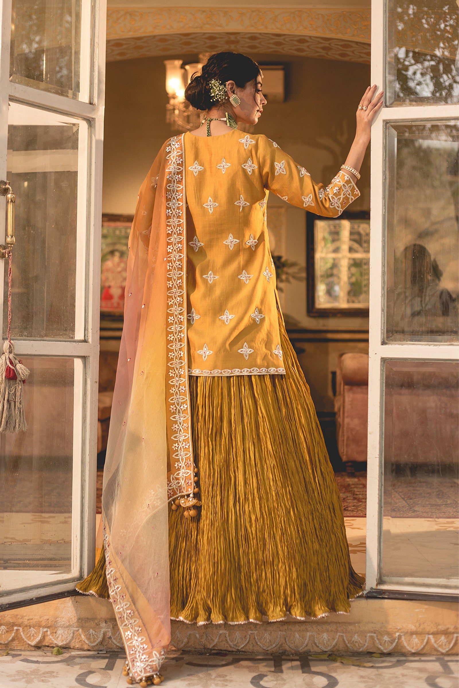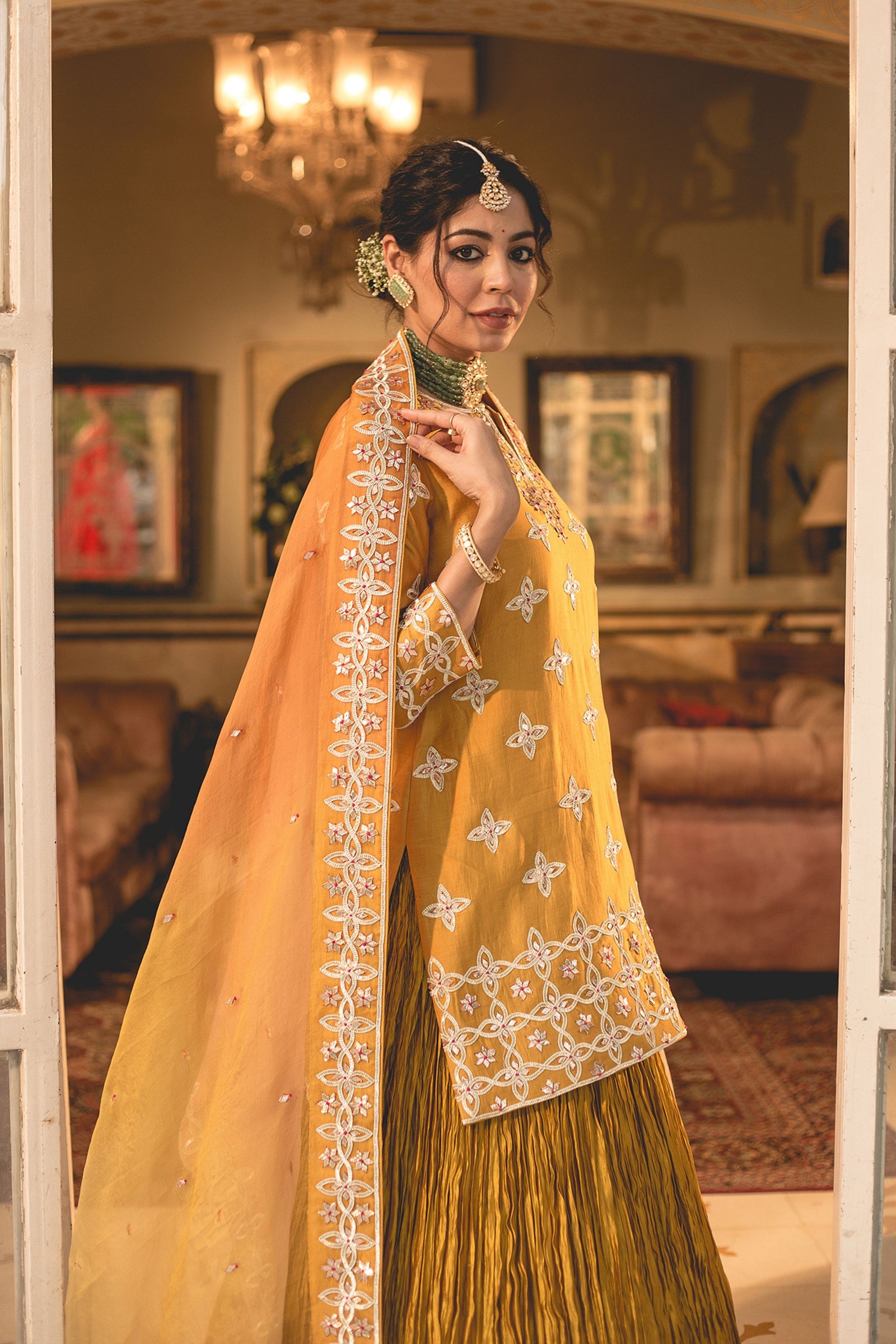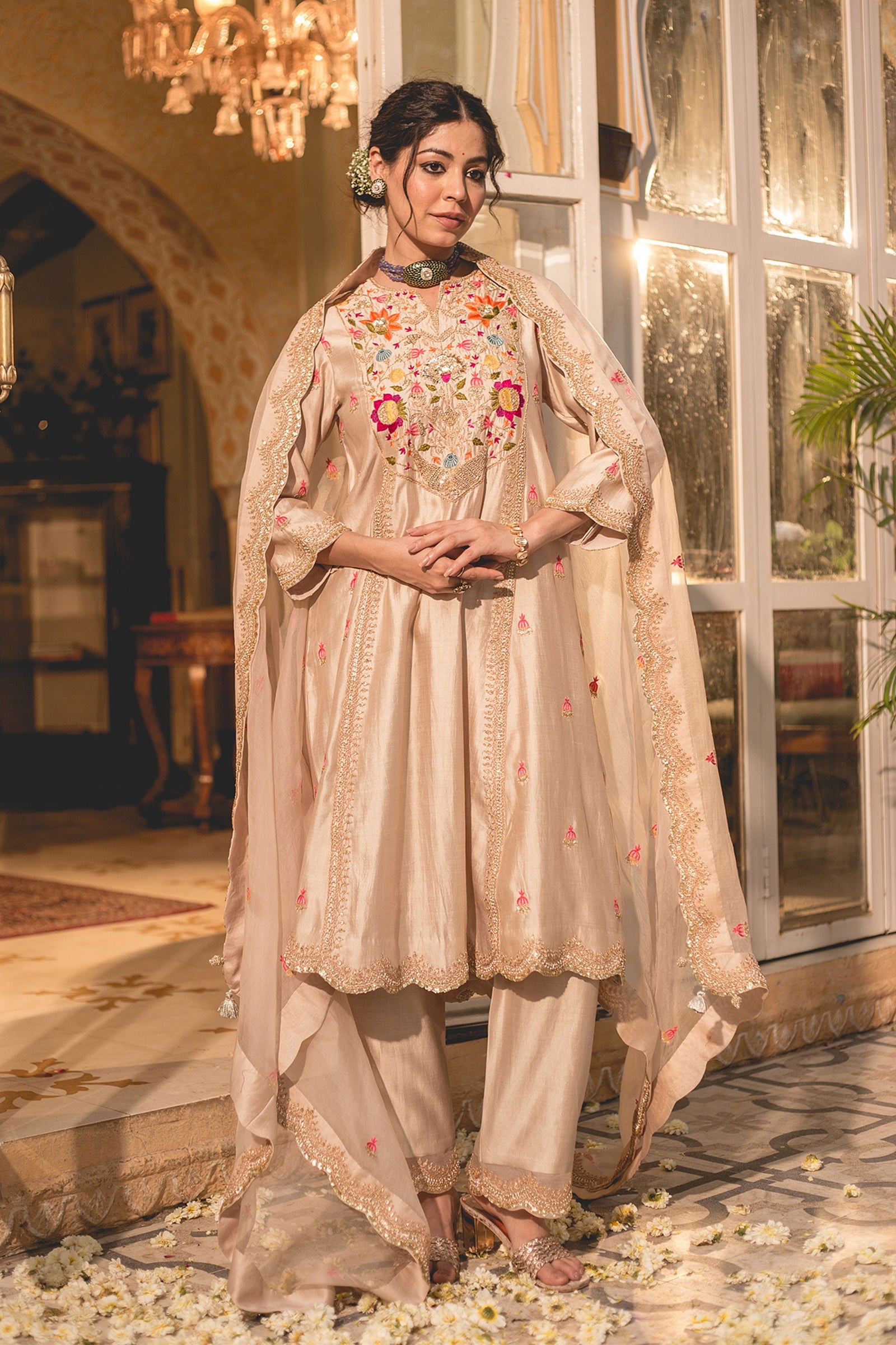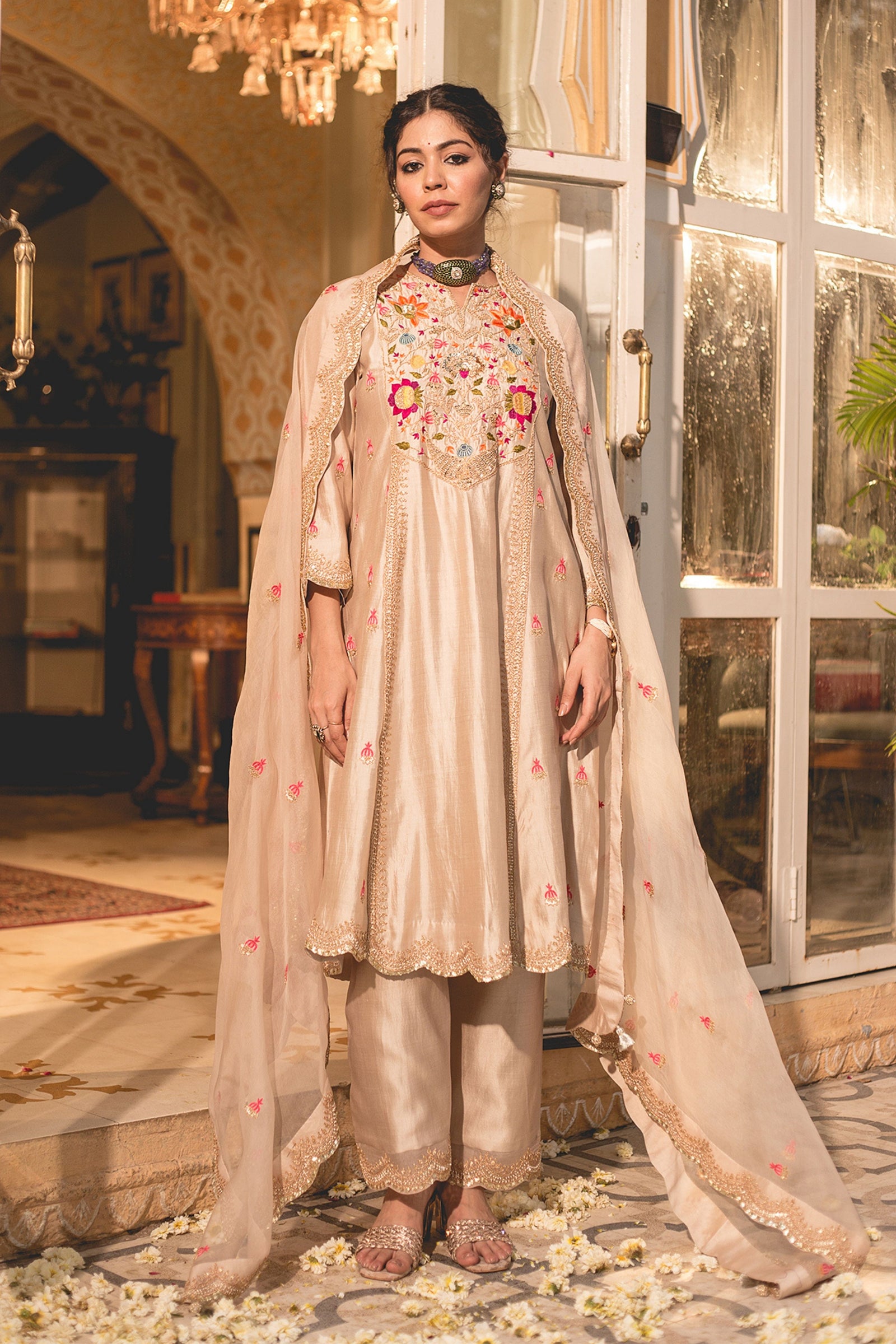 • Featuring spun silk kurta paired with matching pant and dupatta handcrafted with marori work.