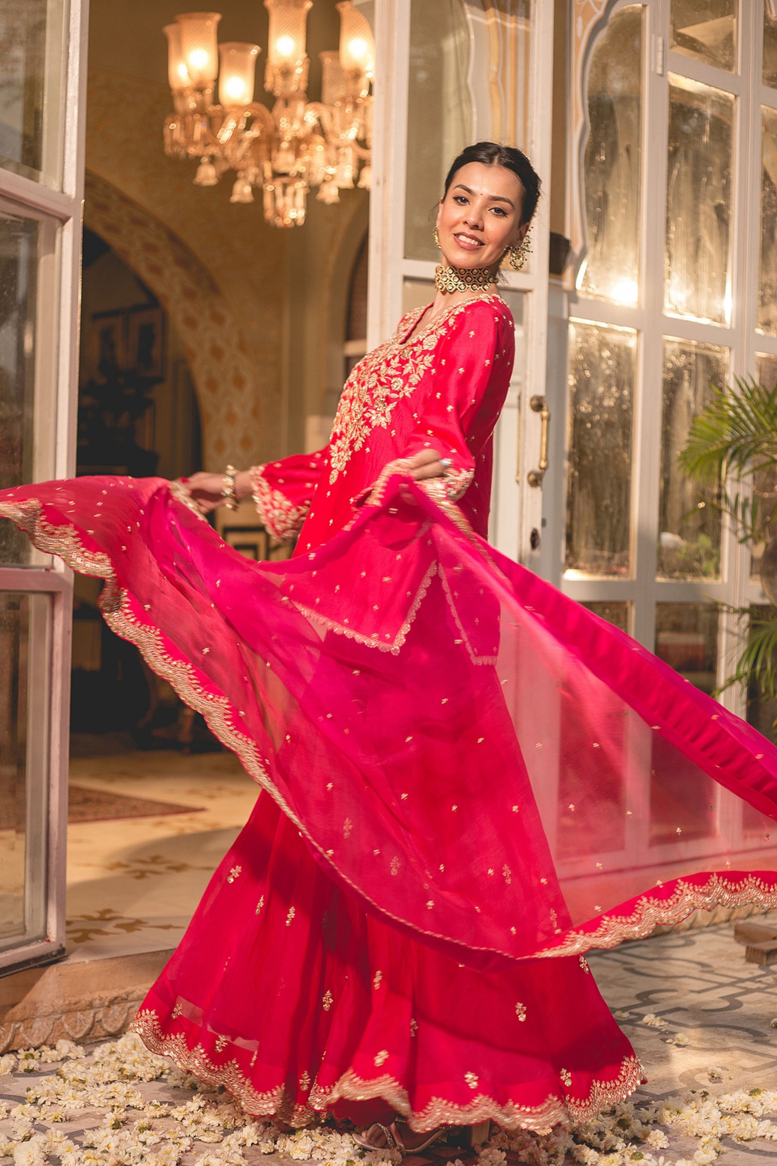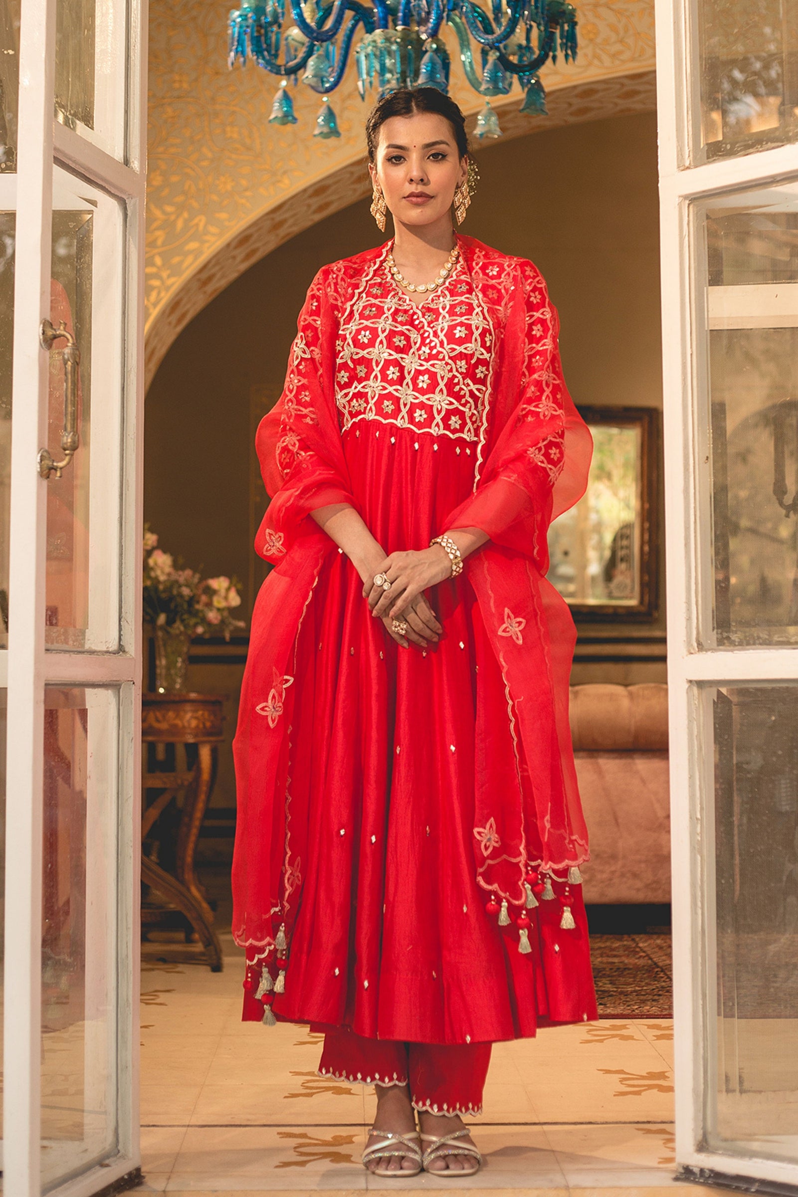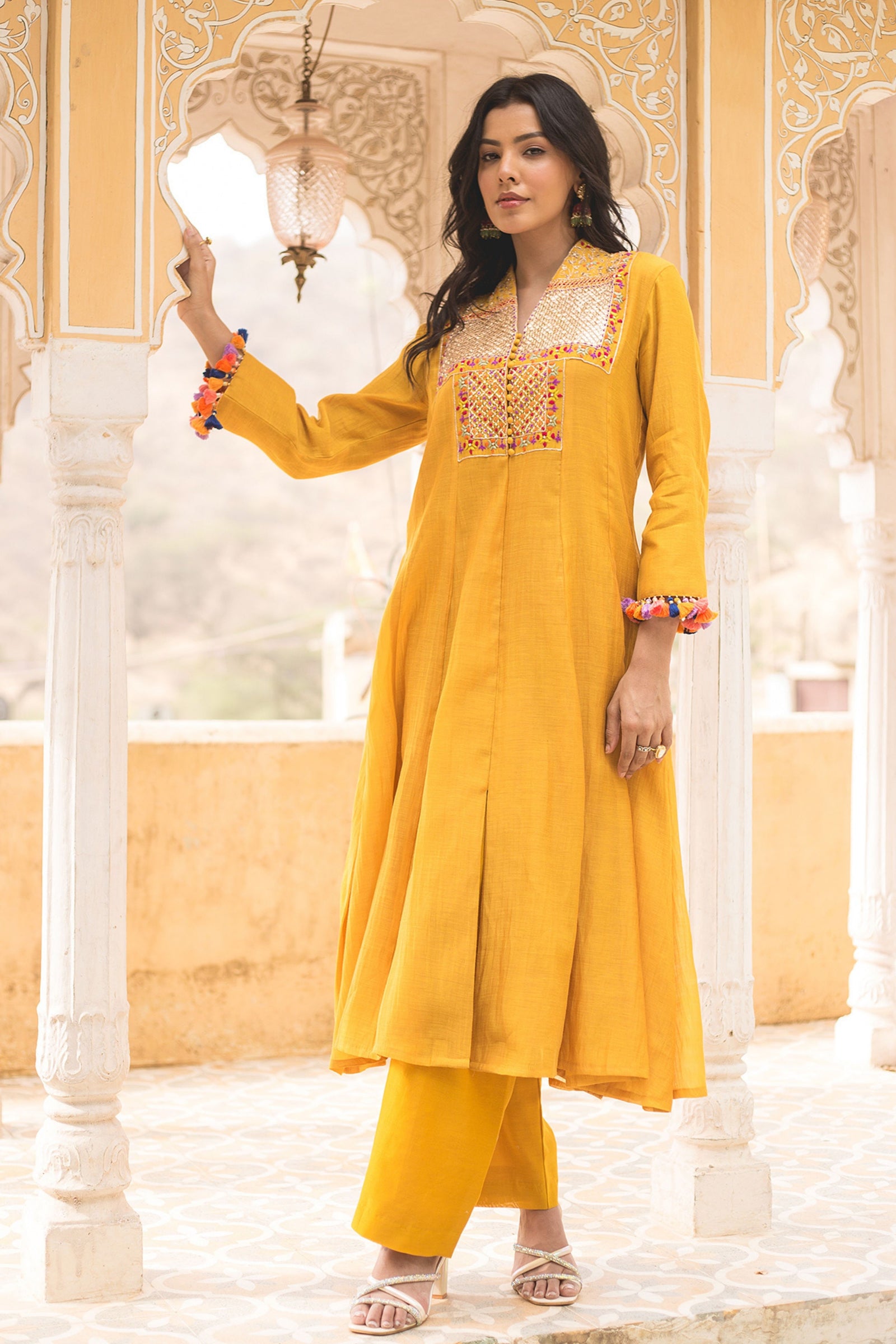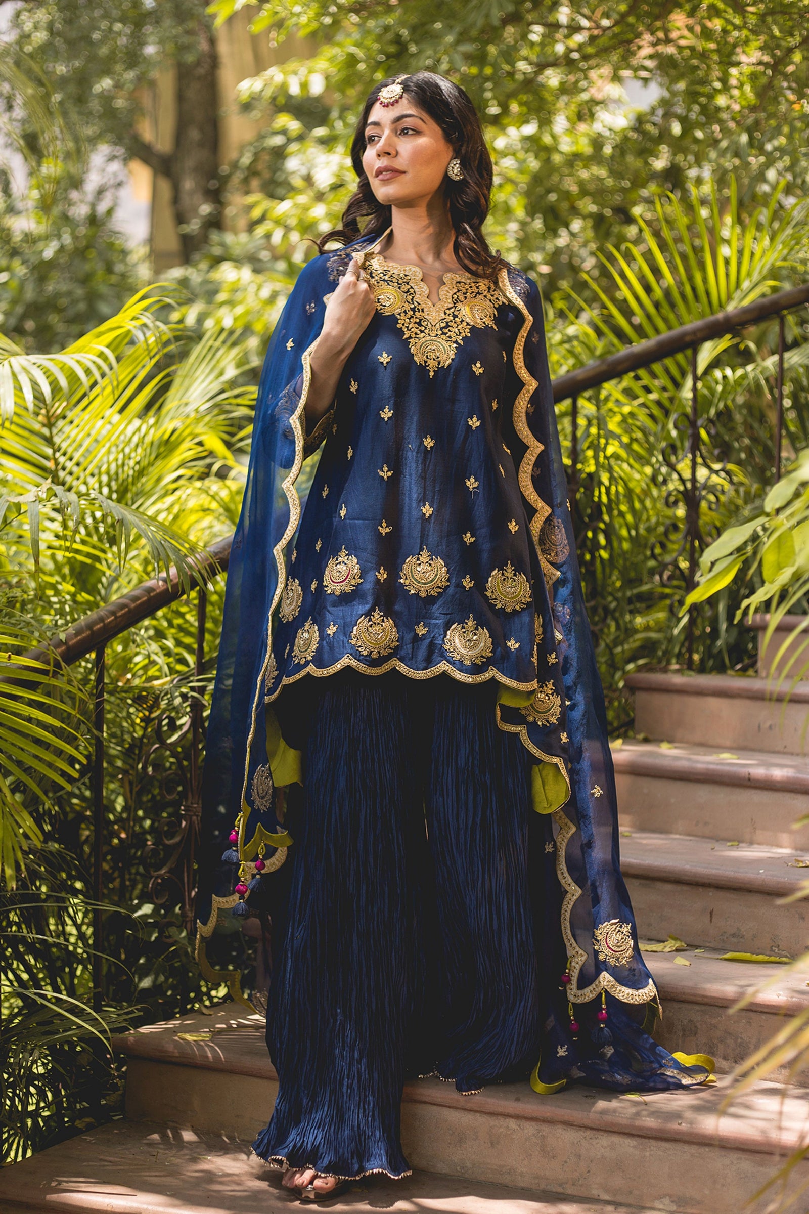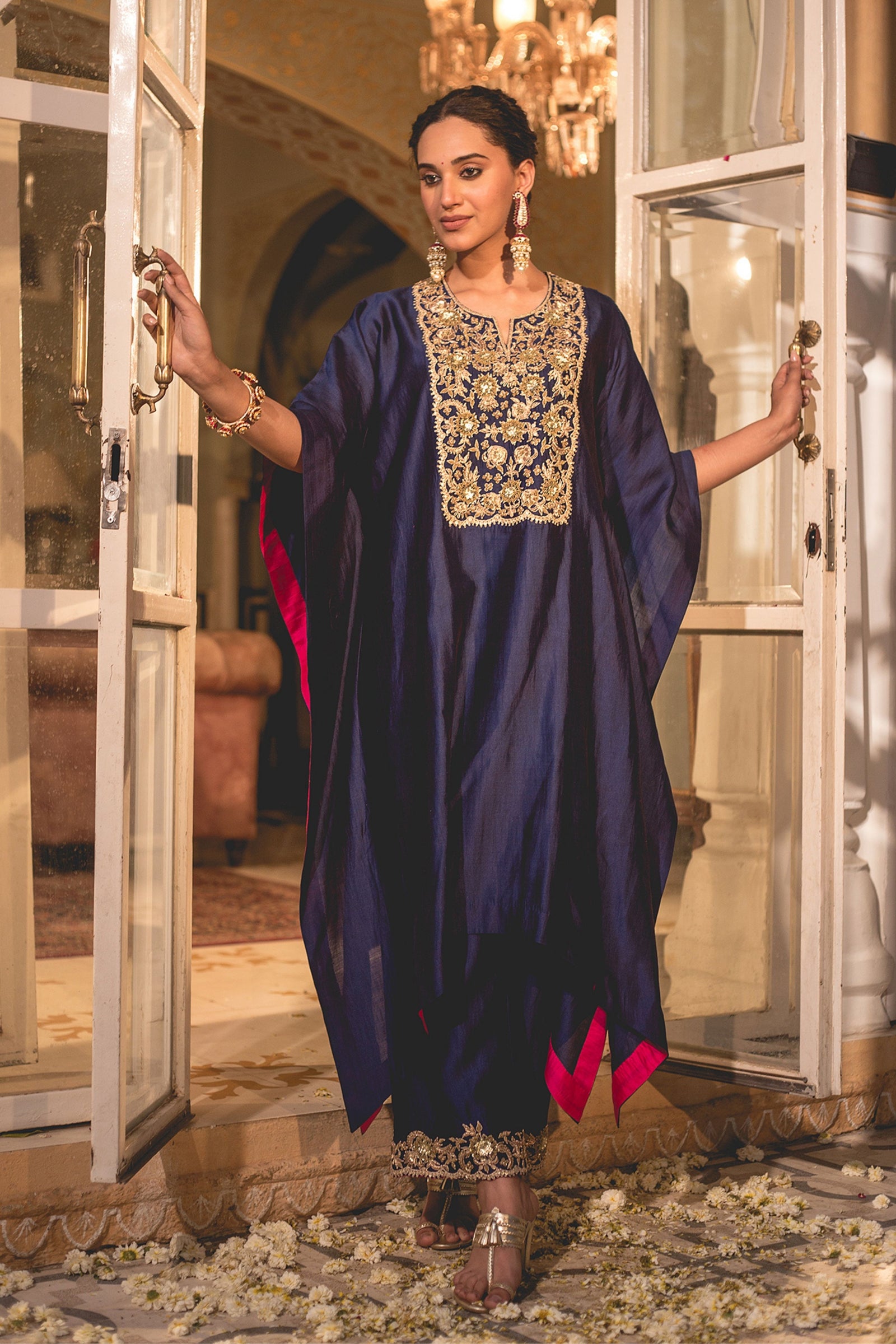 • Featuring spun silk kurta paired with matching pant and dupatta handcrafted with marori work.