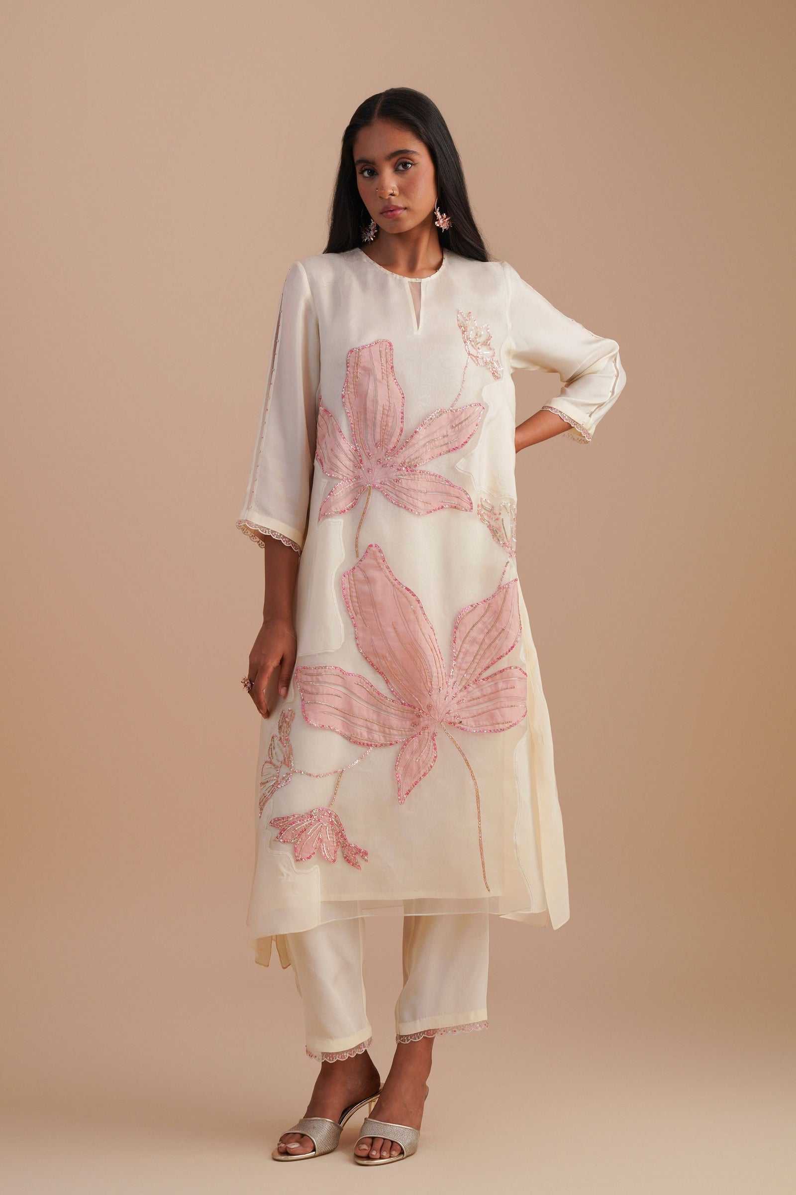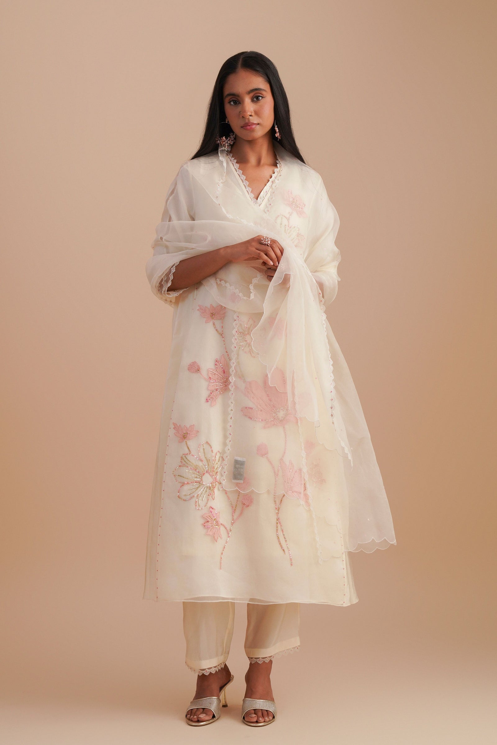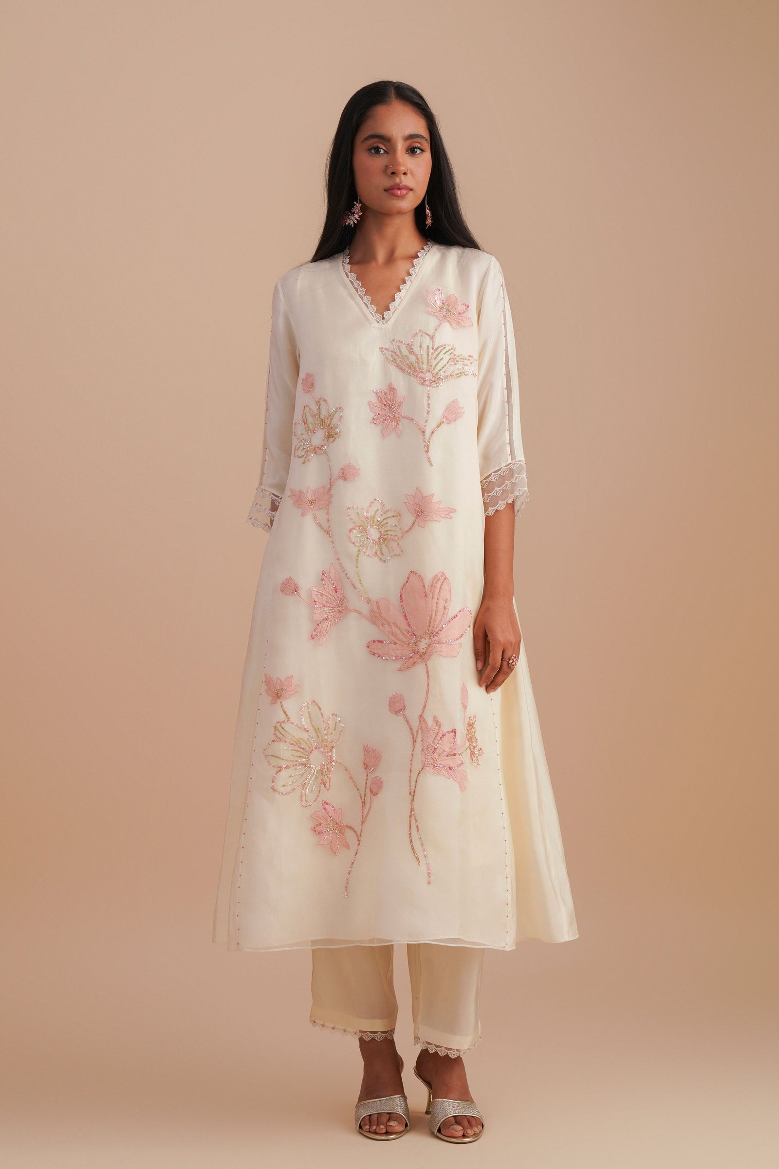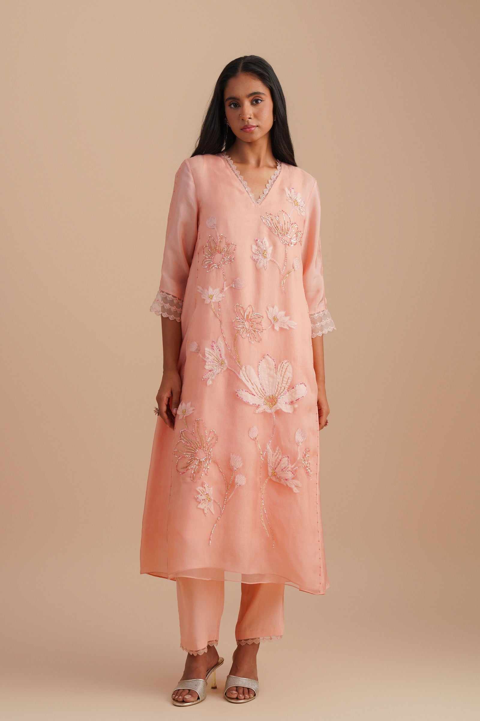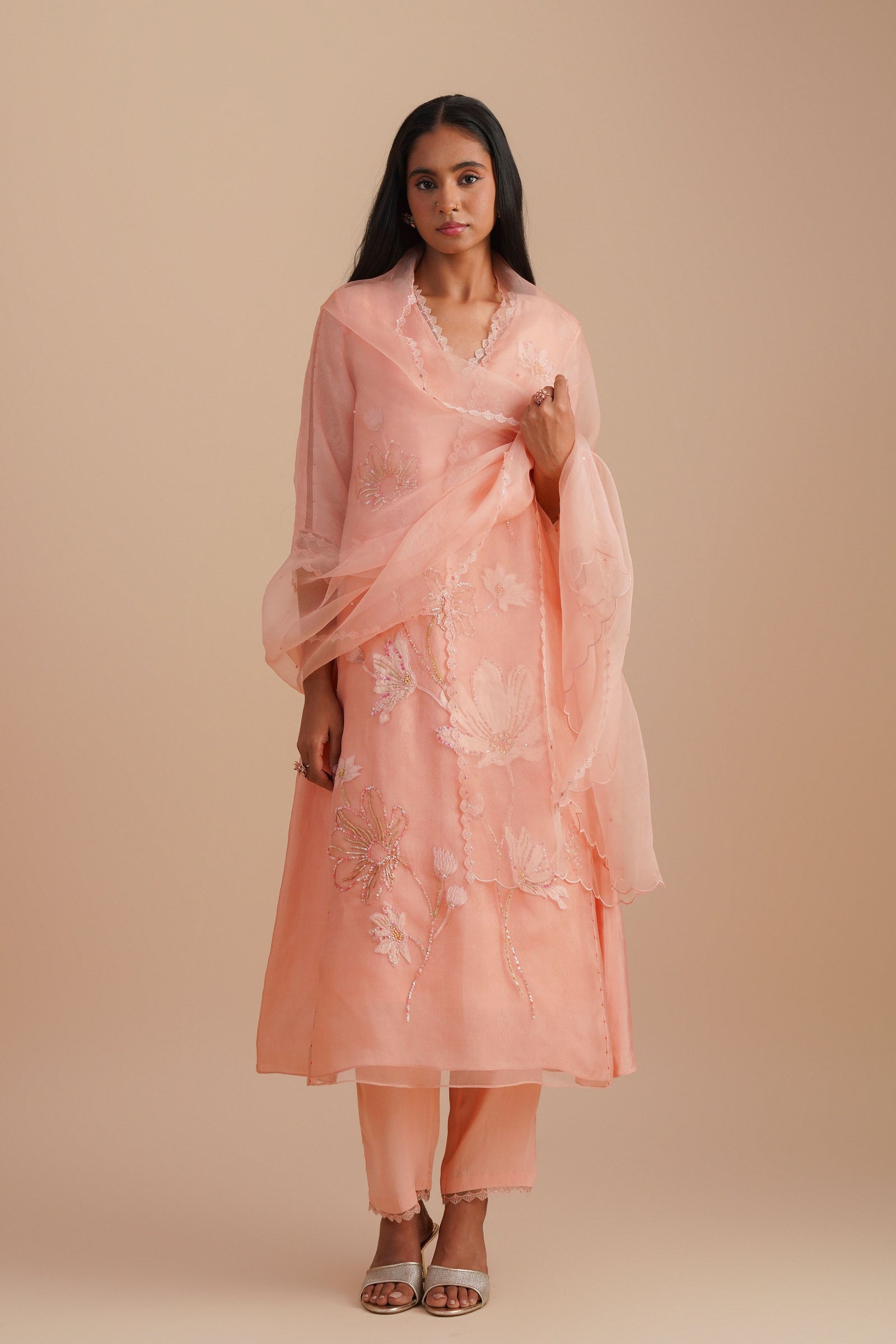 • Featuring a rose pink kalidar kurta set with delicate floral embroidery.