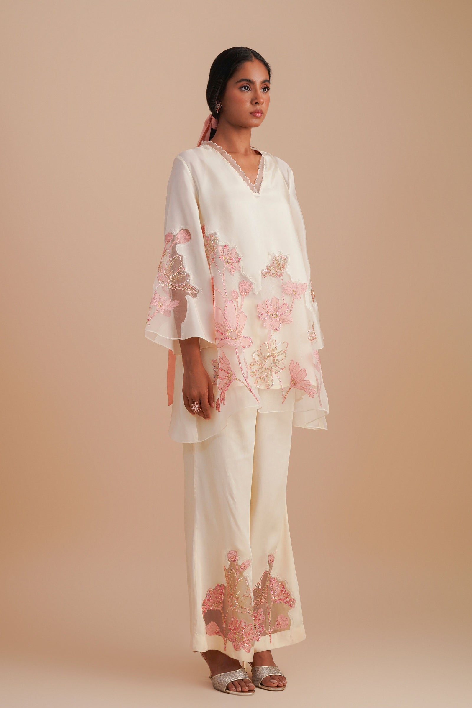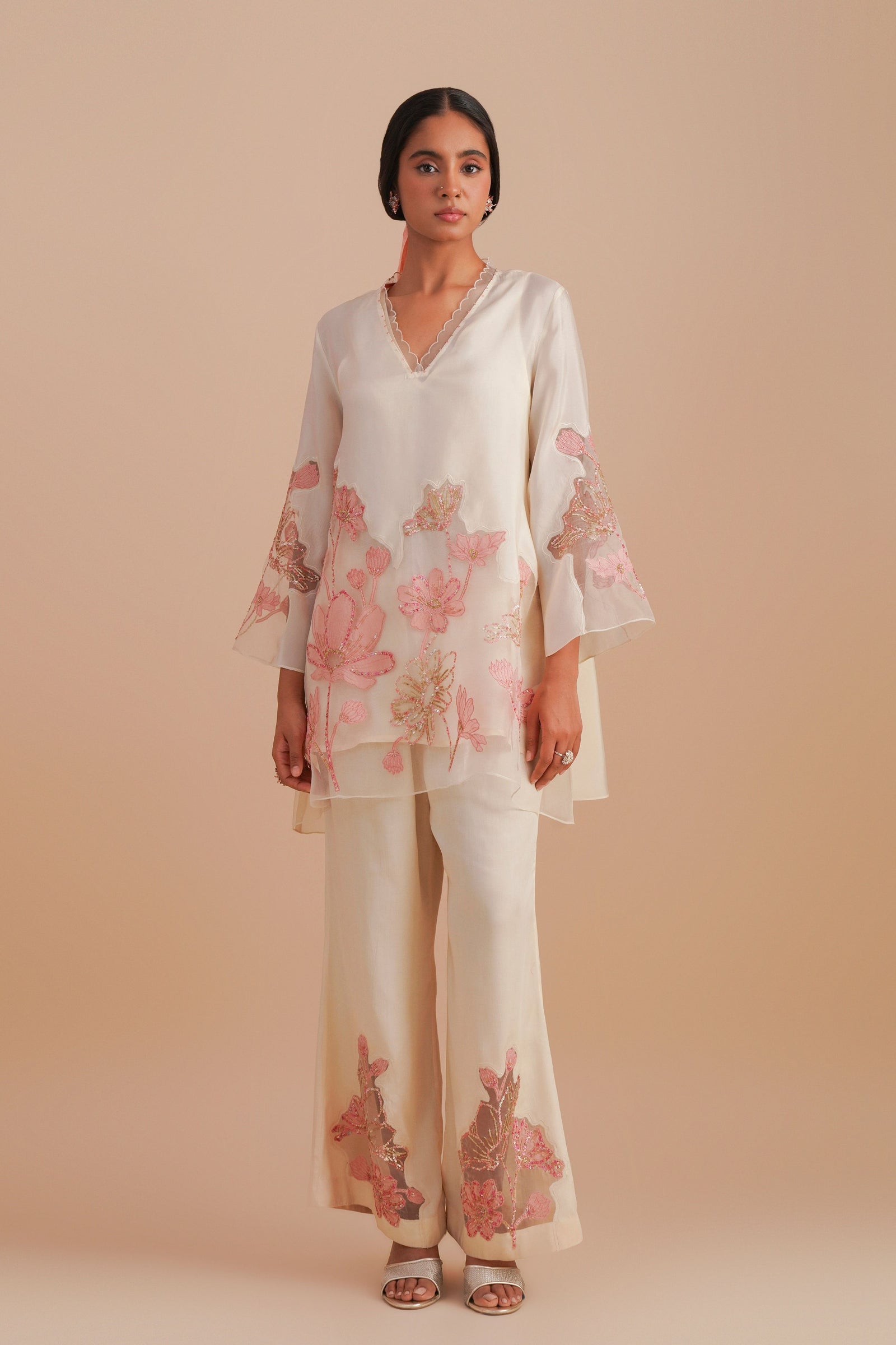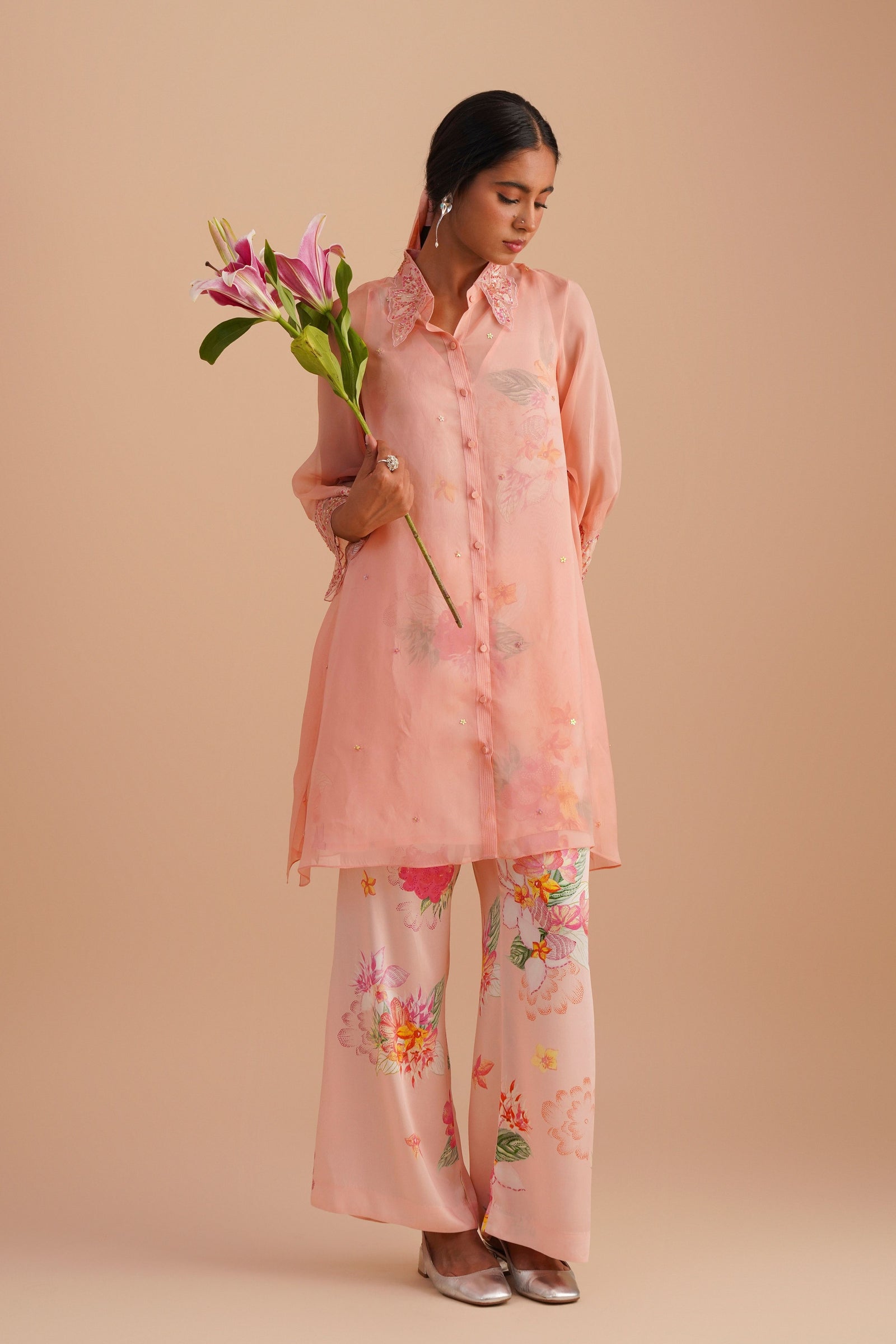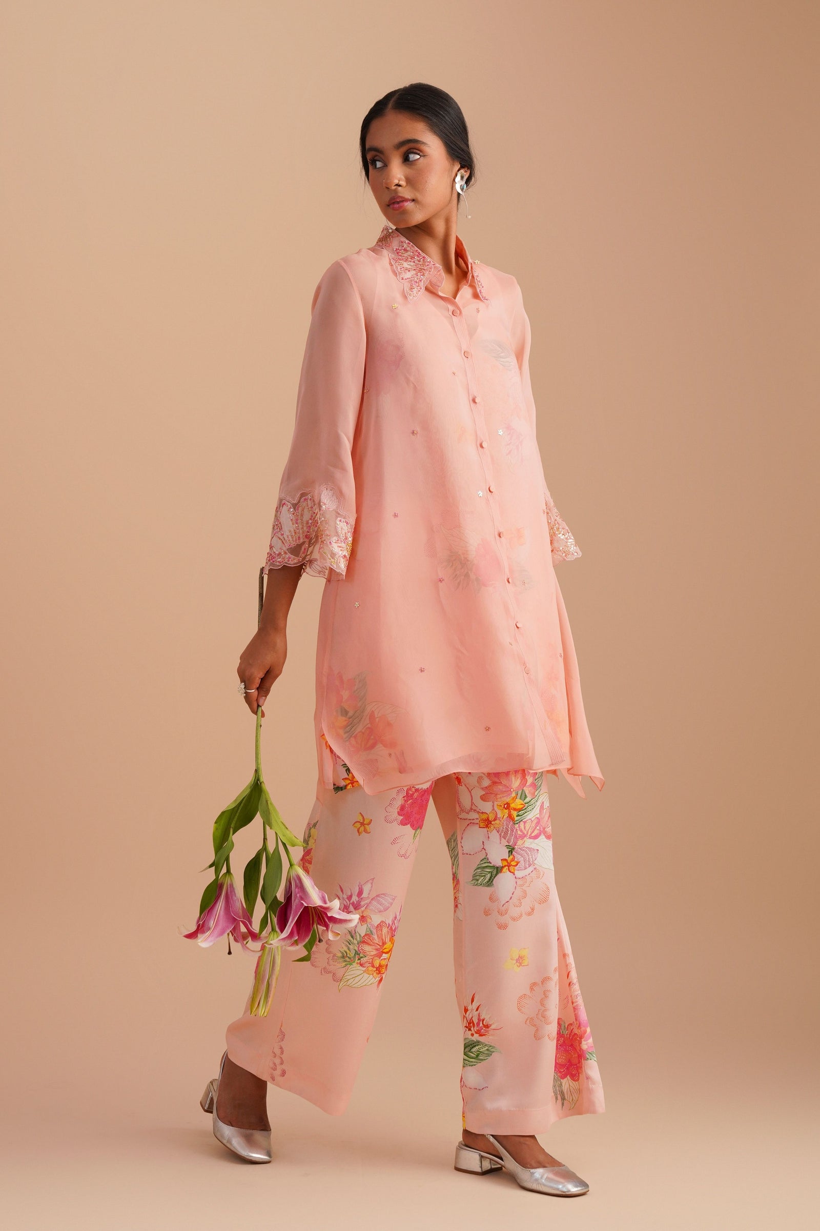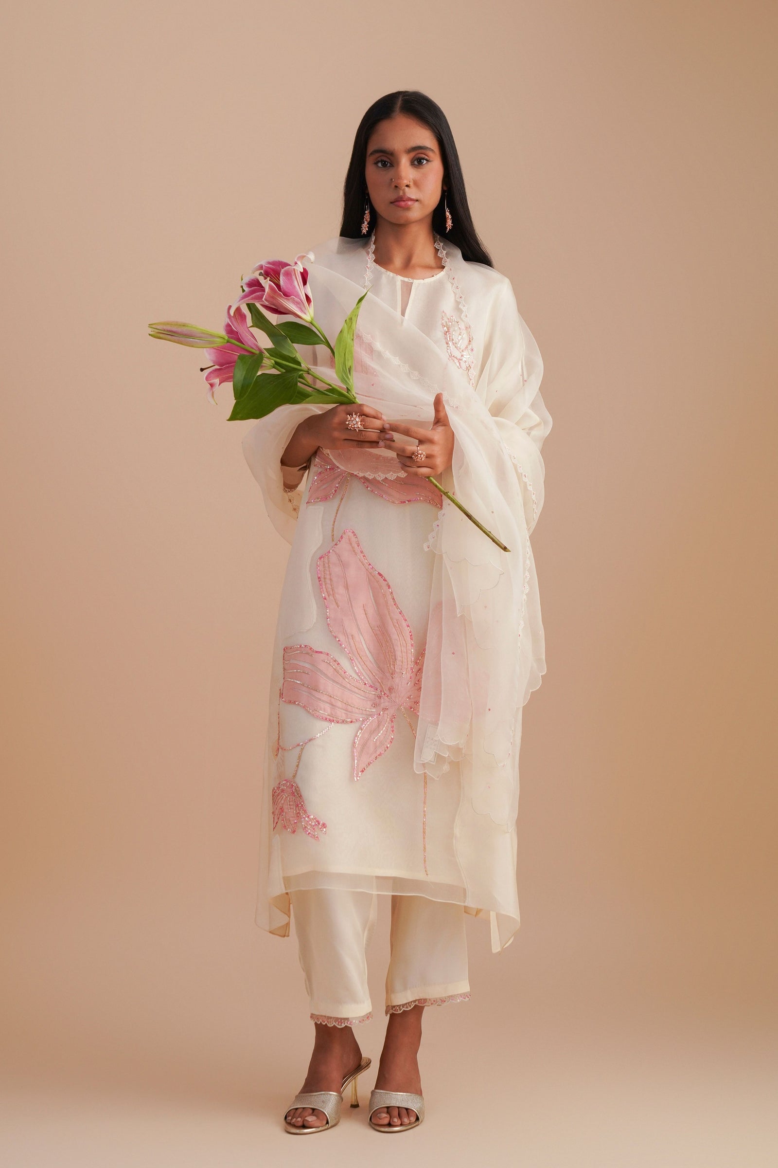 • Featuring a rose pink kalidar kurta set with delicate floral embroidery.