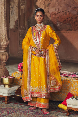 • A graceful long a-line kurta paired with palazzos and a silk organza dupatta. The kurta features a zero neckline with placket and three-quarter sleeves. Adorned with intricate kashmiri tilla and gota patti embroidery, highlighted with pearls and sequins, the ensemble is beautifully finished with delicate gota detailing.