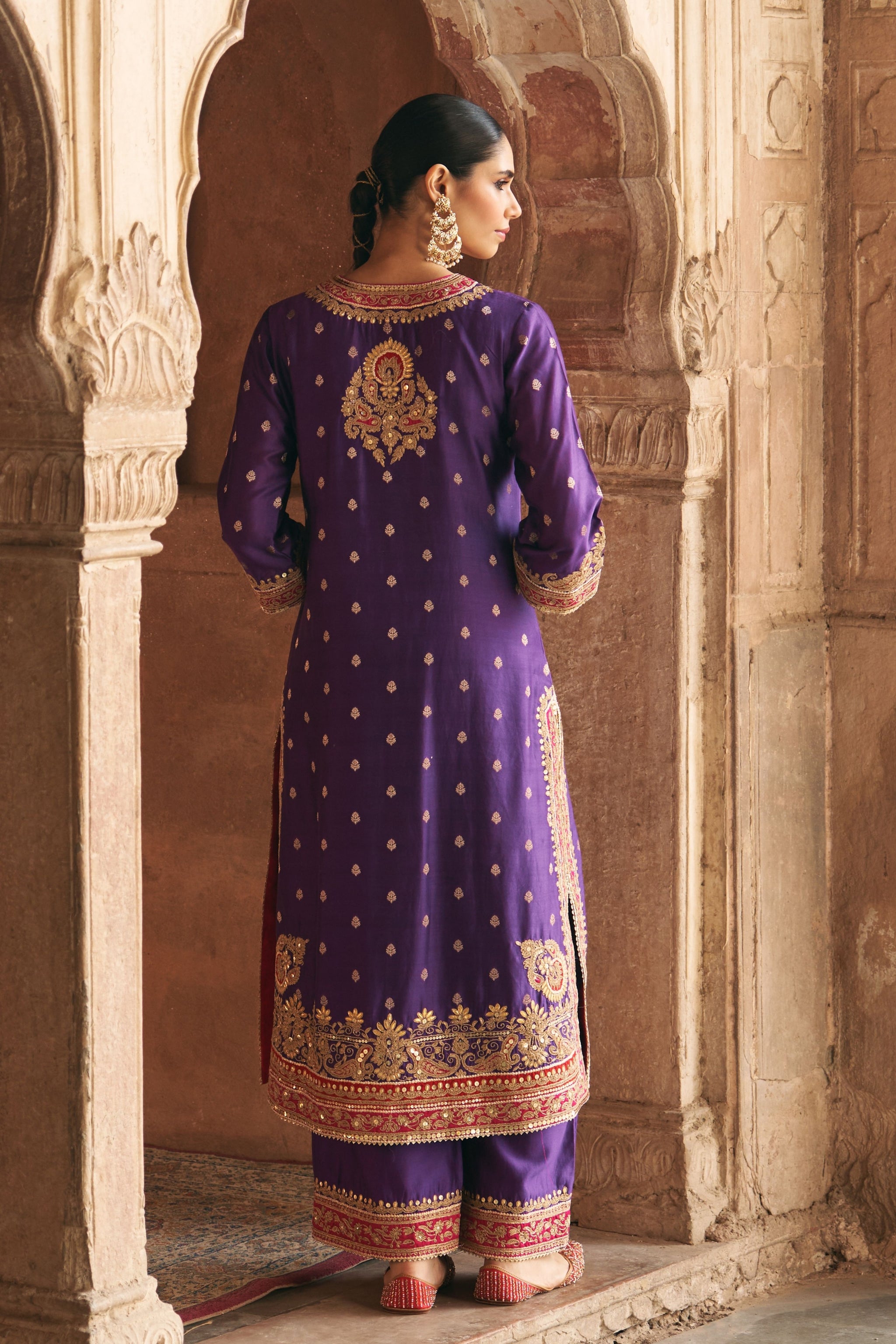 • A graceful long a-line kurta paired with palazzos and a silk organza dupatta. The kurta features a zero neckline with placket and three-quarter sleeves. Adorned with intricate kashmiri tilla and gota patti embroidery, highlighted with pearls and sequins, the ensemble is beautifully finished with delicate gota detailing.
