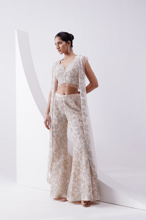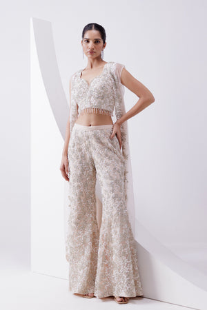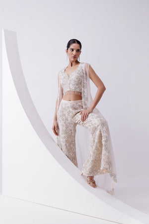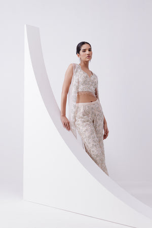• Peach net jacket and pant set with zari and thread work embellished with sequins, cut dana and pearls paired with an embroidered bustier.