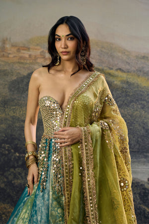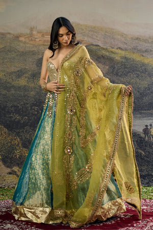 • This set includes a mirror embroidery blouse with jallar latkans, a dual tone tissue panel lehenga, and an embroidered organza dupatta. Disclaimer: color may vary in the tissue fabric since it is hand-woven with metal zari, which can naturally cause slight color variation