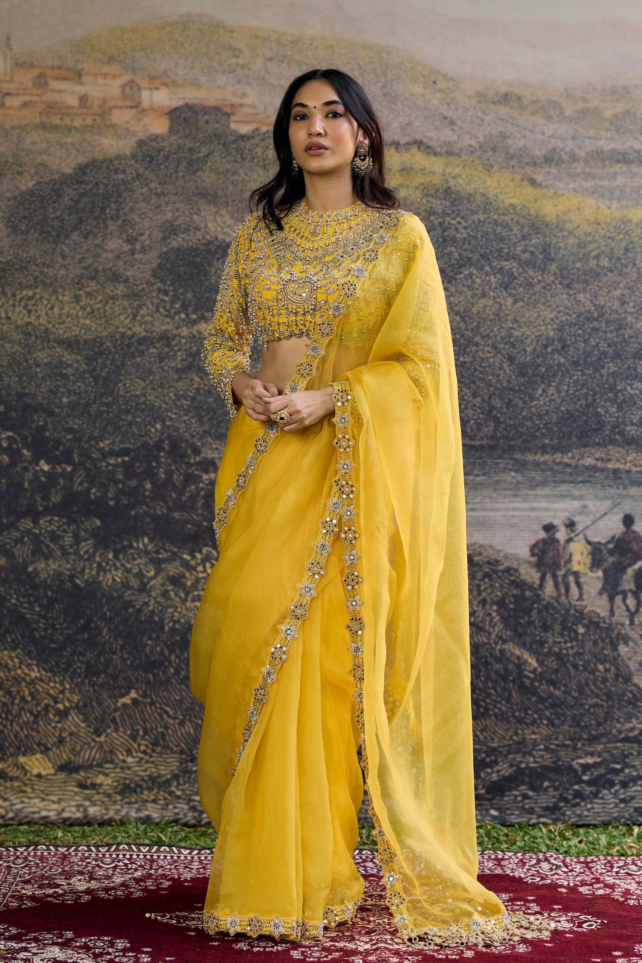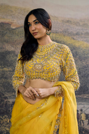 • A yellow organza saree adorned with an intricate embroidered border, exuding understated opulence, paired with a heavily embellished, jewel-detailed and an statement sleeve blouse. A modern classic designed for festive soirées and bridal celebrations.