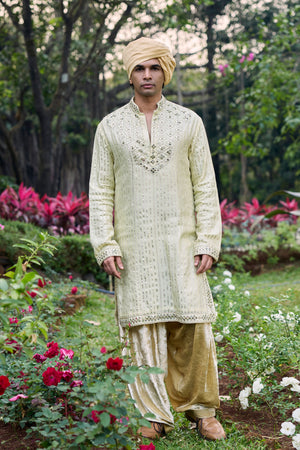 • Gold chanderi kurta with mirror work on neckline and full sleeves paired with a white velvet pants.