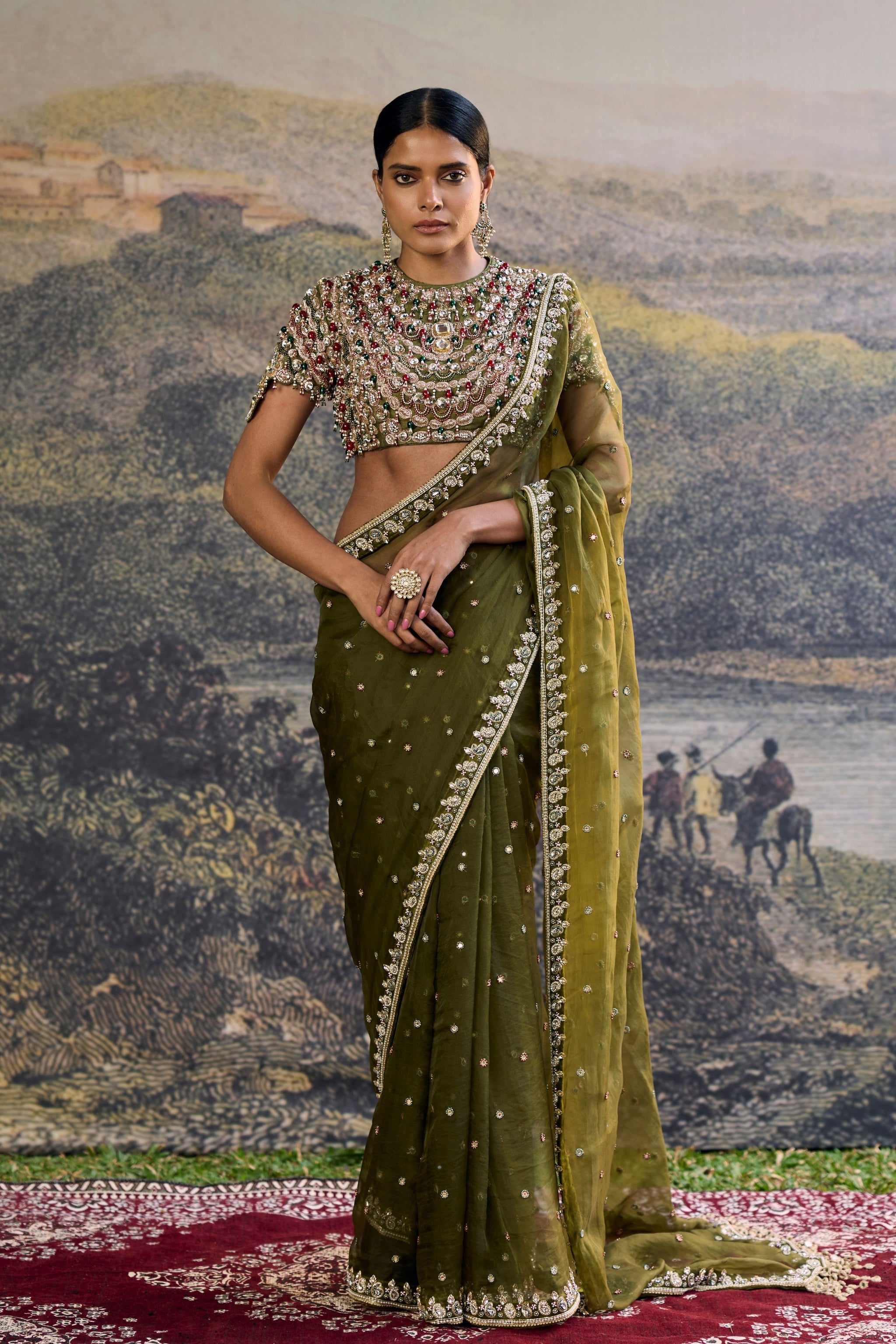 • A olive organza saree adorned with an intricate embroidered border, exuding understated opulence, paired with a heavily embellished, jewel-detailed blouse. A modern classic designed for festive soirées and bridal celebrations.