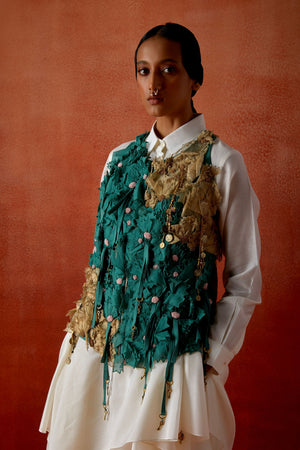 • 3d flower racer back jacket with draped shirt and embroidered denim pants
