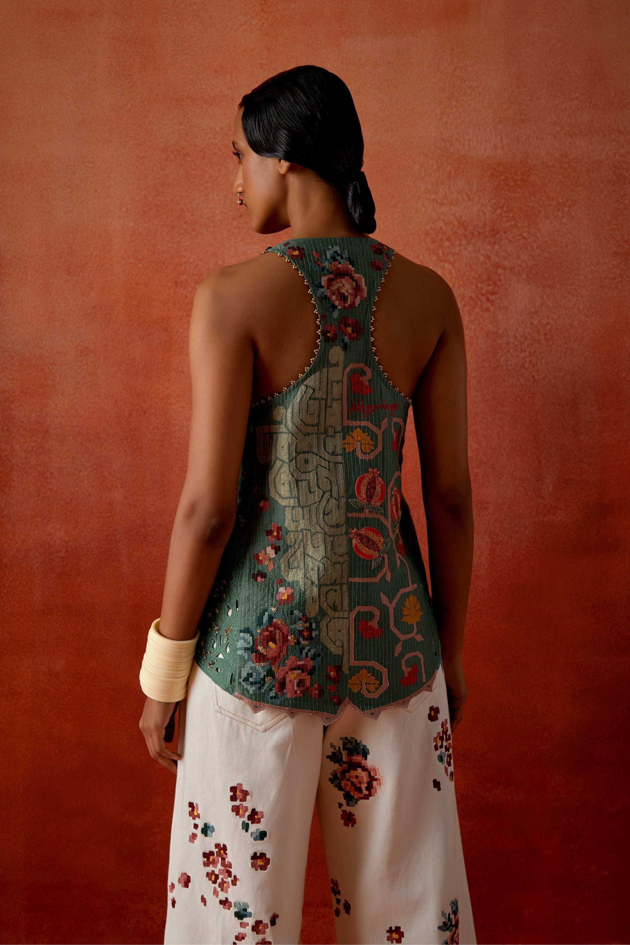 • Embroidered racerback angrakha style jacket with embroidered denim pants