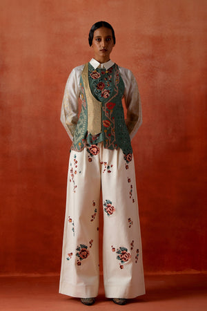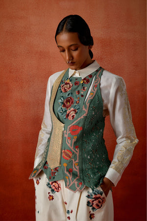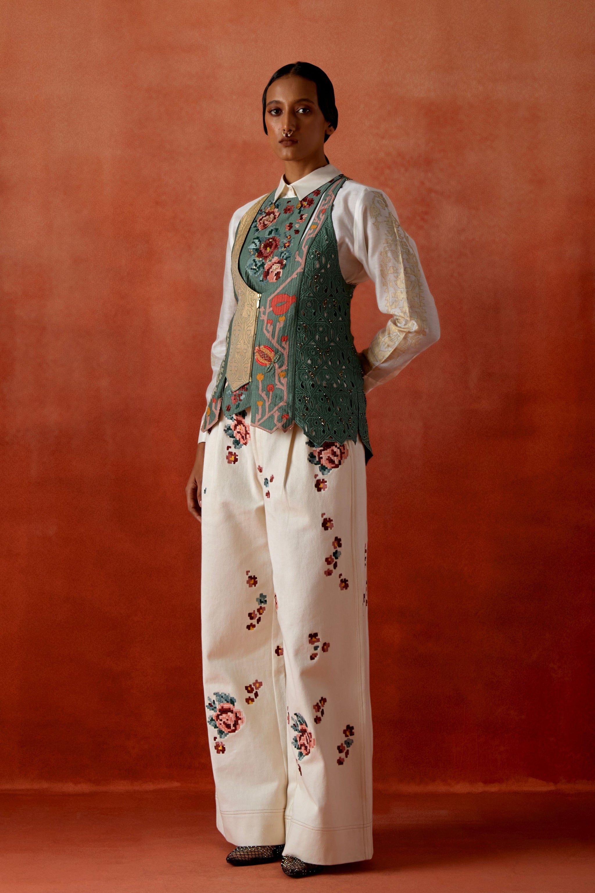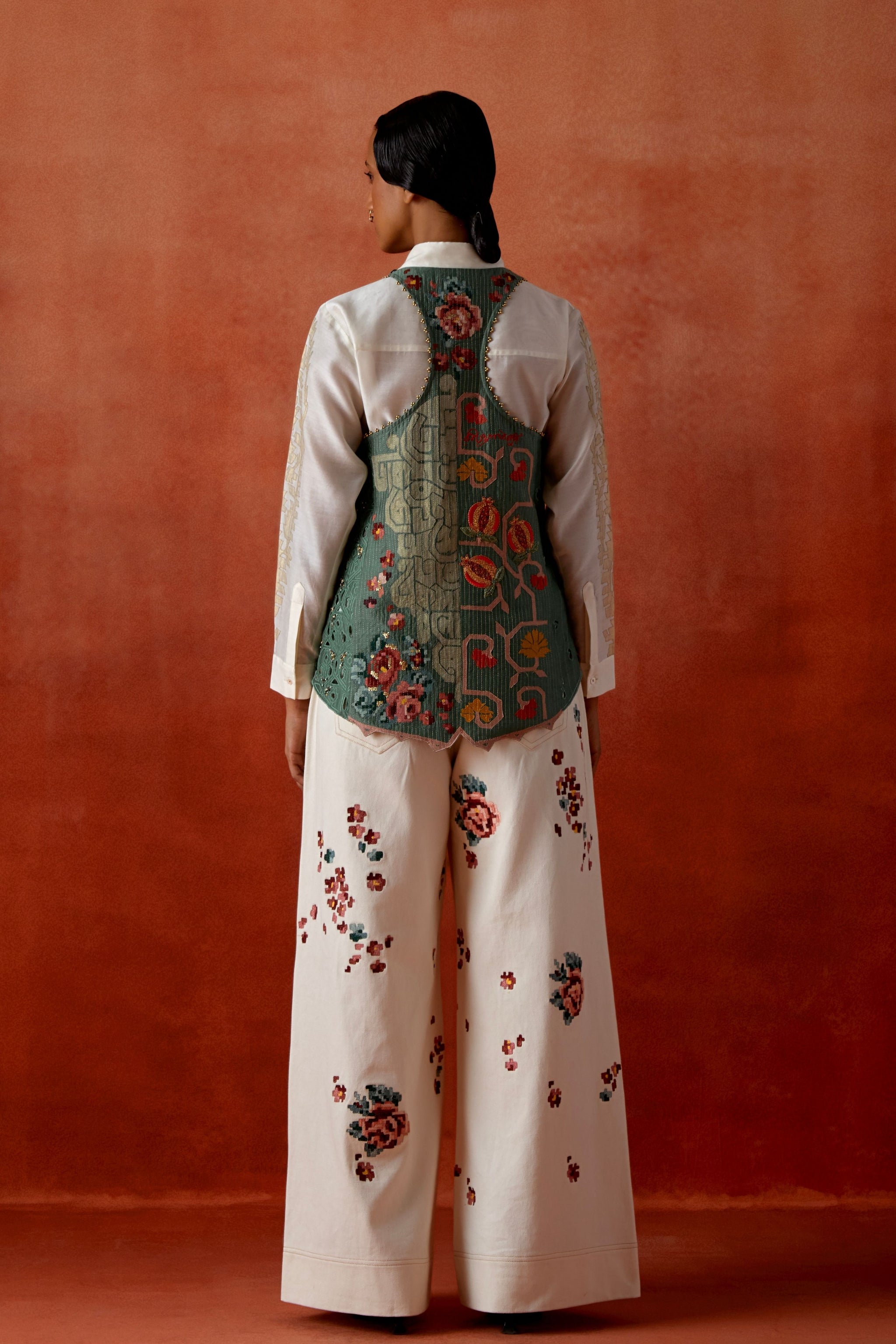 • Embroidered sleeved shirt with embroidered racerback angrakha style jacket and embroidered denim pants