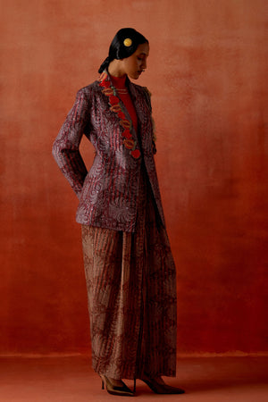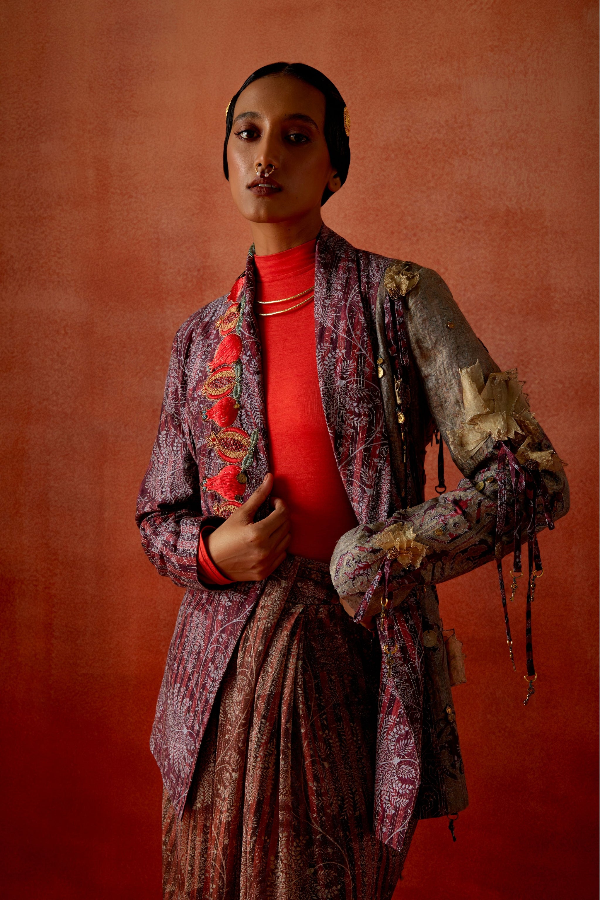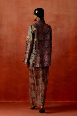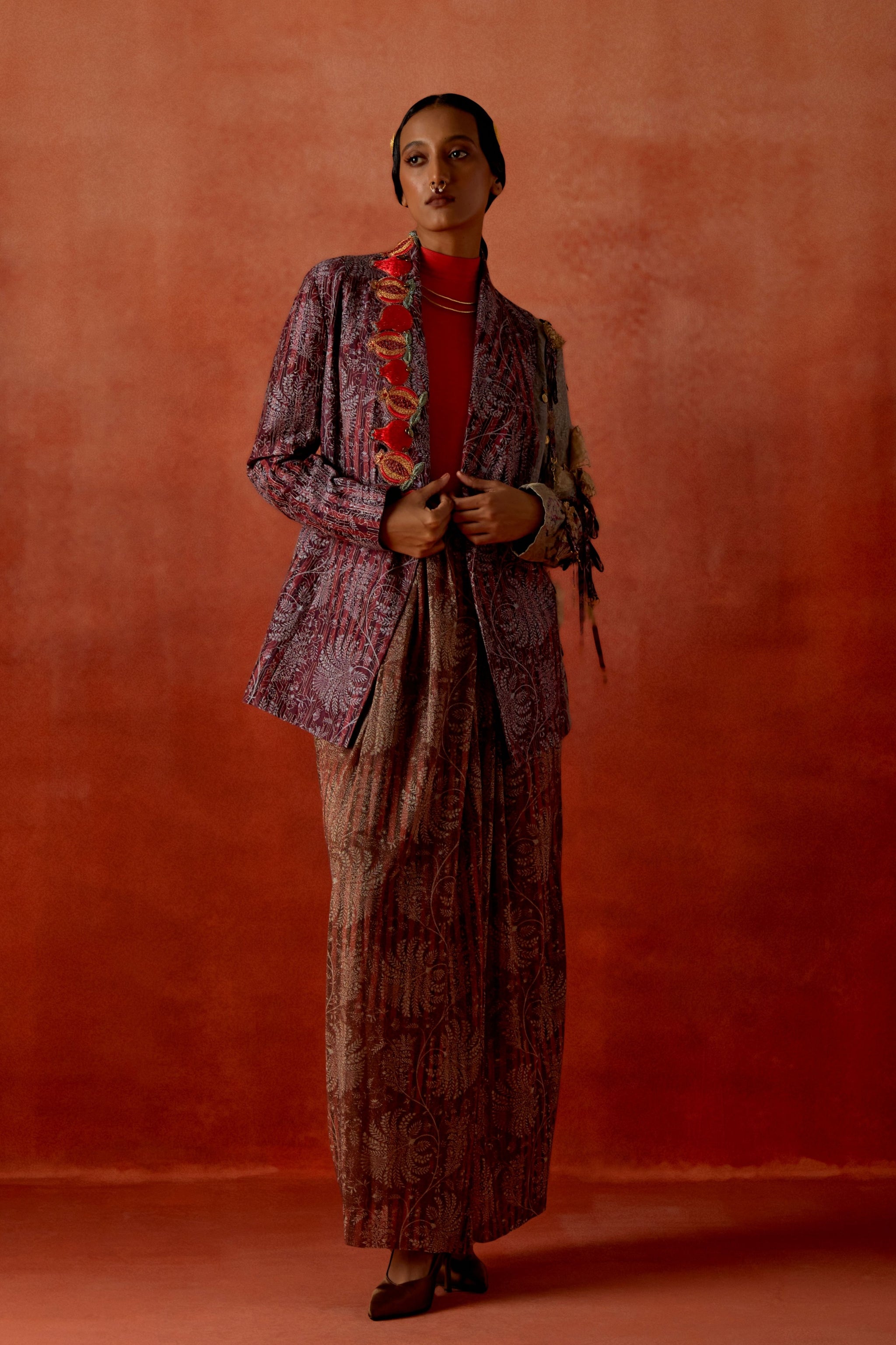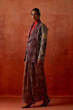 • Pomegranate embroidered double lapel jacket with gold draped skirt