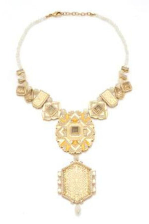• The essence this statement necklace features meticulously chosen stones like morning star, ornate ivory, and lucid dream-set on rich enamel work. The decadent design detailing juxtaposed with smooth lines and sharp edges makes this an iconic piece of jewelry. Made with recycled brass and equipped with above-industry standard quality and thickness of protective layering, anti-allergen coating, and an antique gold finish, with lifetime durability on us. you are avoiding the generation of approximately 1,61,000 kg of toxic waste & 3,000 kg of co2 emissions, that mining gold for this jewel would have caused.