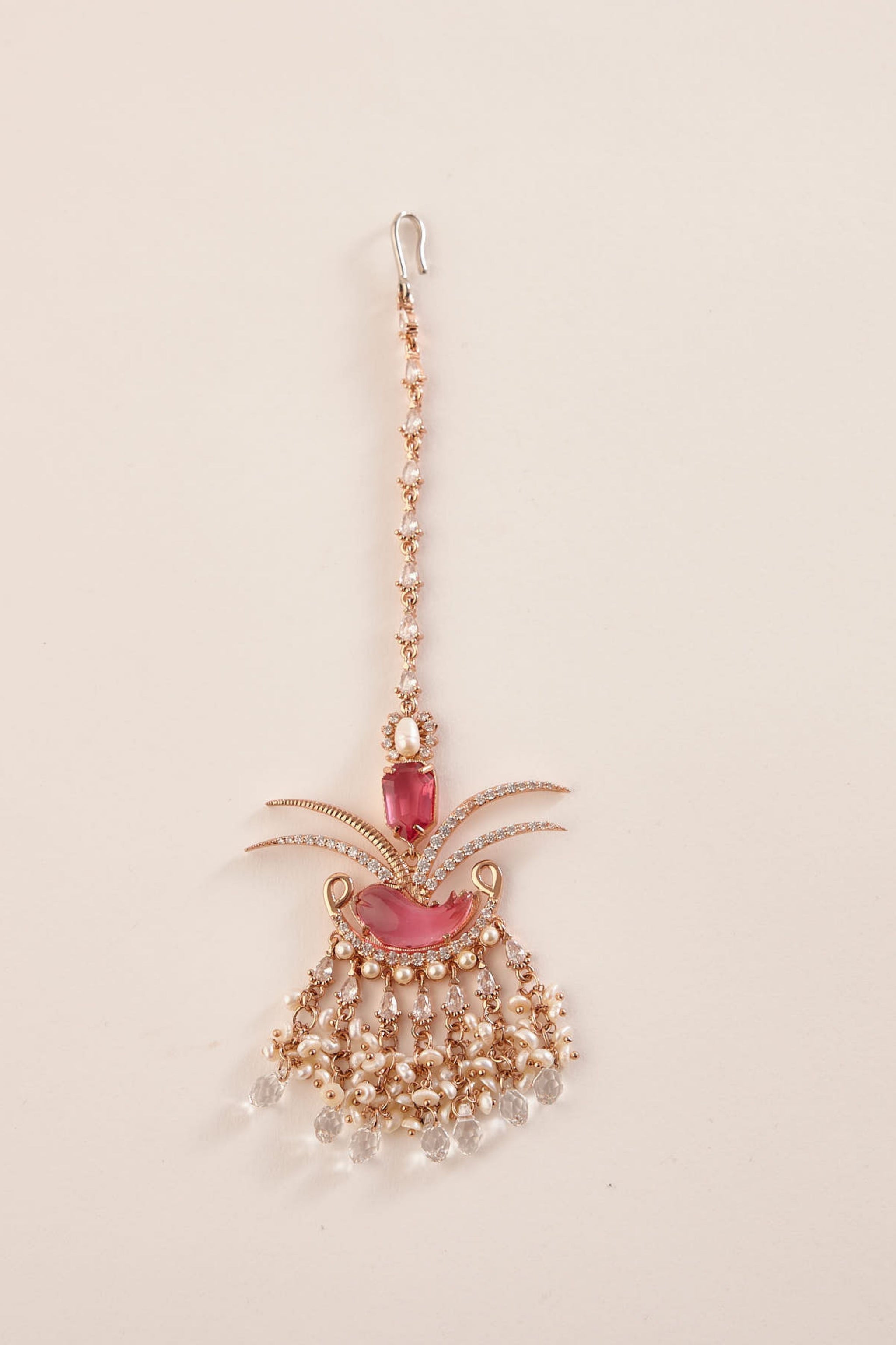 • Encircling the idea of a romantic wedding, the le palm fish maang tikka in vintage rose is delicately put together with Materials like cubic zircoin, carved stones and natural pearls. Featuring the house's signature aesthetic through its core, the earrings are a vivid interpretation of bridal couture, finished in 22kt gold for elevating your special day with its prismatic presence.