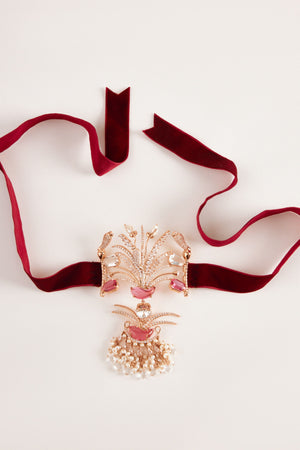 • Crafted in the most riveting shades, the le sunset fish choker necklace in vintage rose is handmade to perfection in cubic zircon, carved stones and baguette- a true masterpiece. Doubled up with a vivid combination of Materials and an impeccable 22kt gold plating, the choker is created to grace all kinds of necklines.