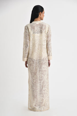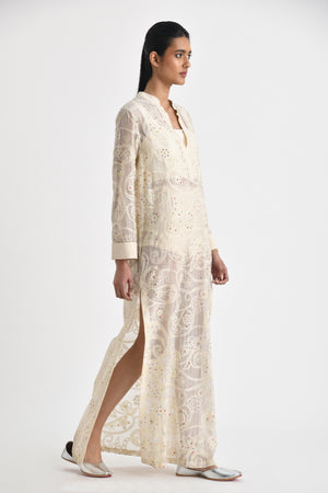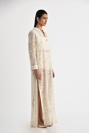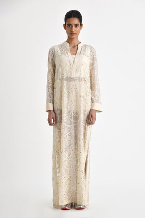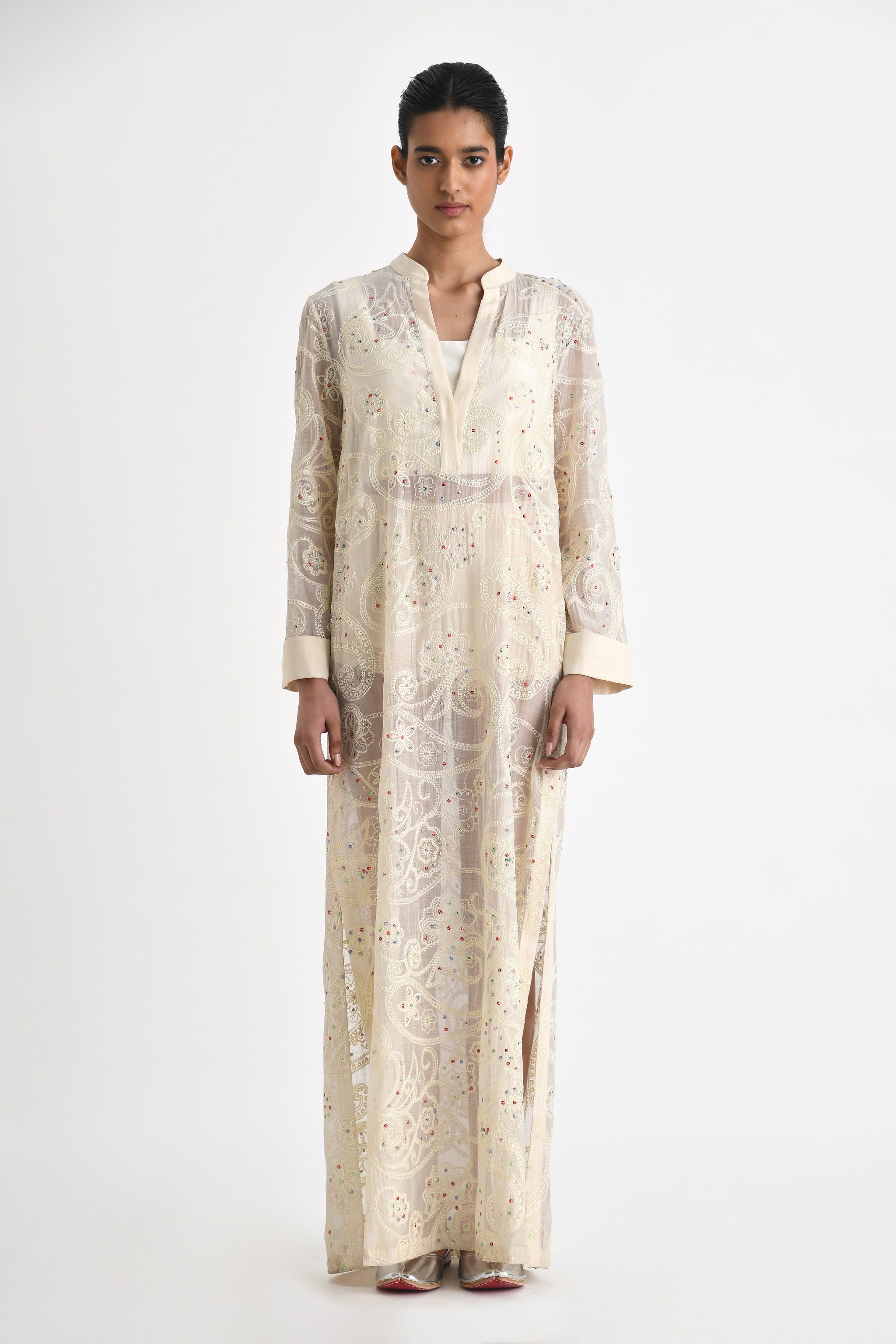 • Band collared v neck embroidered kaftan. The tonal embroidery embellished with multi coloured sequins makes this kaftan suitable for any special occassion. Comes with an inner cotton voile slip.