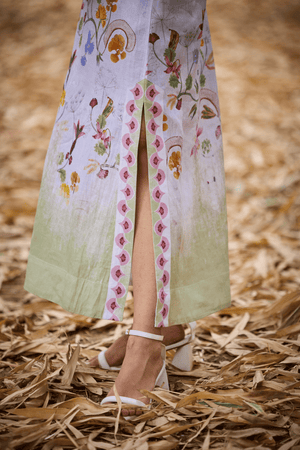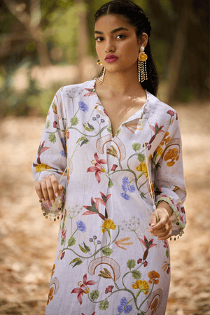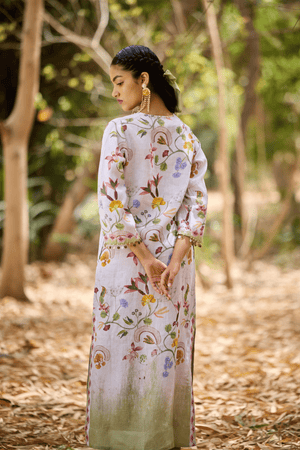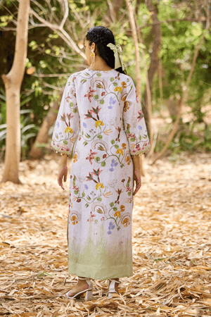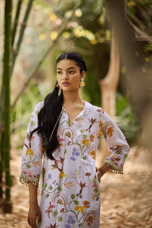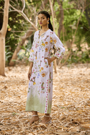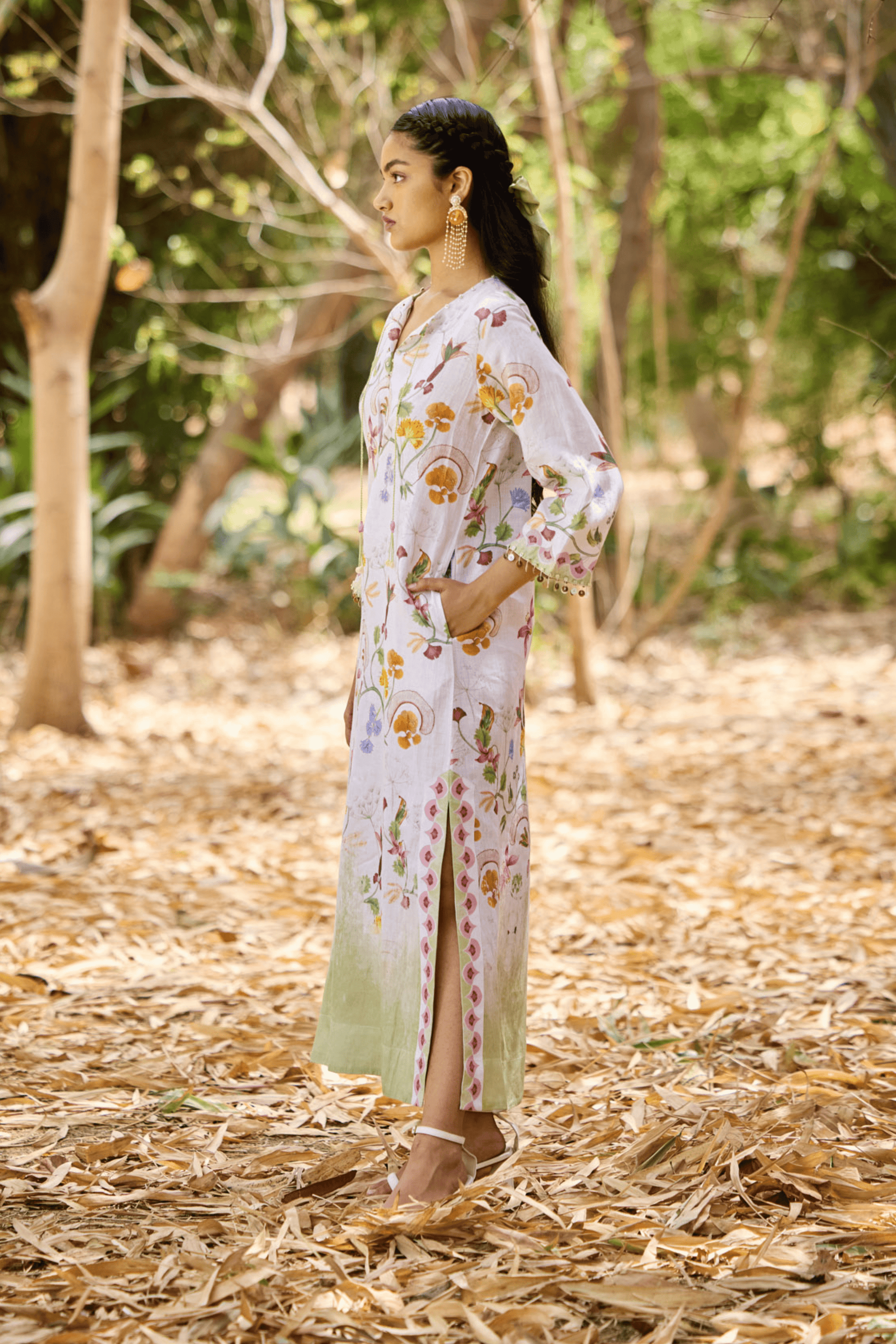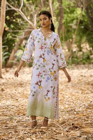 • A brand signature, inspired by Pozruh travels. The ankle-length printed caftan is characterized by elegance and ease. It is detailed with decorative shell tassels at the neckline and the sleeve cuffs . Other attributes: Pure Hemp fabric Absorbs CO making it a cleaner, greener fabric. Digitally printed Standard length - 50" Handcrafted ethically Primary color off white