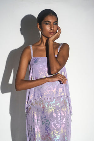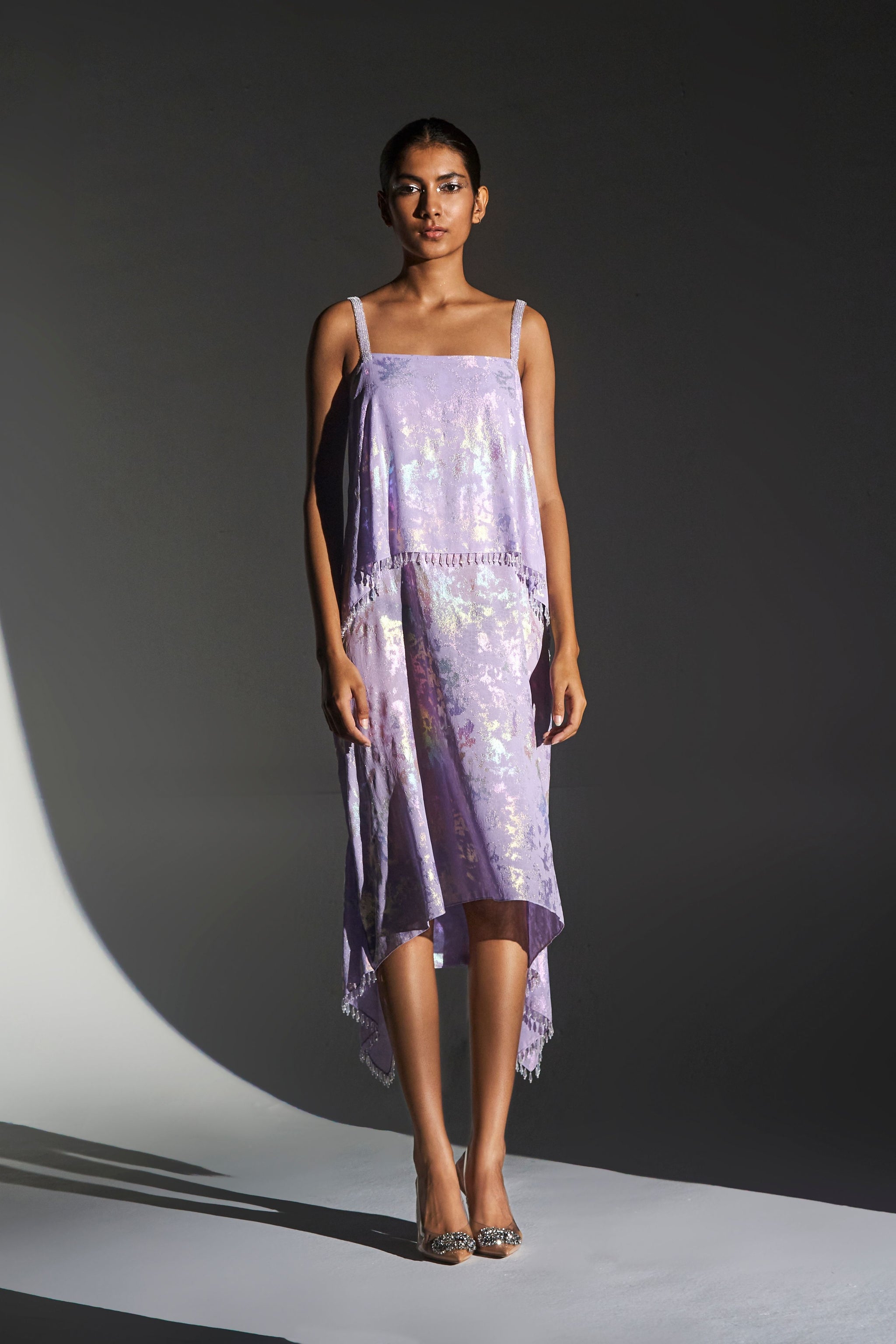• With a luxurious surface that glistens with a holographic metallic print, crystals along the high low hemline, this lilac dress will catch the light with every strut.