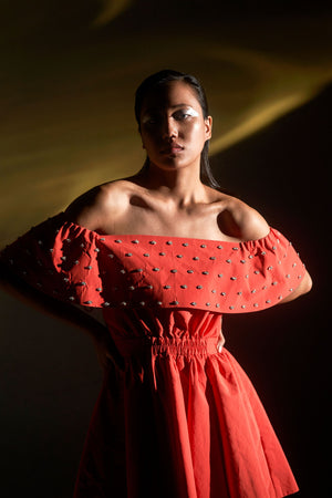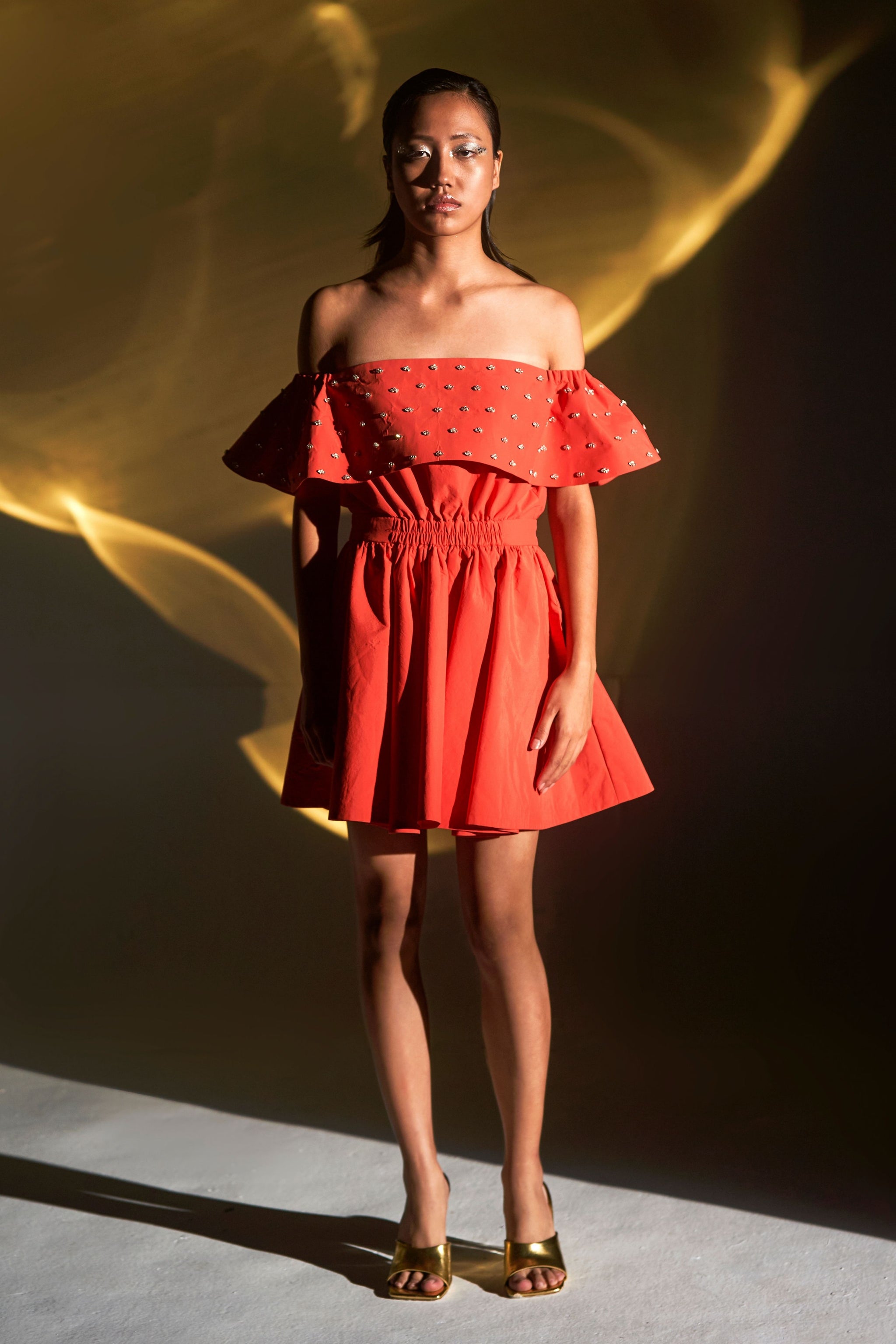 • A structured off-shoulder dress, with an elasticised waist to flatter your body. The sparkling embellishments on the bright orange accentuate the design seamlessly.