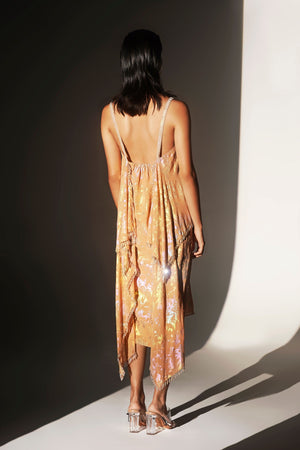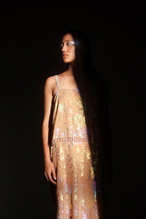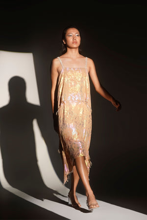 • With a luxurious surface that glistens with a holographic metallic print, crystals along the high low hemline, this peach dress will catch the light with every strut.