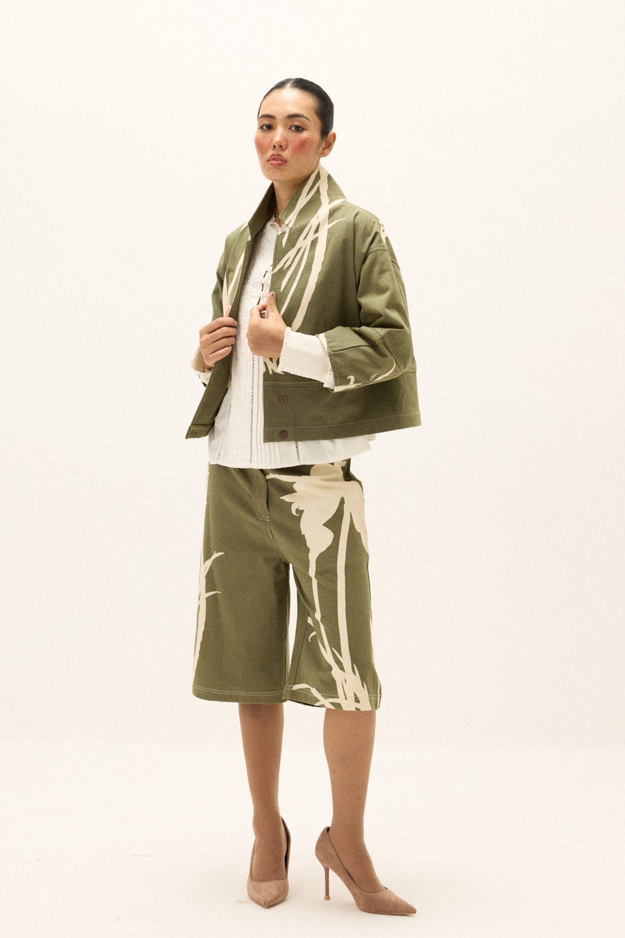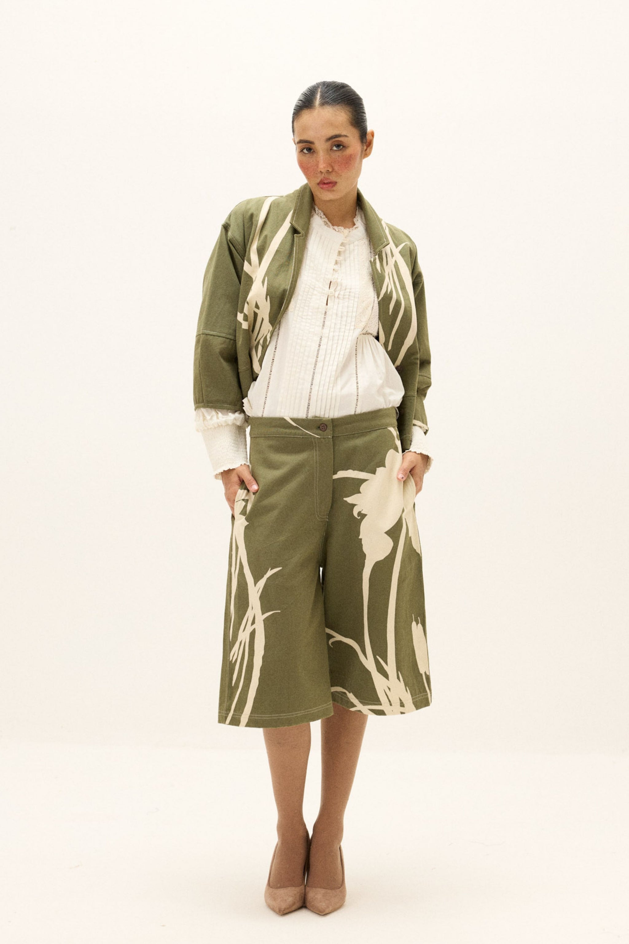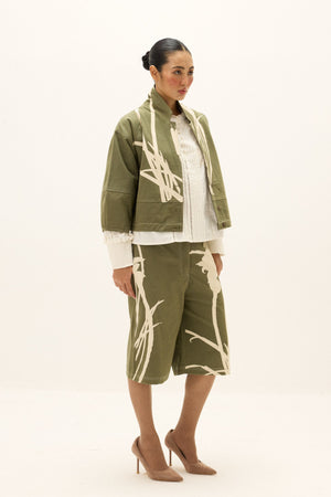 • An elevated utility-inspired co-ord set crafted in sturdy cotton twill, featuring bold ivory botanical prints against a muted sage green base. The cropped jacket with drop shoulders and boxy sleeves pairs effortlessly with tailored knee-length shorts, offering structure with ease. A modern silhouette that blends comfort, craft, and contemporary form.