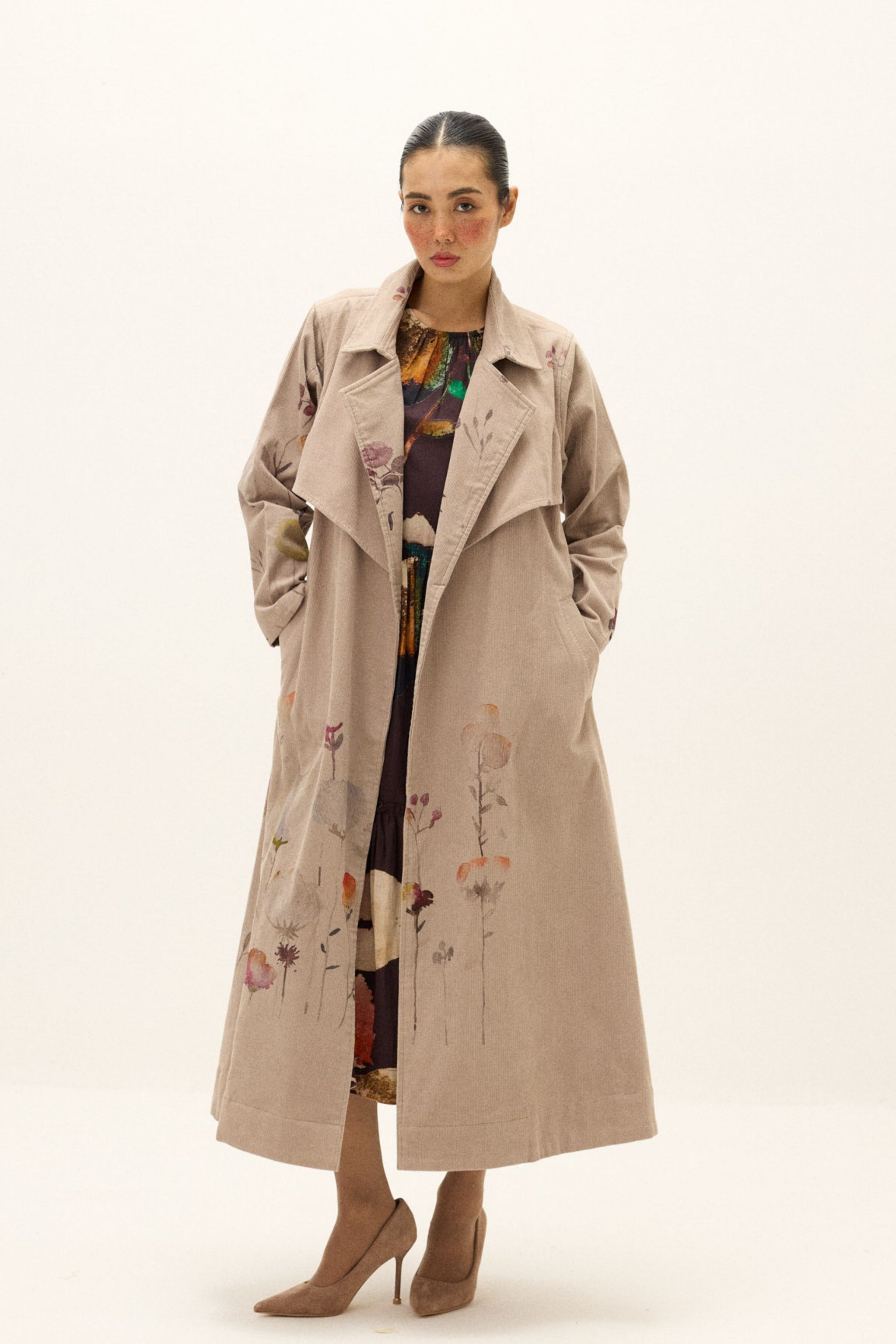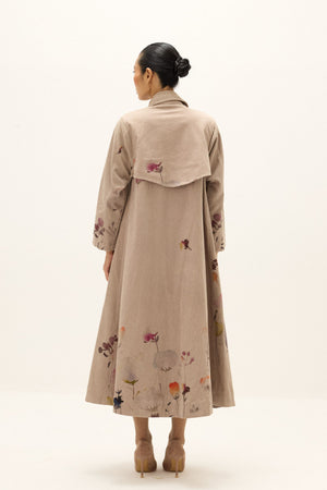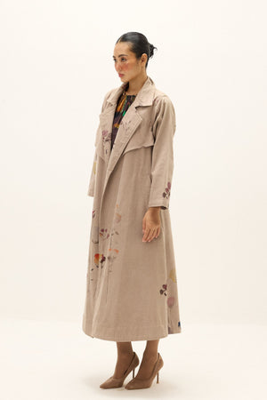 • Cut in soft corduroy, the taupe trench coat brings together classic tailoring and artisanal detail. Its longline silhouette is finished with a wide notched lapel and relaxed shoulders, making it ideal for layering. Delicate floral motifs, rendered in painterly strokes across the front, sleeves, and back, add a subtle yet striking accent. Sleeve length- 21", Garment length- 49".