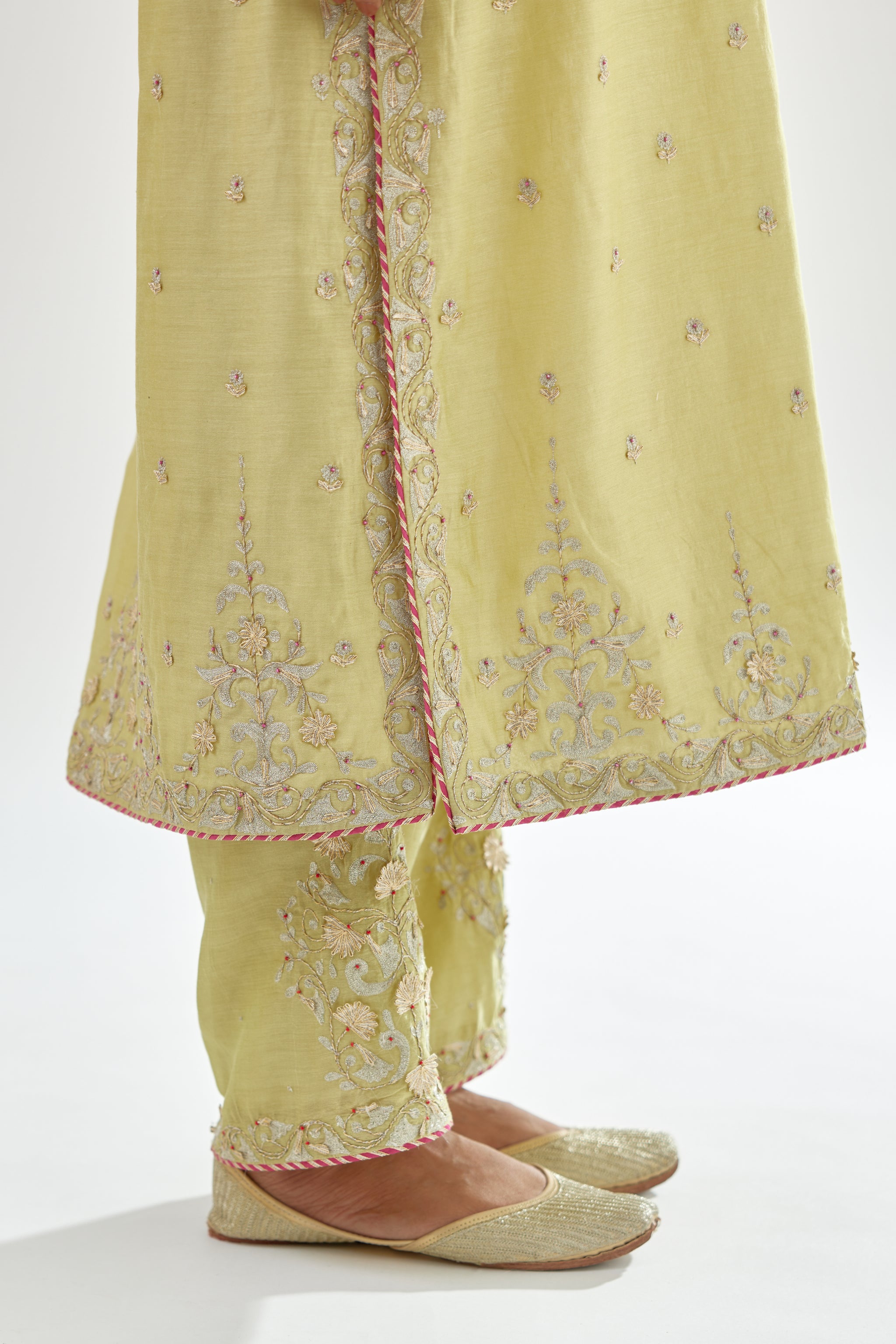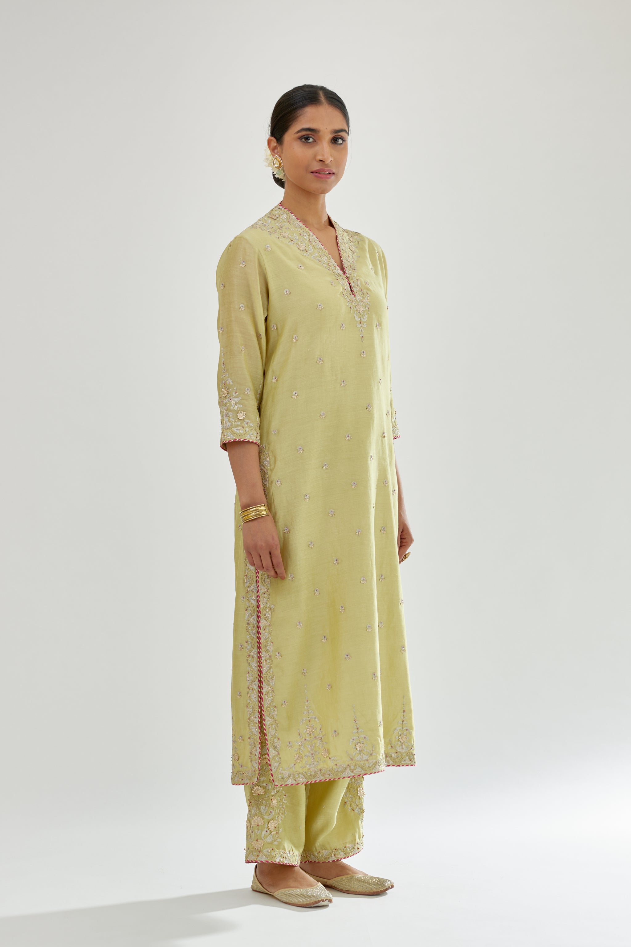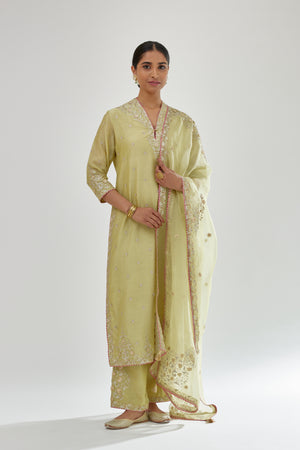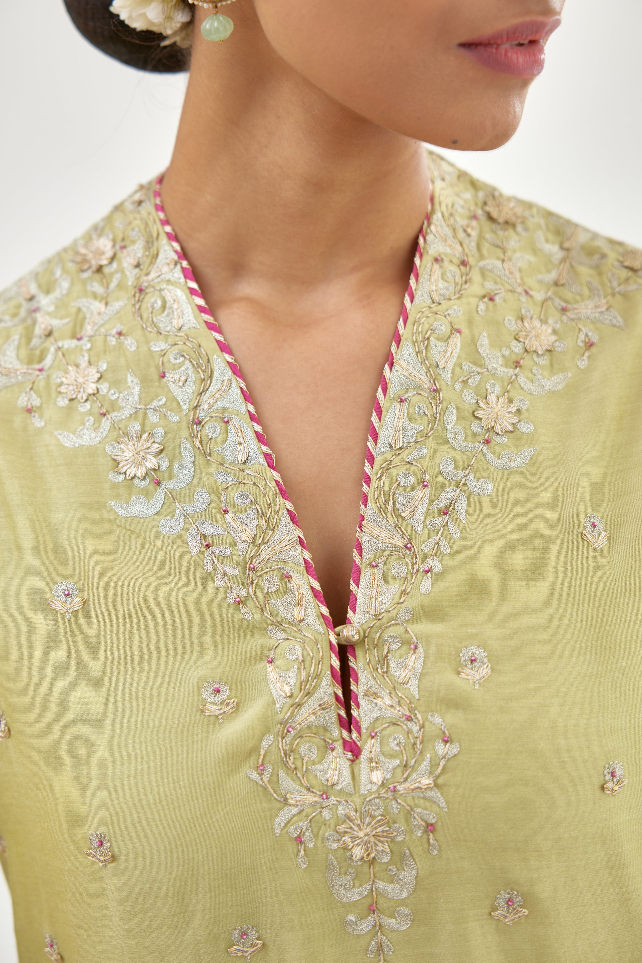 • Green silk chanderi straight kurta with zari, dori and gota embroidery at front and back neck, sleeves, side slits and hem. The pants are lined with cotton fabric. Comes with a green silk organza dupatta with zari, dori and gota embroidery at the edges finished with gota tassels at the corners. The dupatta is edged with a pink gota piping.