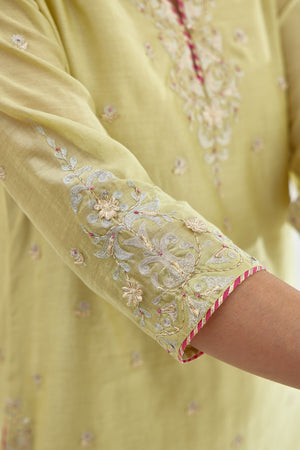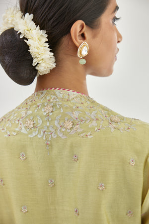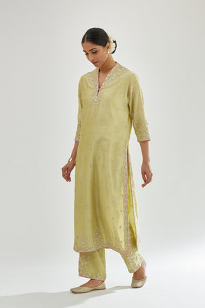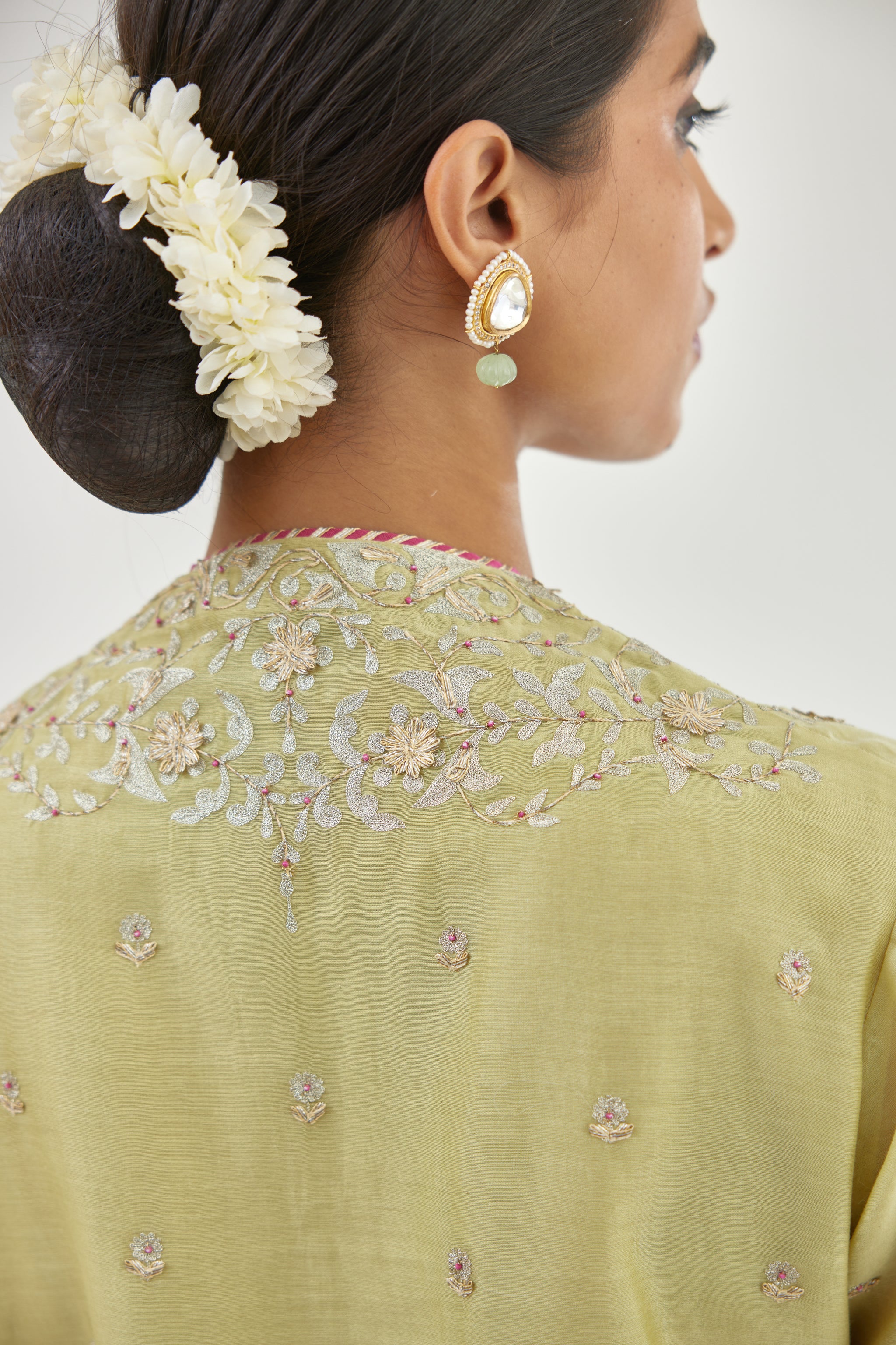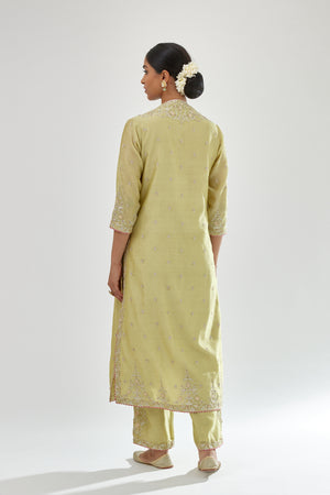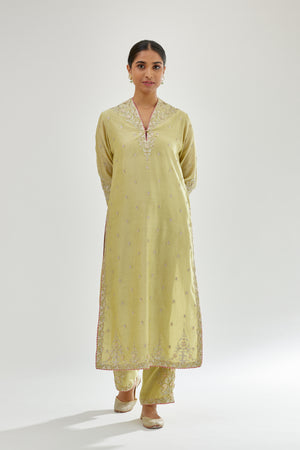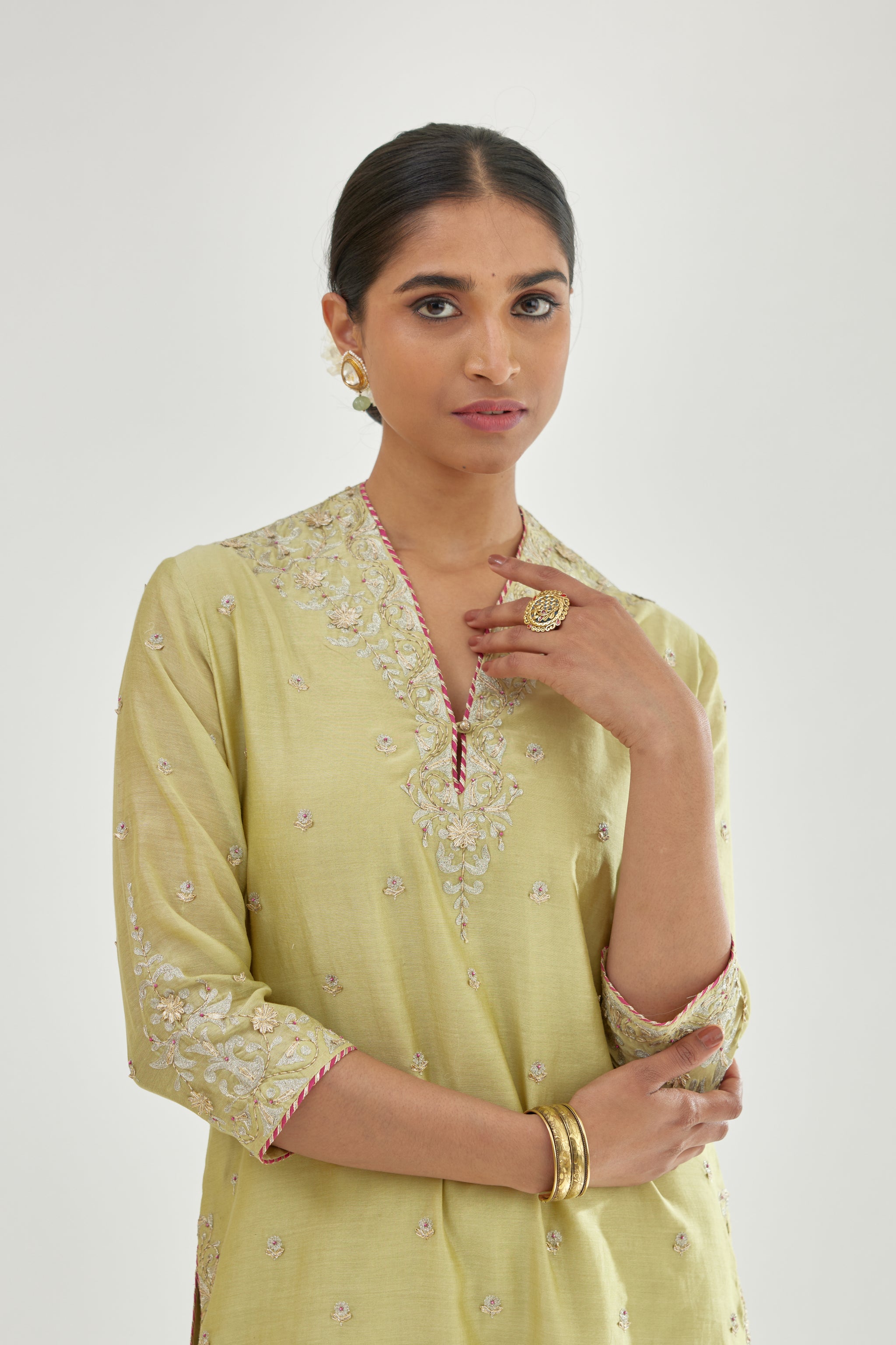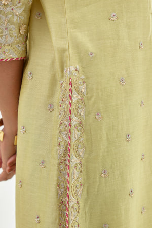 • Green silk chanderi straight kurta with zari, dori and gota embroidery at front and back neck, sleeves, side slits and hem. The pants are lined with cotton fabric. Comes with a green silk organza dupatta with zari, dori and gota embroidery at the edges finished with gota tassels at the corners. The dupatta is edged with a pink gota piping.