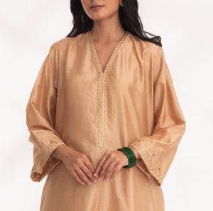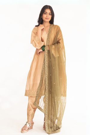• A Beige kurta set paired with salwar, embellished with intricate antique gold zardozi embroidery.