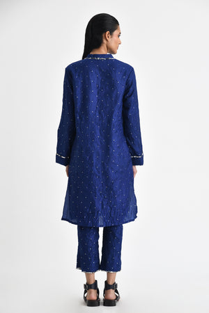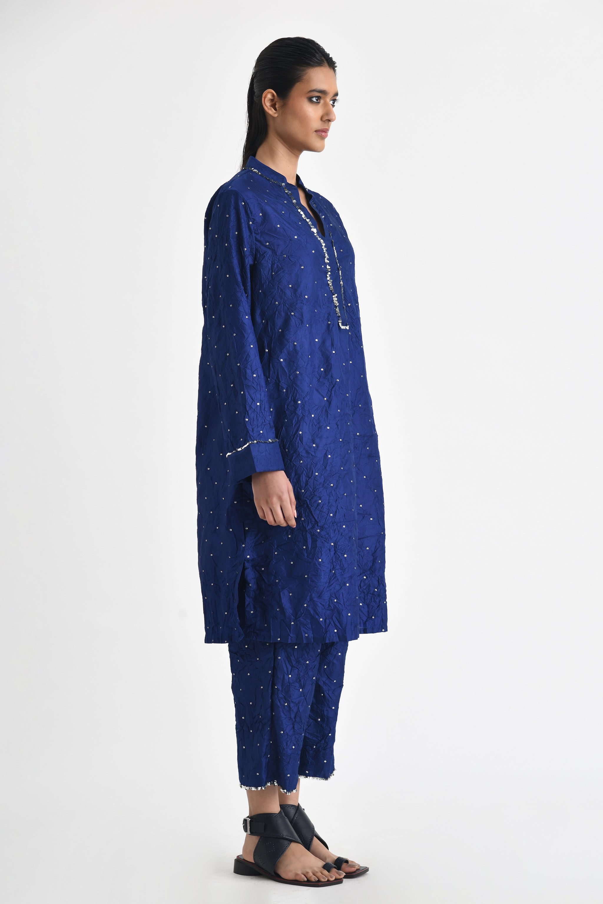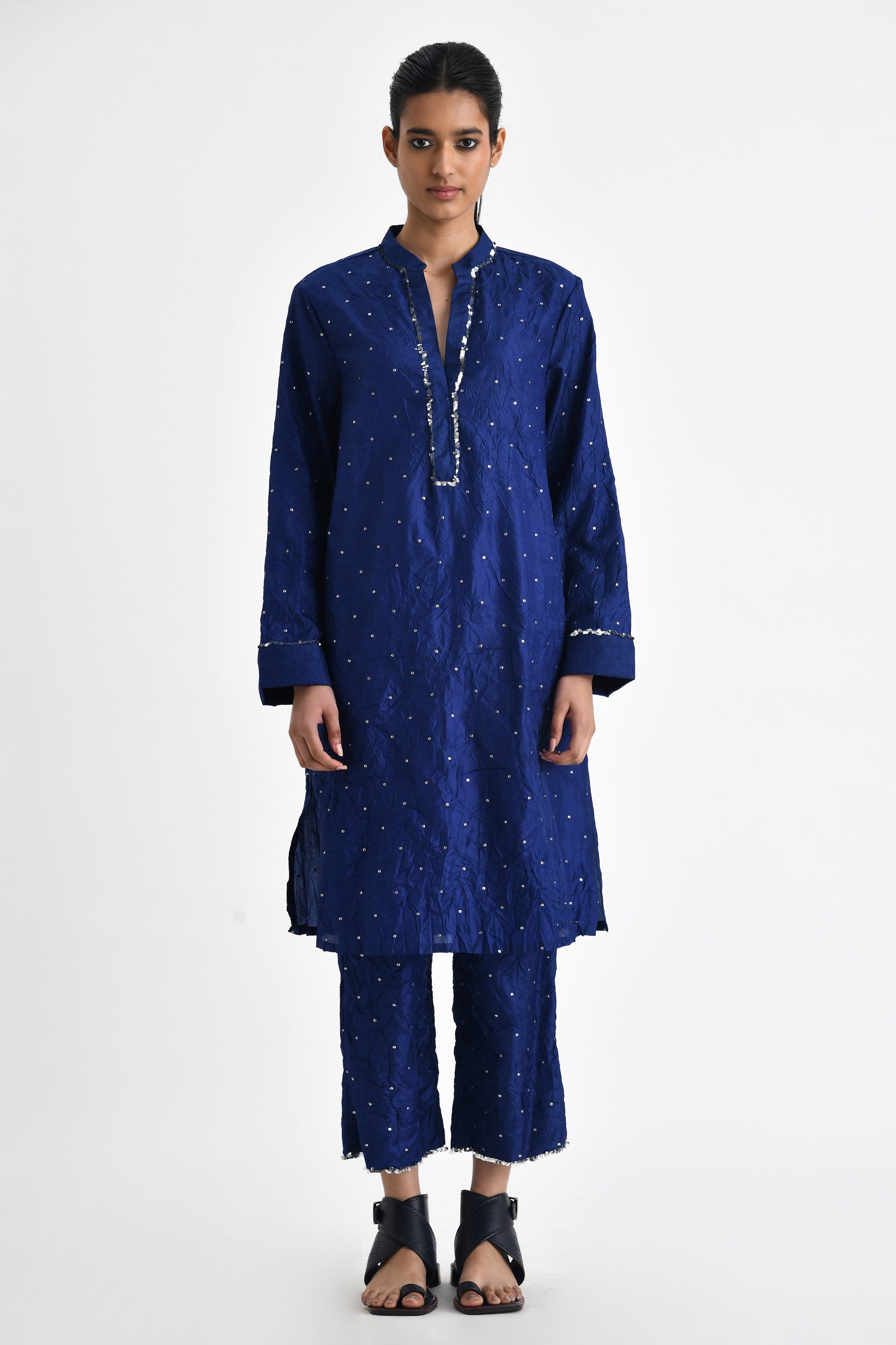 • All over sequin sprinkle v- neck short kurta with a band collar. The sleeve turn-up and neckline is accentuated by sequins. It is paired with straight relaxed fit elasticated pants edged by sequins on the hem.