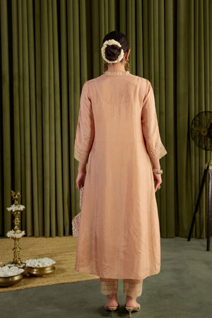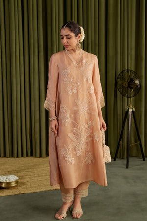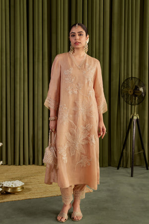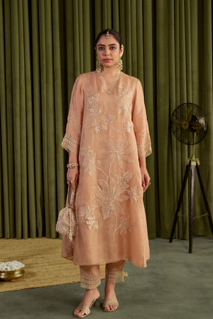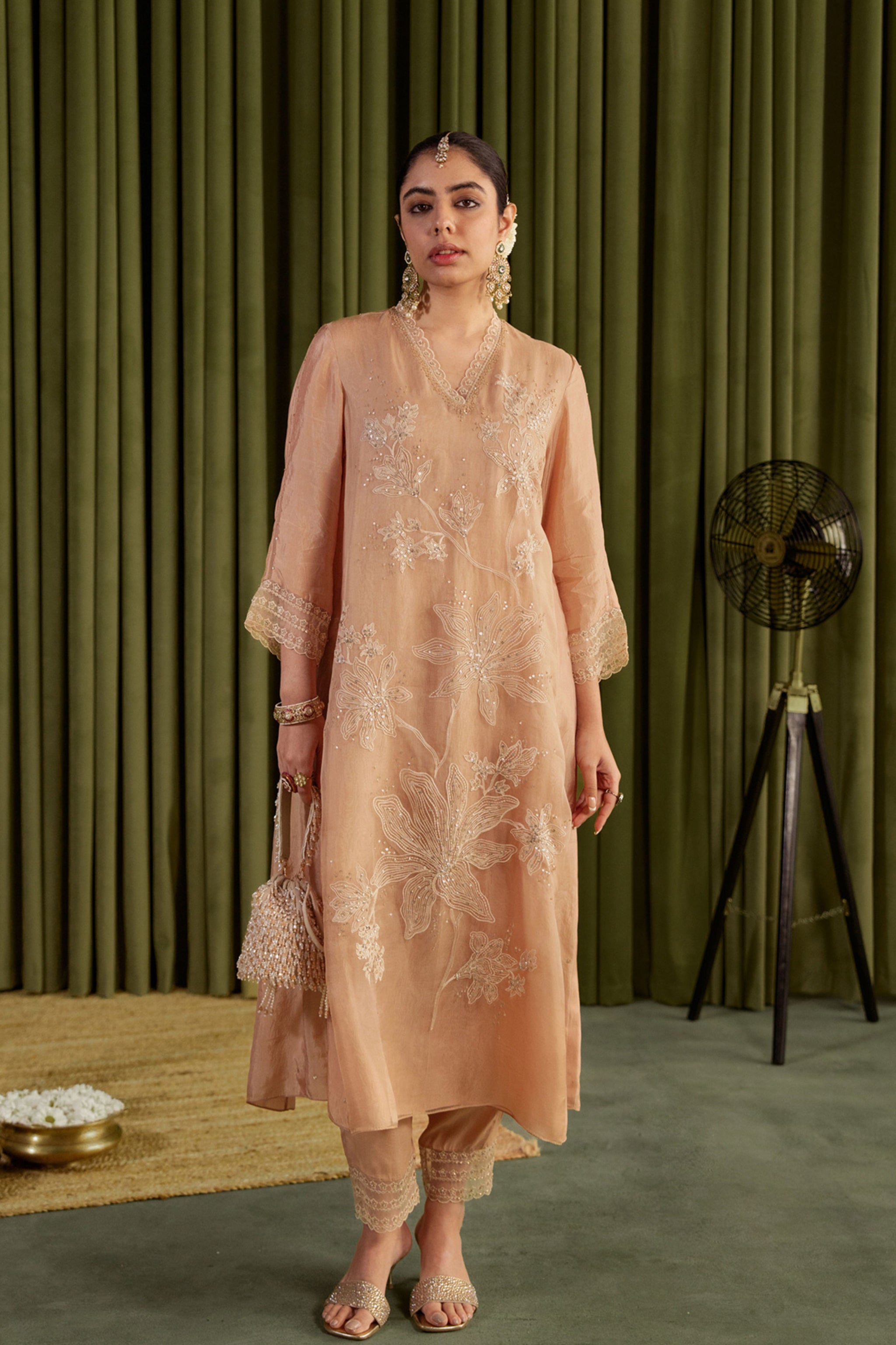 • Featuring a golden beige kurta set with delicate floral embroidery.