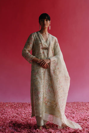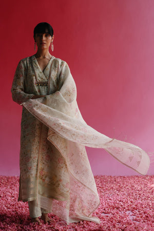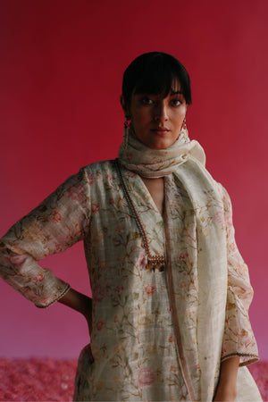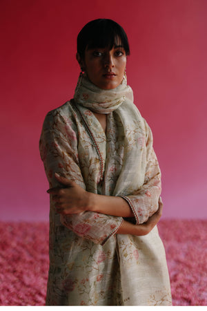 • A pure linen silk handloom sequin weave fabric quarter sleeve a-line kurta printed & hand embroidered using delicate threadwork, delicate beads and brass bohemian tassels. The kurta is complemented with a soft & pure kala cotton handloom straight pants with a side closure. To complete the look, there is given a pure handloom sequin weave fabric printed dupatta with a zari border and handmade tassels.