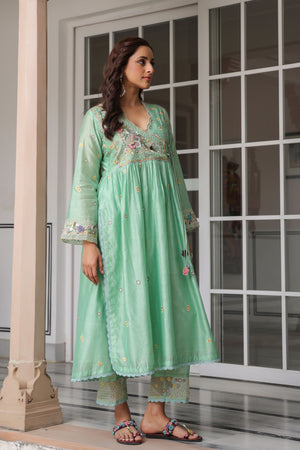 • This 2 piece kurta set comes with heavy floral threadwork embroidery enahnced with handmade 3d flowers and bead work on the yoke, hem of the sleeves and butis spread all over the kurta. It is paired with embroidered pants. Optional embroidered dupatta available on request.