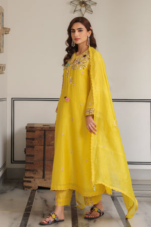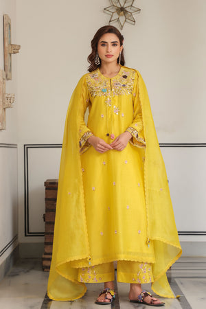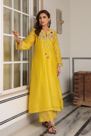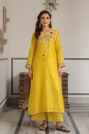 • This 2 piece kurta set comes with heavy floral thread work embroidery enahnced with handmade 3d flowers and bead work on the neckline and sleeves with butis all over the kurta. It is paired with embroidered pants. Optional embroidered dupatta available on request.
