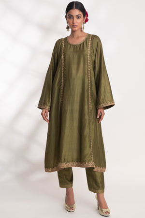• A Henna Green kurta set complemented with salwar, embellished with intricate antique gold zardozi embroidery.