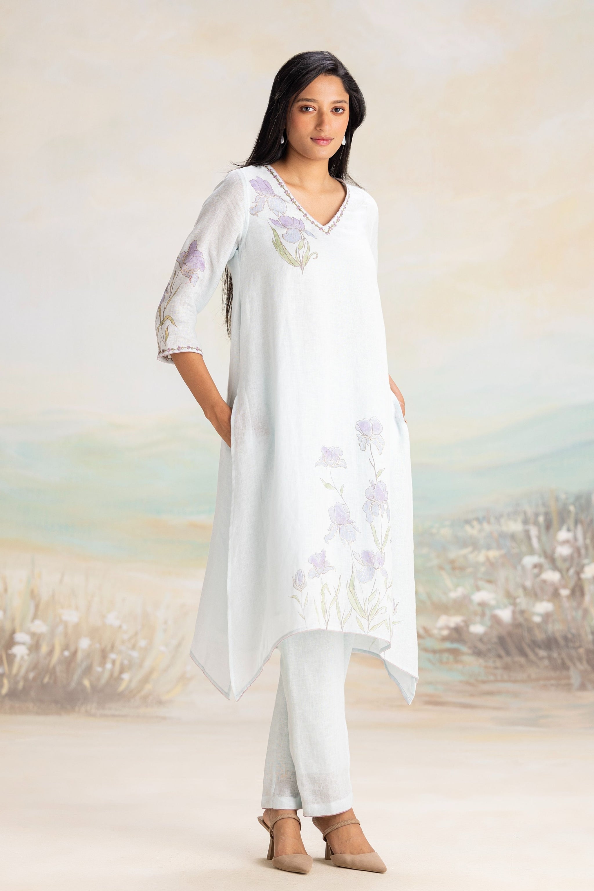 • The design is hand screen-printed to create a watercolor-like effect, with six colors applied in layers using brushstrokes through screens, bringing the iris flowers to life in a soft, flowing pattern.A layer of gold foil is crafted over the printed artwork, adding a striking touch of elegance a delicate floral design, meticulously hand-embroidered with soft cotton threads, creating an intricate and charming pattern.