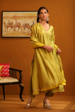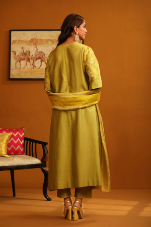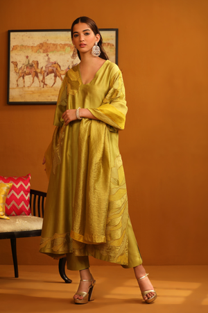 • Featuring our lime green kurta set with oversized floral motifs set in fine embroidery combined with delicate applique patch work. The a-line flowy silhouette ensures comfort and ease paired with matching trousers and accessorized with a beautiful tonal crushed silk dupatta with a contrast finishing.