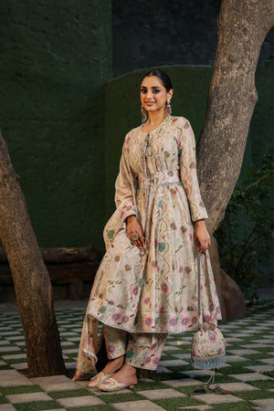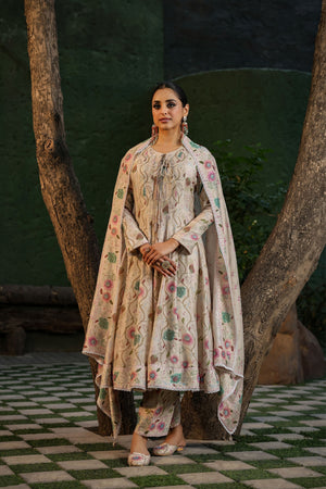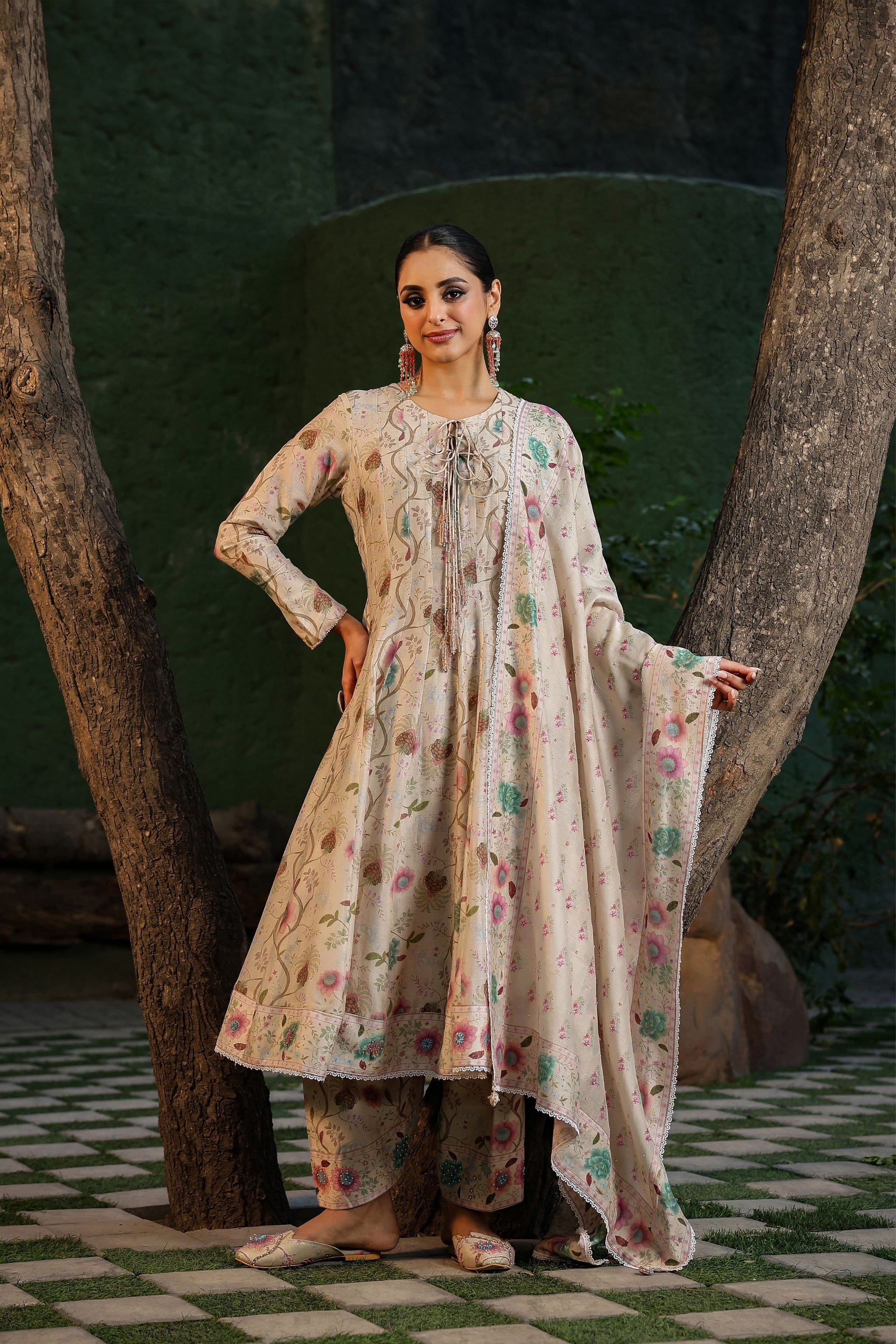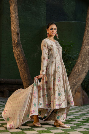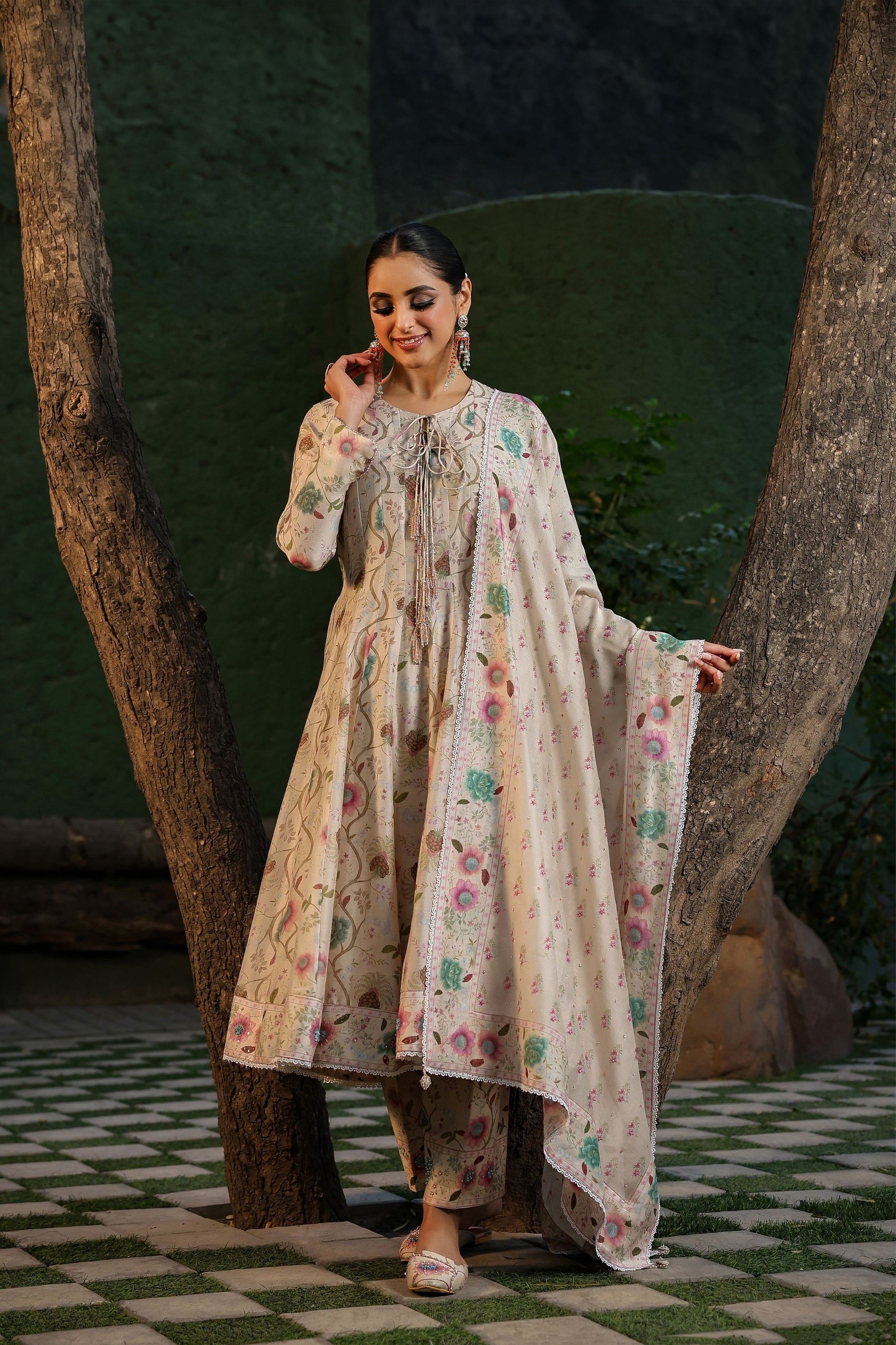 • This 3pc printed kalidar kurta set comes with heavily embroidered neckline and hem line . Also paired with salwar and dupatta carrying embroidery and lacey details