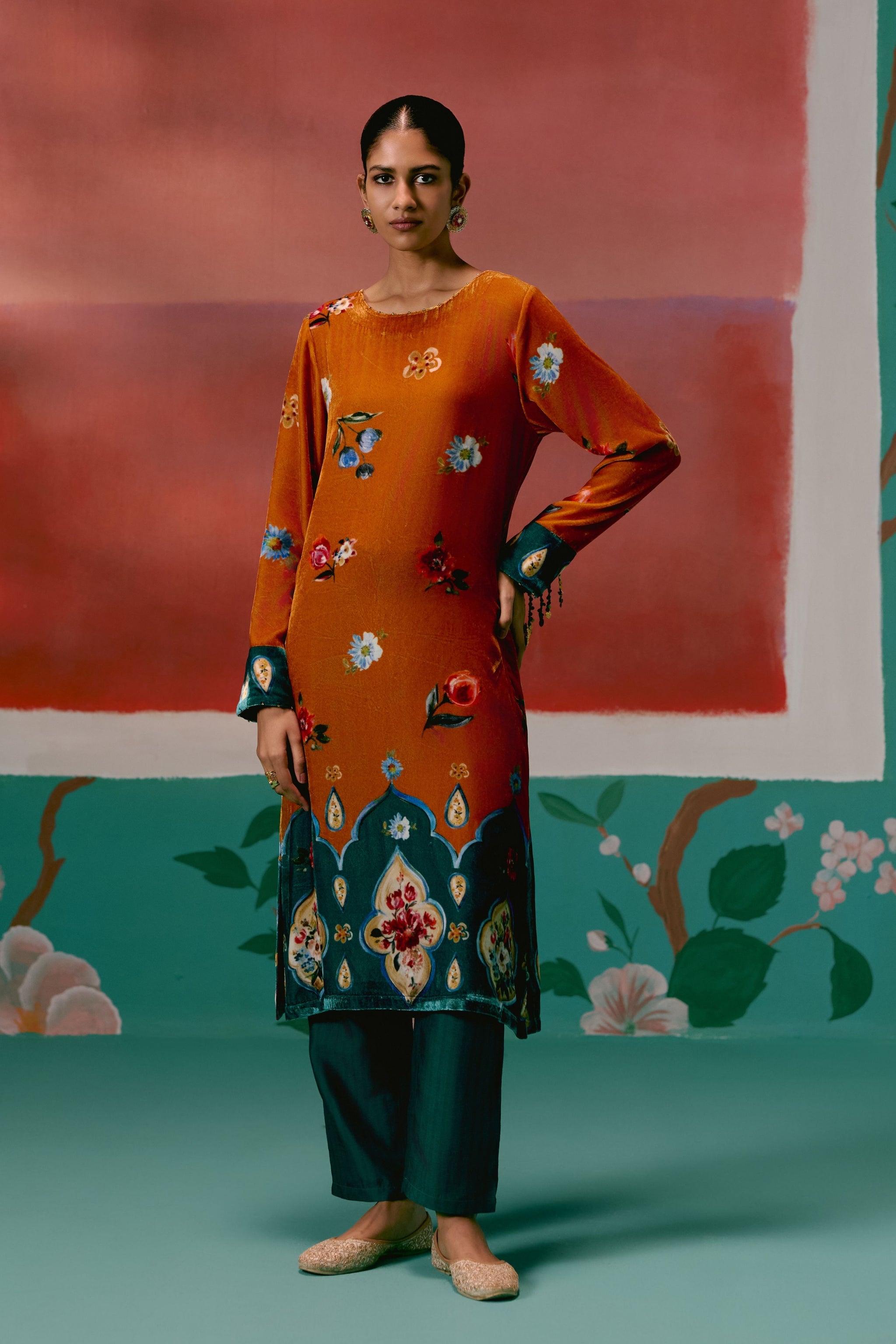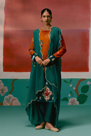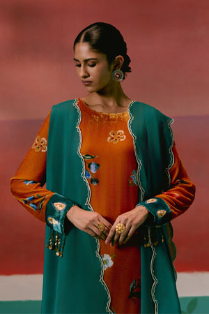 • Rich and regal, this mustard teal floral velvet kurta set exudes festive opulence with hand-embroidered metal coin detailing, tasselled tie-up back, and a sheer organza dupatta. Paired with elasticated straight pants, it perfectly balances grandeur and comfort.