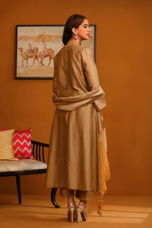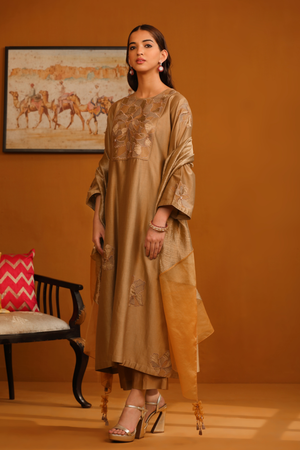 • Featuring our camel brown kurta set with fine embroidery combined with delicate applique patch work around the neck and bootas spread all over the kurta. The a-line flowy silhouette ensures comfort and ease paired with matching trousers and accessorized with a beautiful tonal crushed silk & gold organza dupatta with hangings.