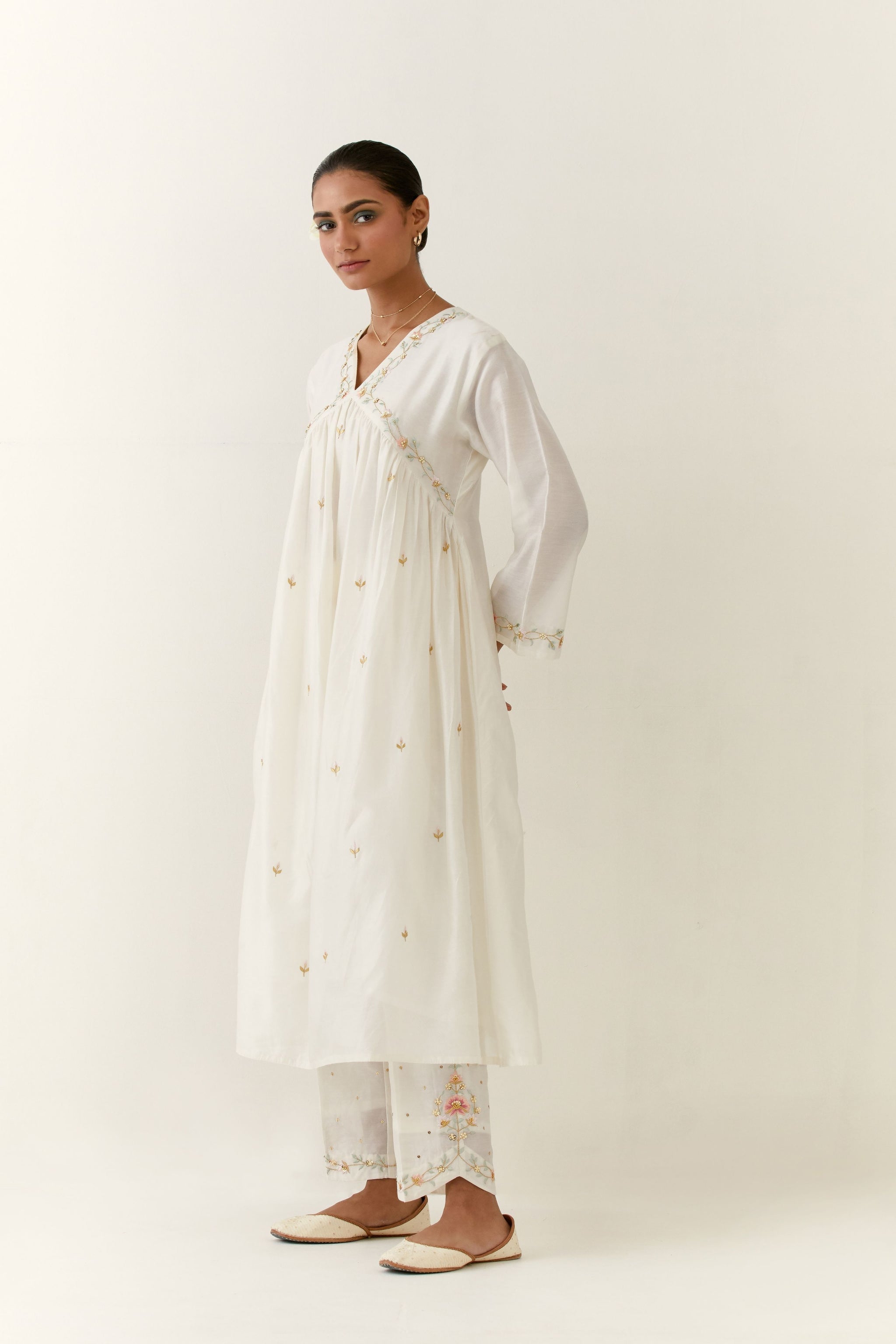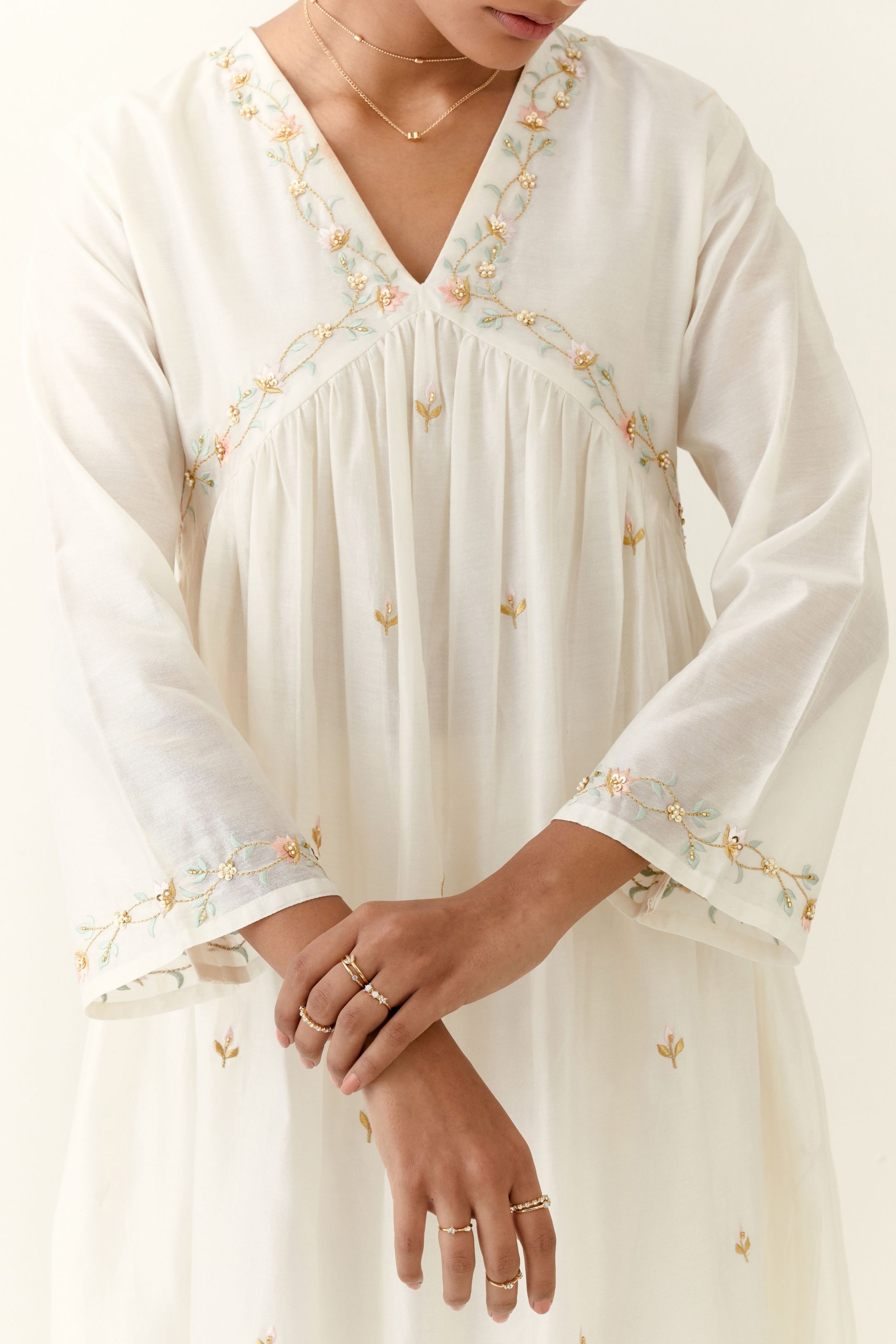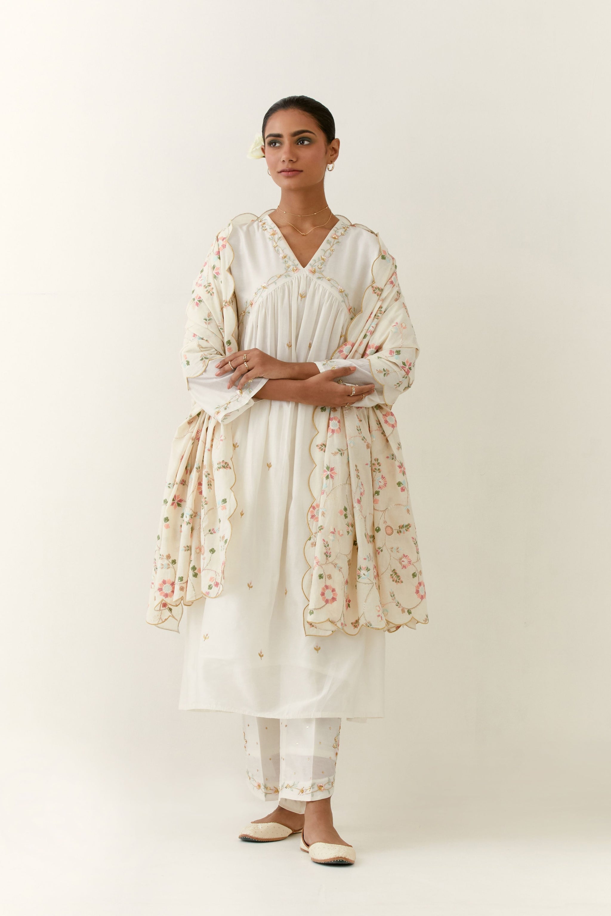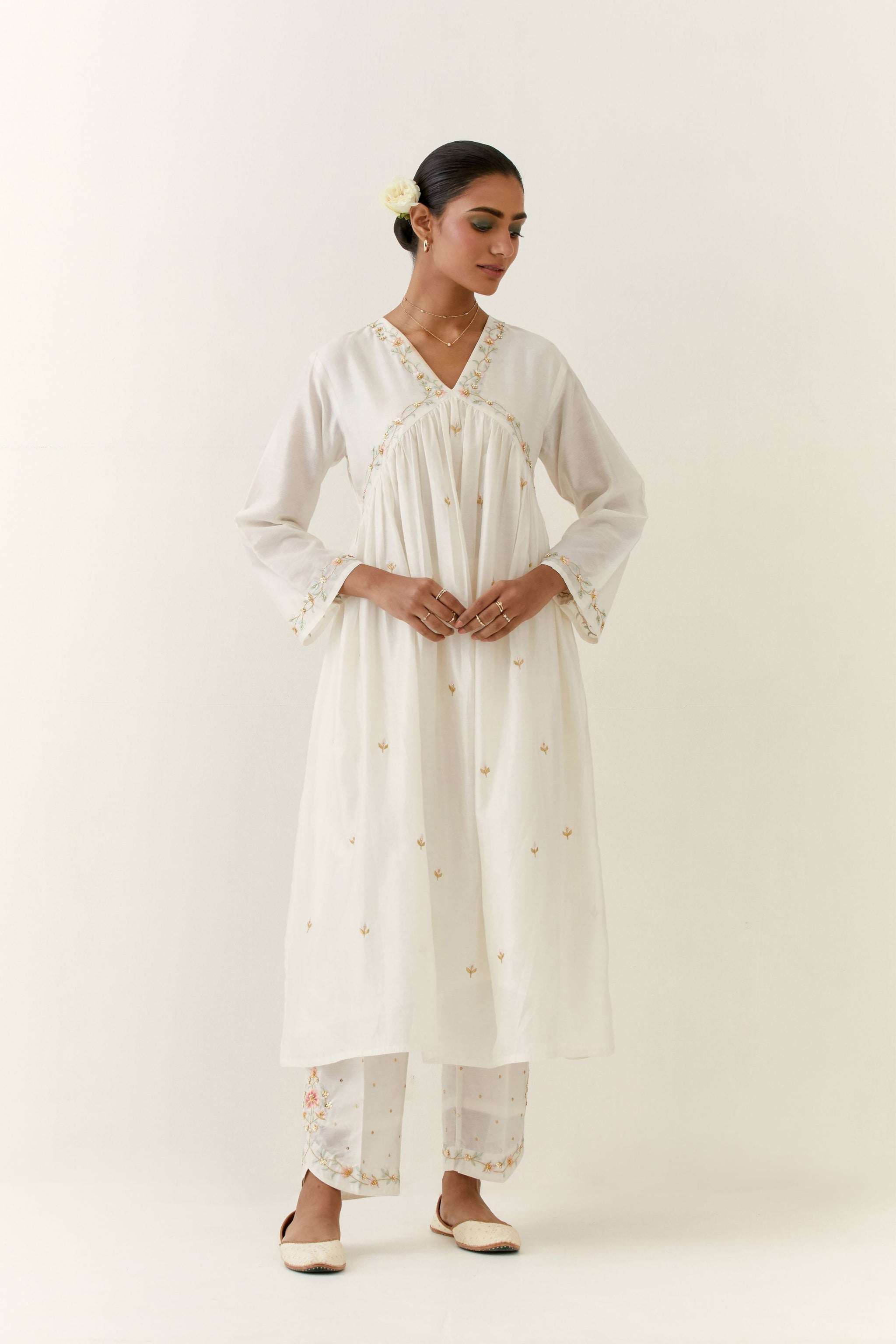 • Off White hand embroidered silk chanderi kurta with gathers on the yoke paired with Off White hand embroidered Palazzo