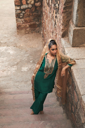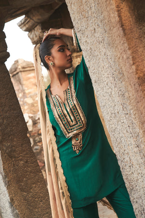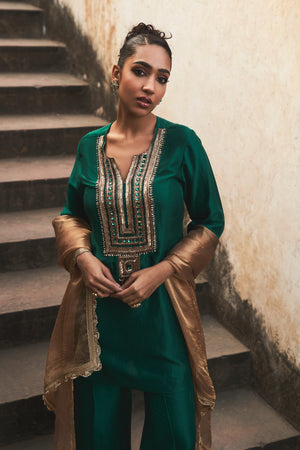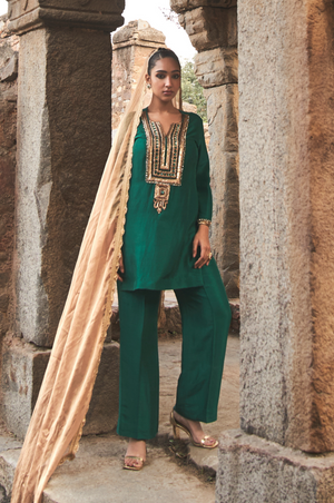 • Sequin and swarvoski stone neckline detailing on silk shirt paired with silk trousers
