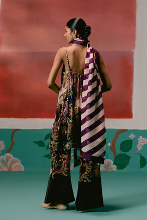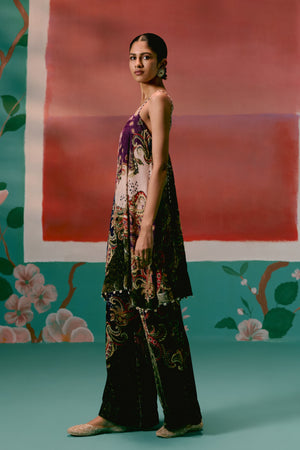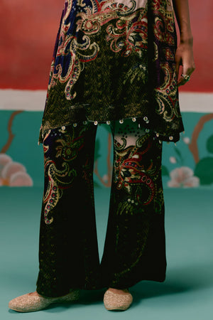 • Striking and contemporary, this olive & purple paisley velvet kurta set features braided silk straps with tassels, a smocked bustier, artisanal hem hangings, bell-bottom pants, and a printed organza dupatta, perfect for a bold festive statement.