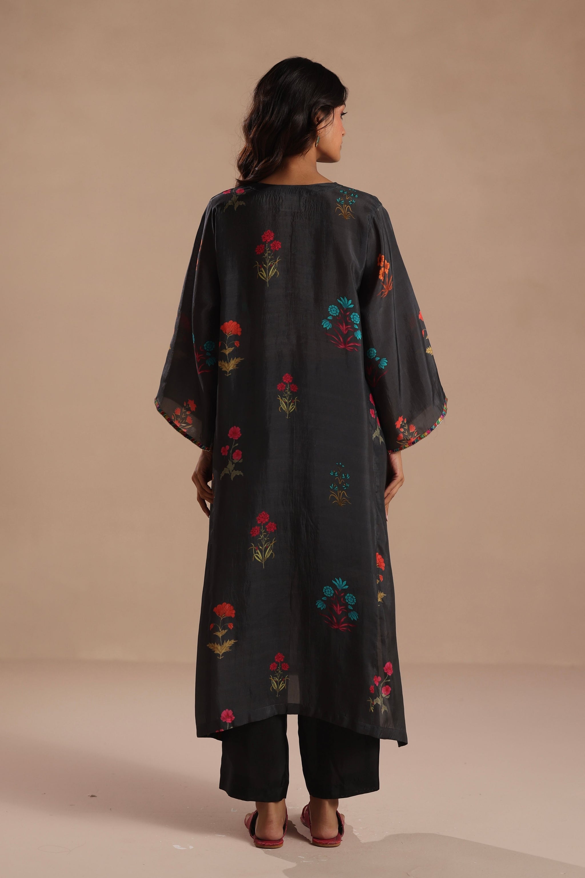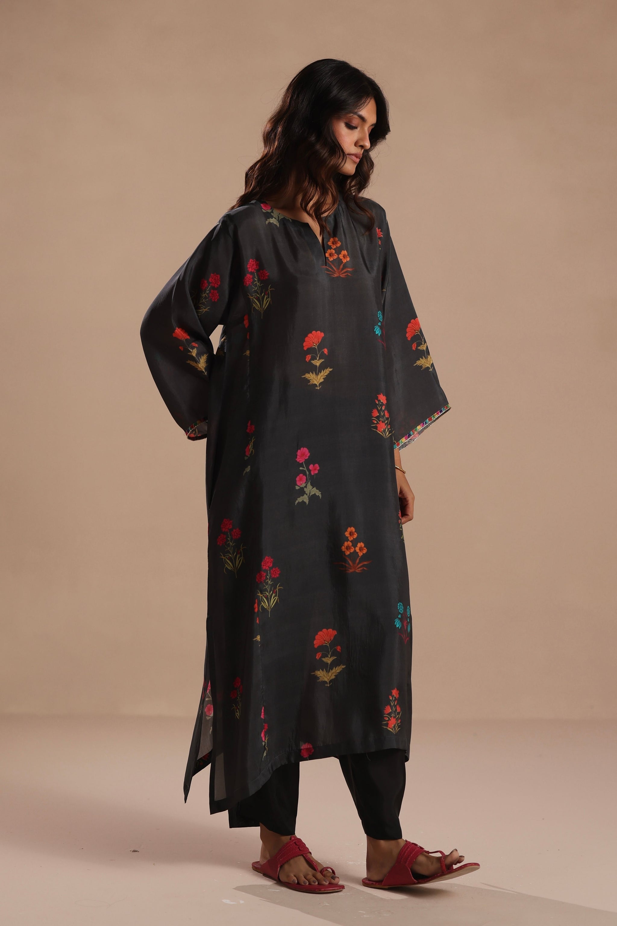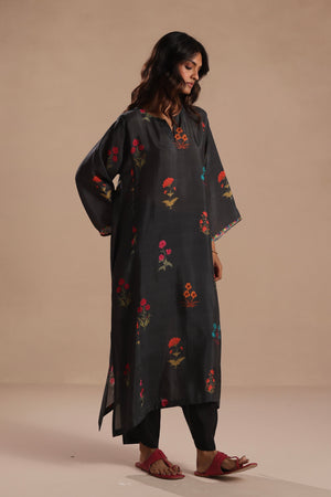 • A charcoal habutai silk kurta set with watercolor multicolored floral motifs, v-neckline, and three-fourth sleeves. Paired with straight-fit charcoal pants. The kurta length-46" and the pant length-36"